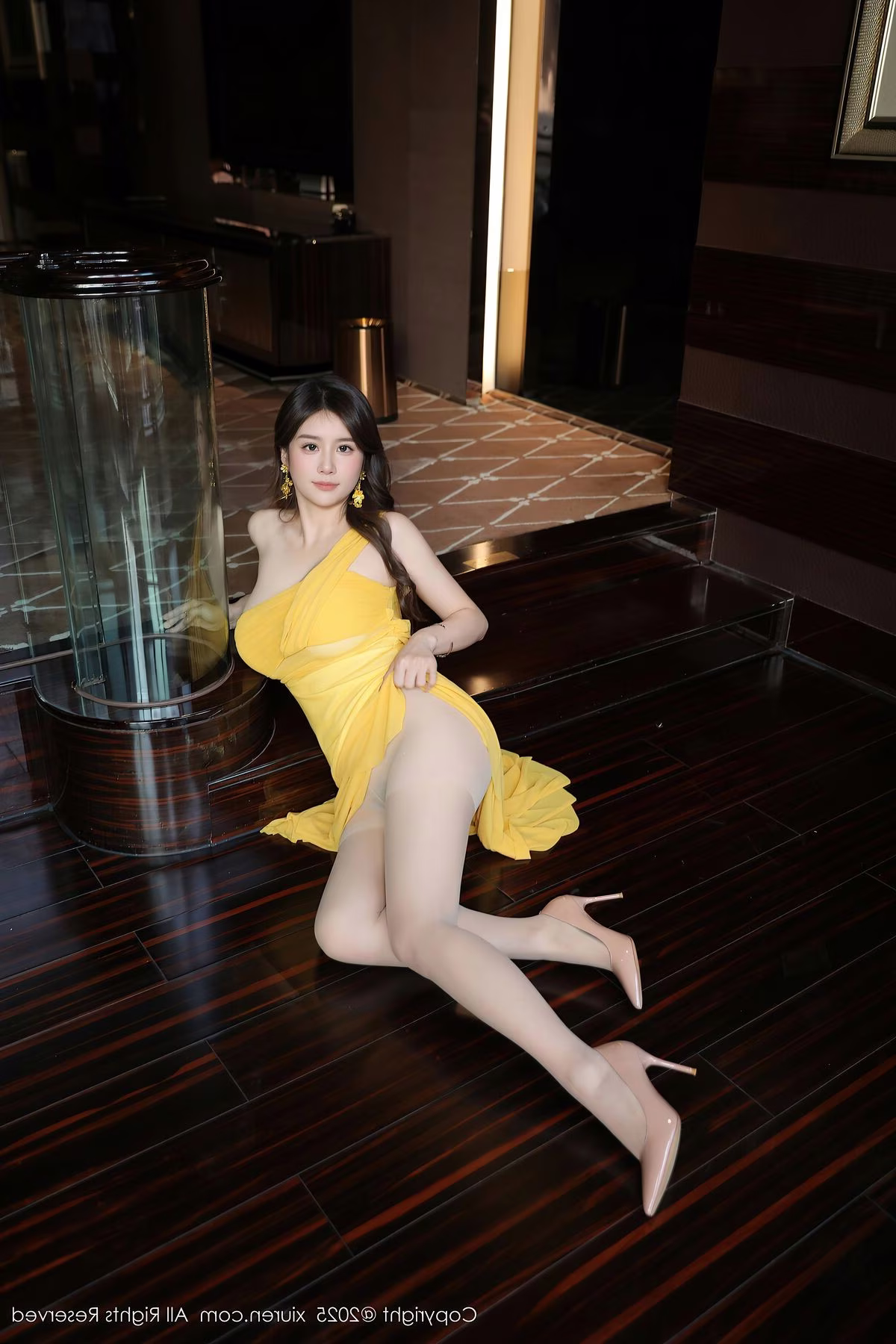 Explore the captivating beauty of Xiao Rou Rou Mi in the exclusive XiuRen No.10403 collection. The model radiates with an air of elegant confidence and alluring style, dressed in a vibrant yellow gown. The exquisite design of the attire not only accentuates her perfect figure but also subtly conveys a graceful sensuality. Her kneeling pose on the polished wooden floor, combined with her mesmerizing gaze, creates a dynamic and profound image. The luxurious surroundings further highlight Xiao Rou Rou Mi's sophisticated charm and irresistible appeal, offering an impressive visual experience that harmoniously blends physical beauty with artistic posing.