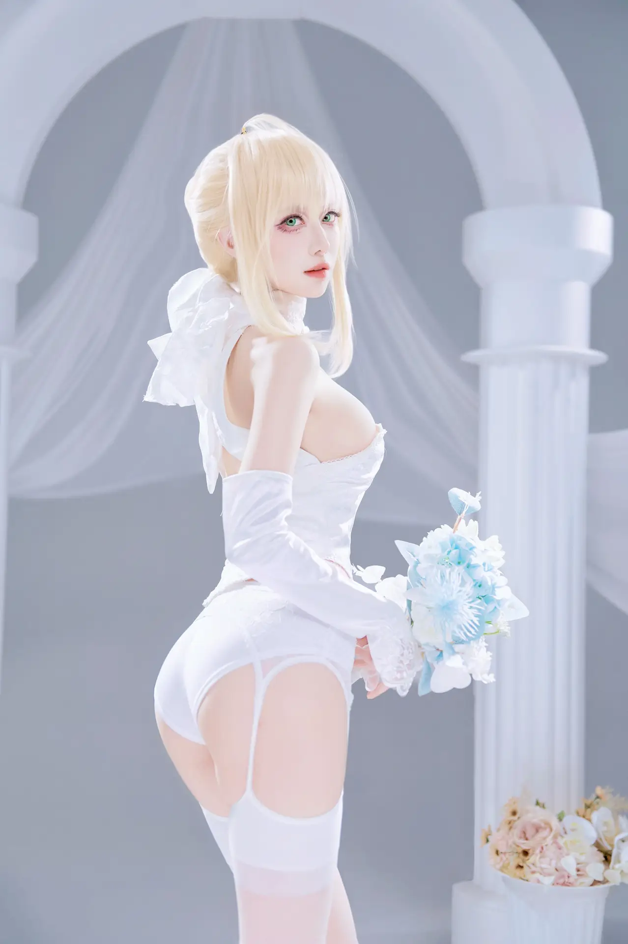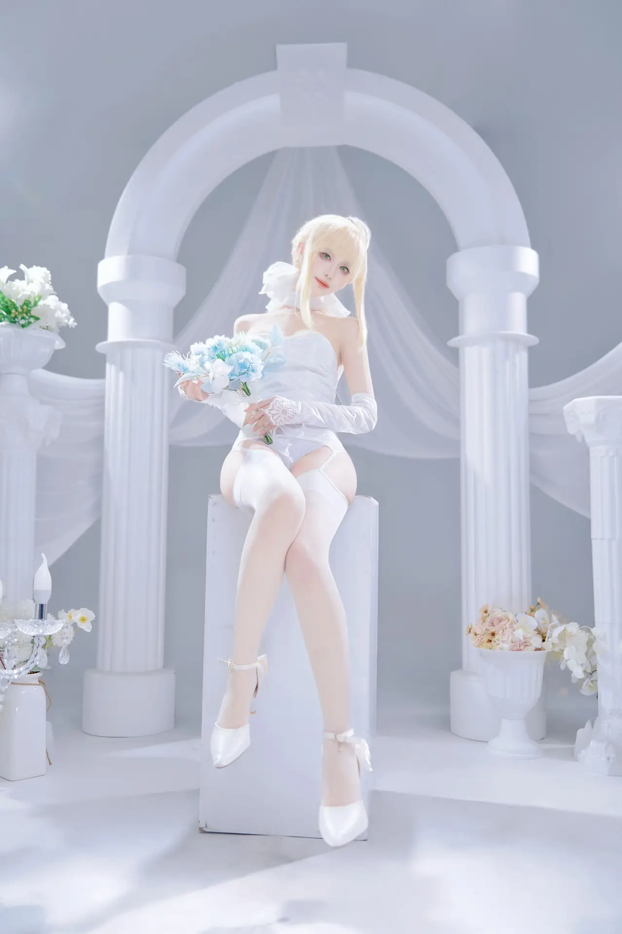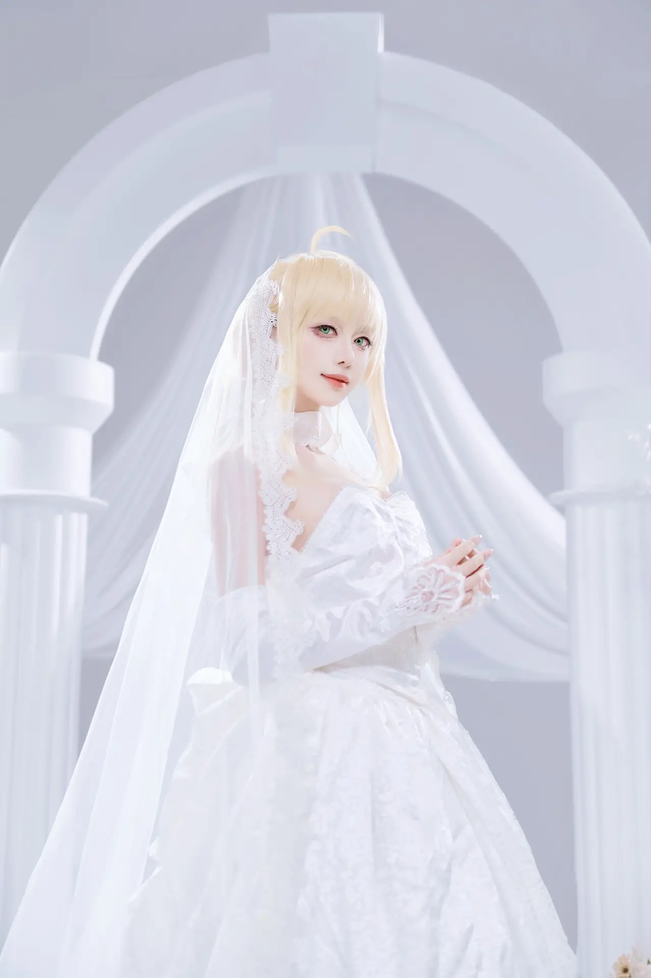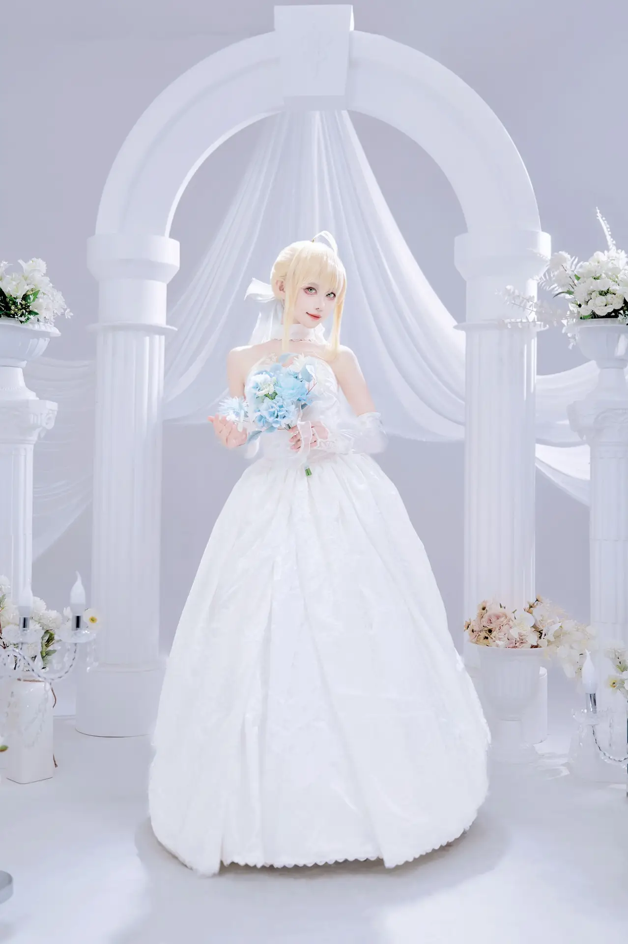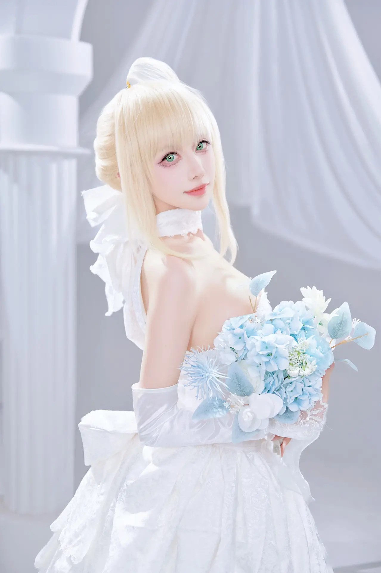 Marvel at the magnificent beauty of Shika XiaoLuLu in her FGO Saber Bride cosplay. Saber appears pristine and elegant in her flowing white wedding dress, every detail meticulously crafted from the soft lace to the graceful folds. With her golden blonde hair and captivating eyes, Shika XiaoLuLu perfectly recreates the image of Saber in her bridal attire, exuding an aura both regal and gentle. The delicate blue and white wedding bouquet in her hand further highlights the character's pure and innocent charm. The ethereal white background enhances her otherworldly beauty, transforming the photograph into a mesmerizing work of art that captivates viewers, making it impossible to look away from this muse from the game world.#FGO #SaberBride #Cosplay #ShikaXiaoLuLu #WeddingDress