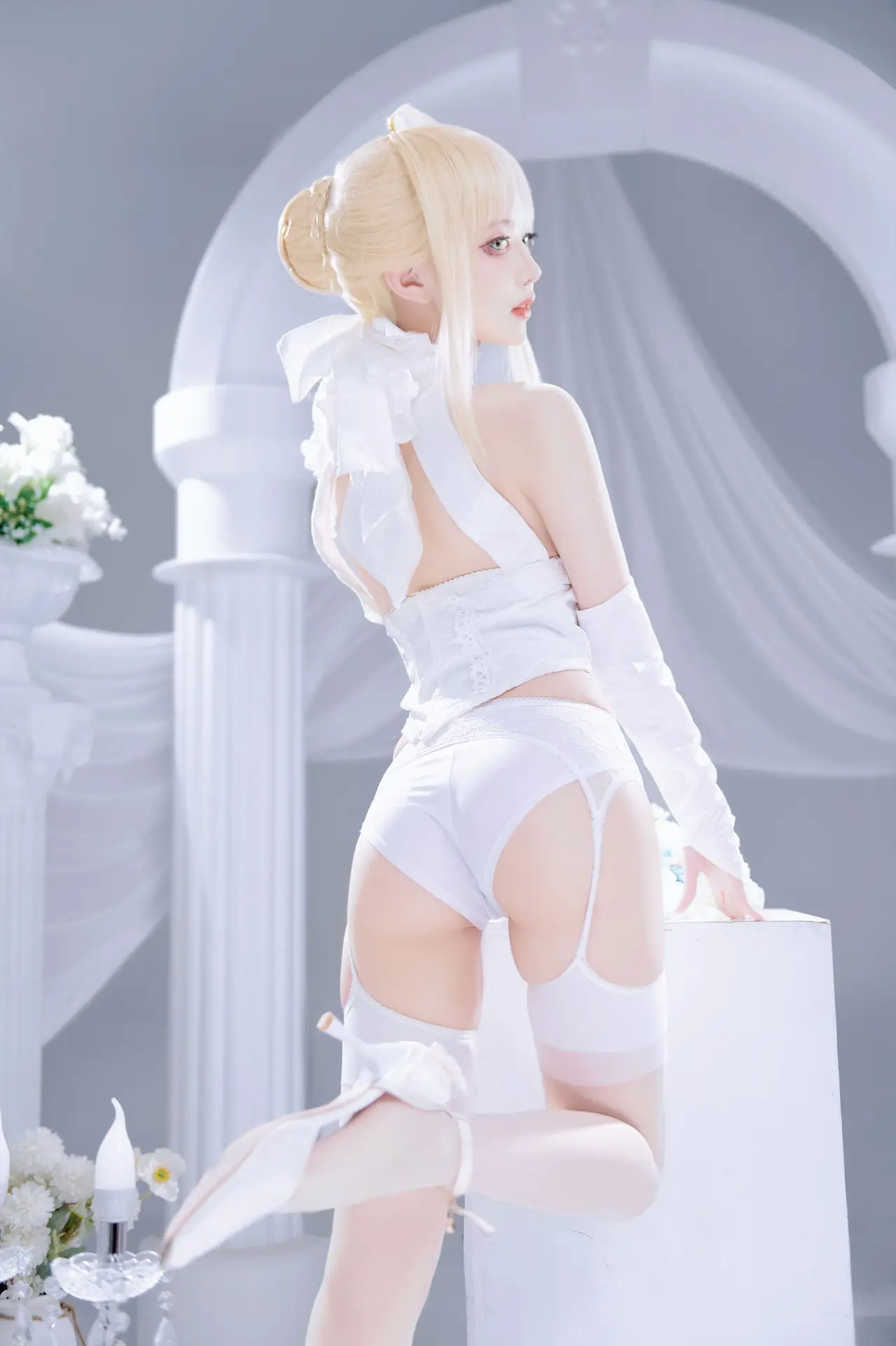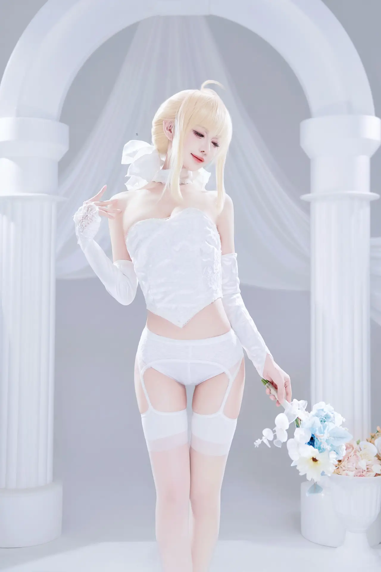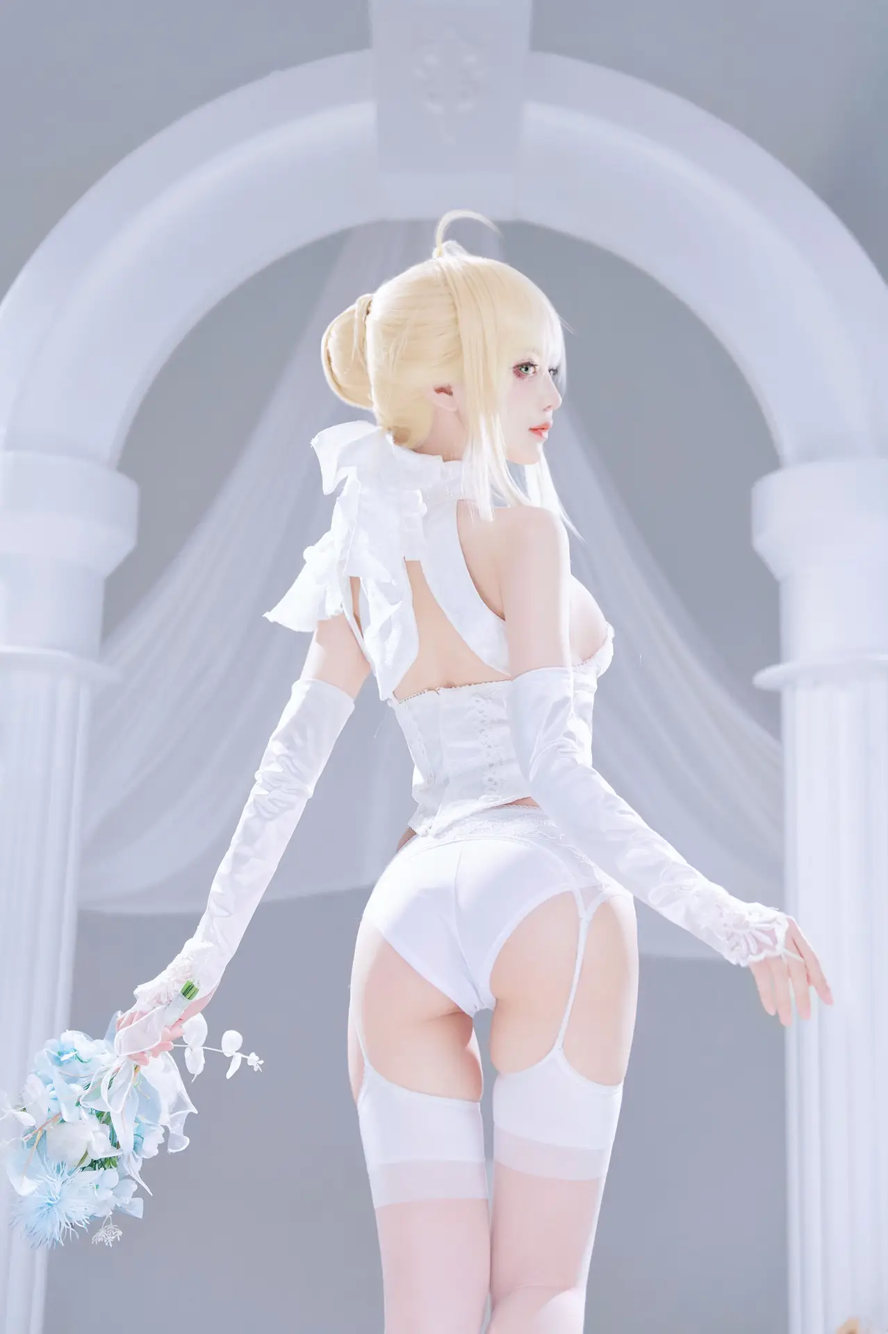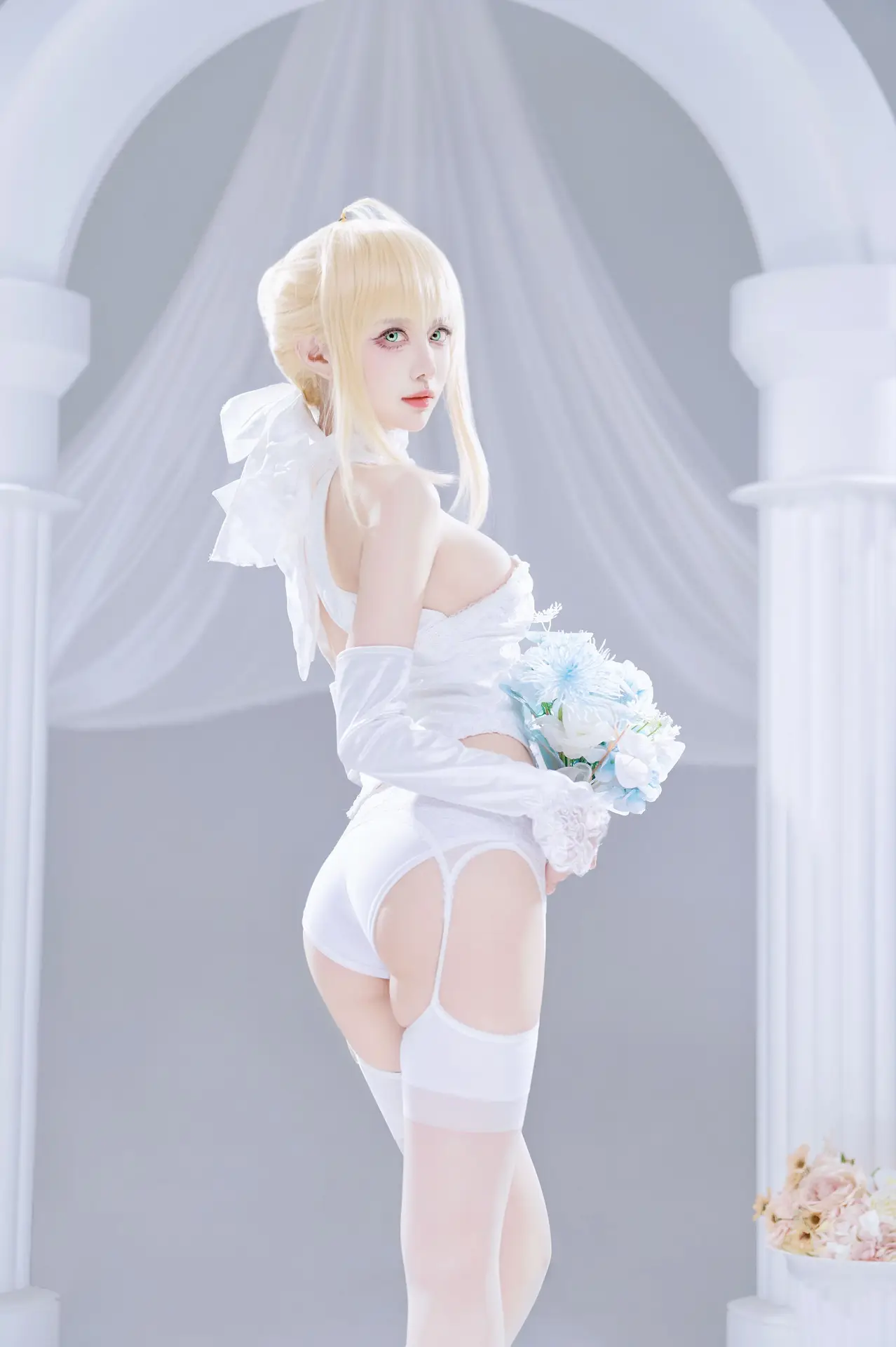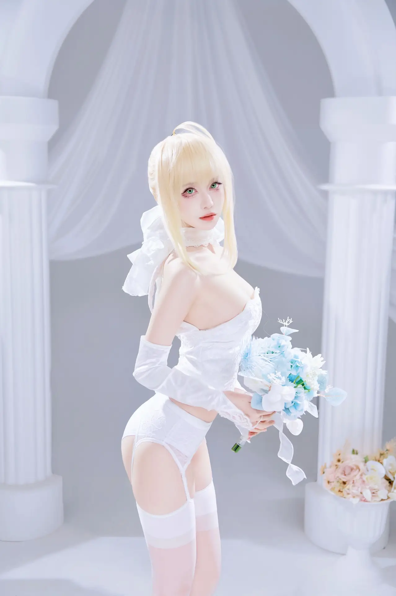 Marvel at the magnificent beauty of Shika XiaoLuLu in her FGO Saber Bride cosplay. Saber appears pristine and elegant in her flowing white wedding dress, every detail meticulously crafted from the soft lace to the graceful folds. With her golden blonde hair and captivating eyes, Shika XiaoLuLu perfectly recreates the image of Saber in her bridal attire, exuding an aura both regal and gentle. The delicate blue and white wedding bouquet in her hand further highlights the character's pure and innocent charm. The ethereal white background enhances her otherworldly beauty, transforming the photograph into a mesmerizing work of art that captivates viewers, making it impossible to look away from this muse from the game world.#FGO #SaberBride #Cosplay #ShikaXiaoLuLu #WeddingDress