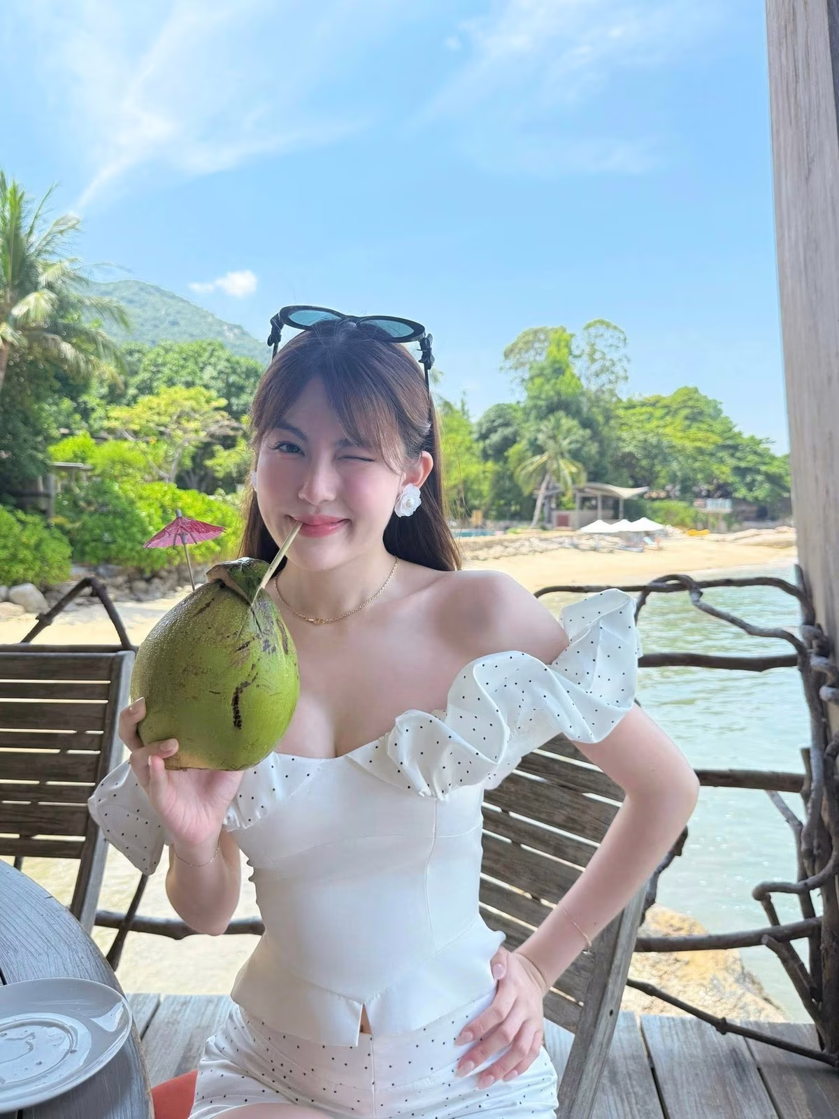 In this captivating photo, hot girl Tăng Mỹ Hàn shines with her sweet beauty and alluring 'Saigon socialite' style. She wears an elegant white off-shoulder dress, a refined design that enhances her gentle yet charming appeal. The dress not only highlights her balanced physique but also showcases Tăng Mỹ Hàn's exquisite fashion sense. With a radiant smile and playful wink, this hot girl presents a youthful, dynamic image while maintaining her characteristic grace. The backdrop of the blue sea and white sand further amplifies the fresh, free-spirited vibe of the moment, affirming her signature Saigon socialite style wherever she goes.
