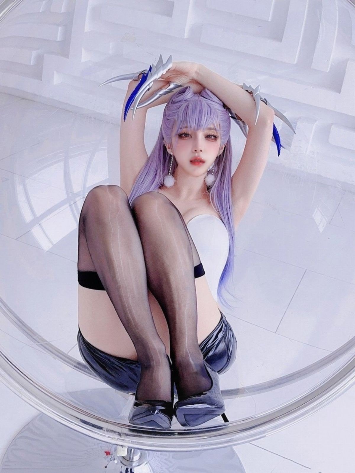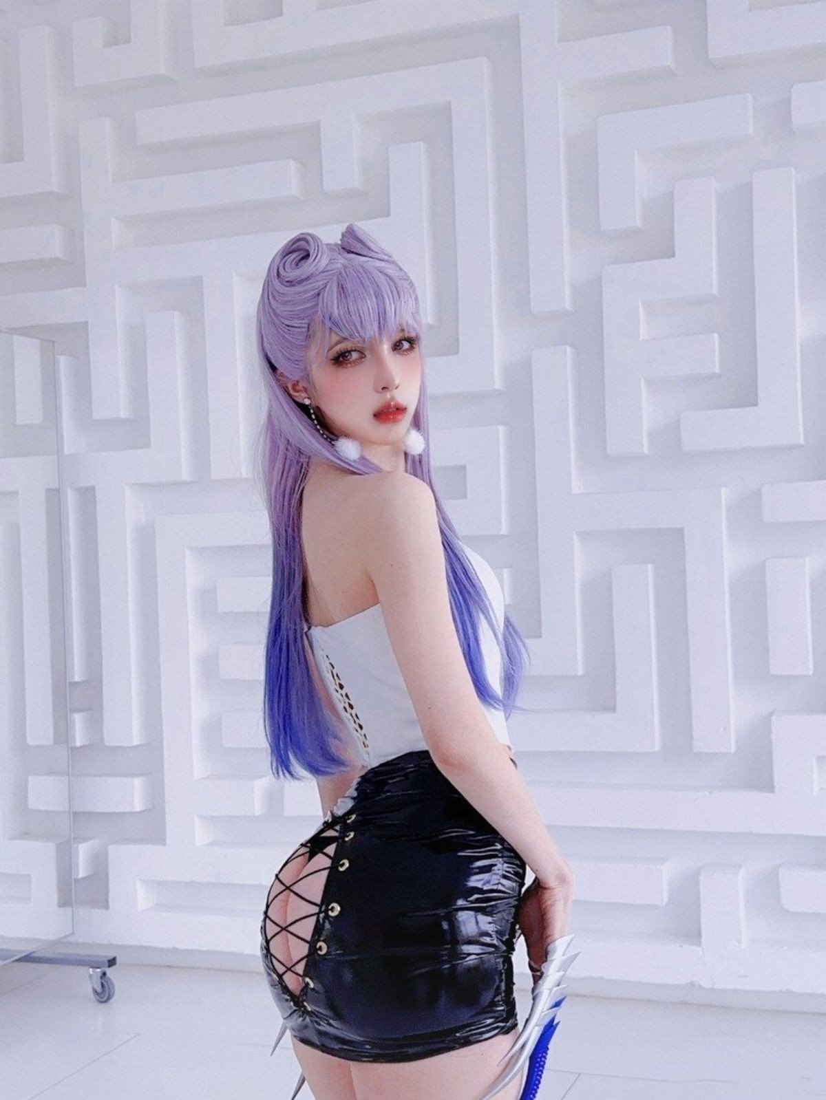 Coser Bao Zou Li Yu Wang shines brightly in this captivating shot, part of her 12月合集 Part11 collection. Her flowing purple hair and striking makeup perfectly complement the elegant white strapless top and the daring black leather mini skirt. The skirt features intricate lacing details on the side, accentuating her graceful figure and adding a touch of edgy sophistication. Posing confidently against a minimalist white background adorned with a unique maze-like pattern, she exudes a powerful yet alluring aura. This image showcases her exceptional ability to embody diverse characters, making her a standout figure in the cosplay world.