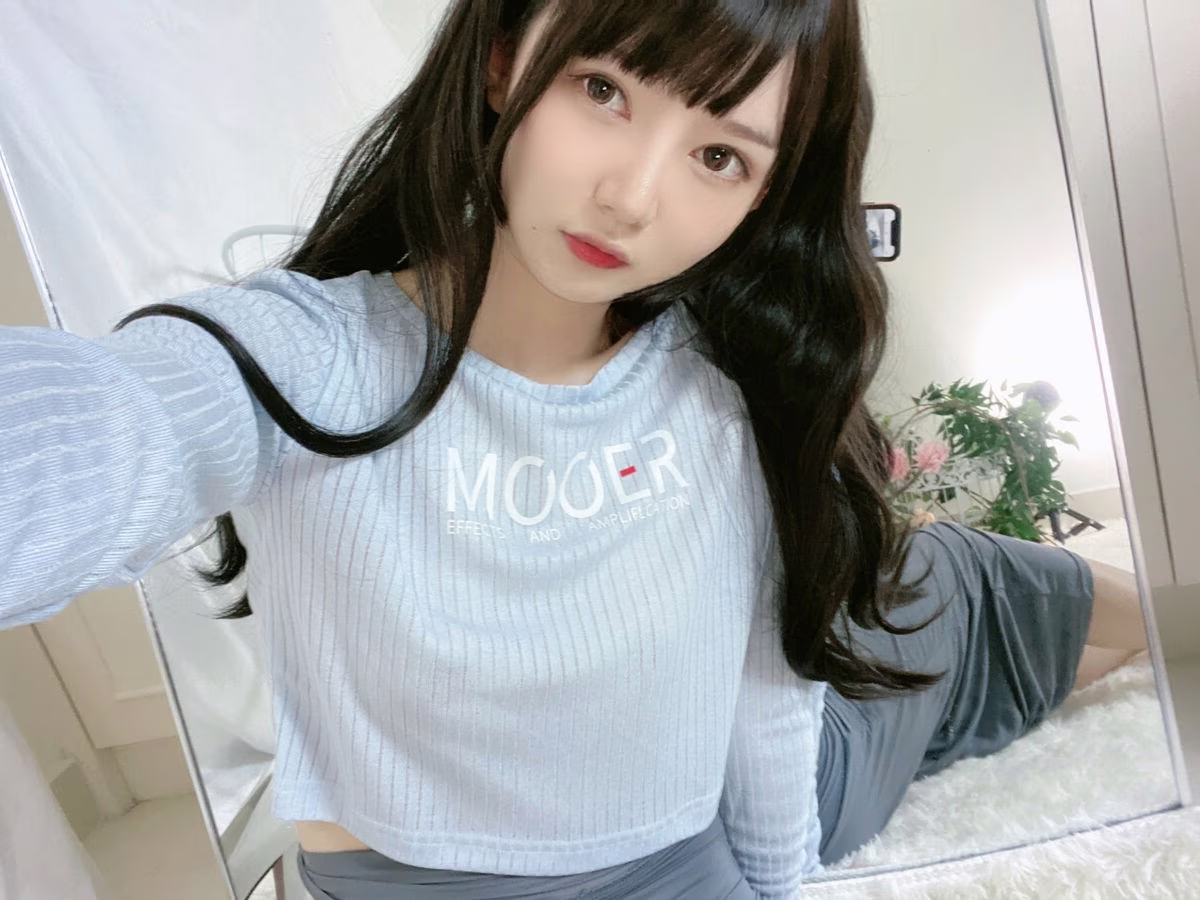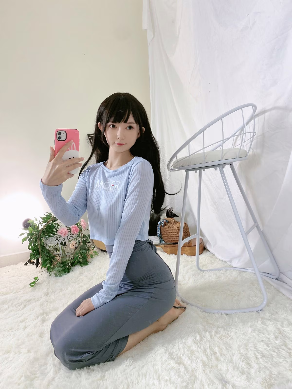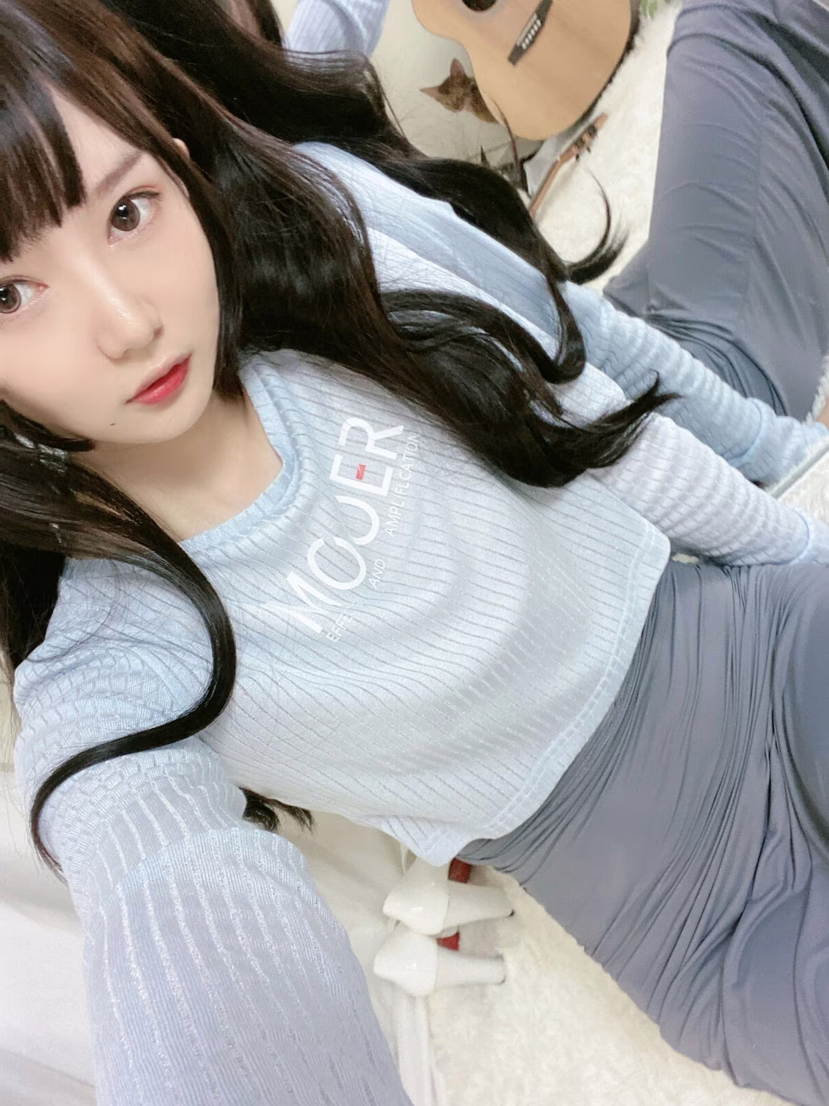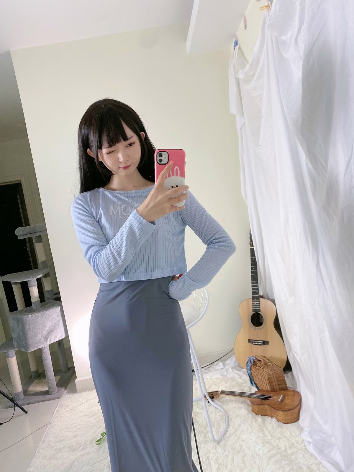 This captivating image showcases Coser 51 Jiang, affectionately known as 'Guitar Sister' (吉他妹妹), in a charming selfie moment. She confidently poses, radiating natural beauty and an engaging aura. With her long dark hair and a simple yet chic outfit—a light blue crop top paired with a form-fitting grey skirt—51 Jiang subtly highlights her slender figure. In the background, a familiar acoustic guitar stands, serving as a testament to her profound passion for music. This picture not only captures Coser 51 Jiang's graceful demeanor but also evokes an artistic and free-spirited lifestyle. She embodies modern beauty, blending youthful energy with an artist's soul.XVG No.51: Discover the Rustic, Alluring Vietnamese Beauty Amidst a Peaceful Countryside