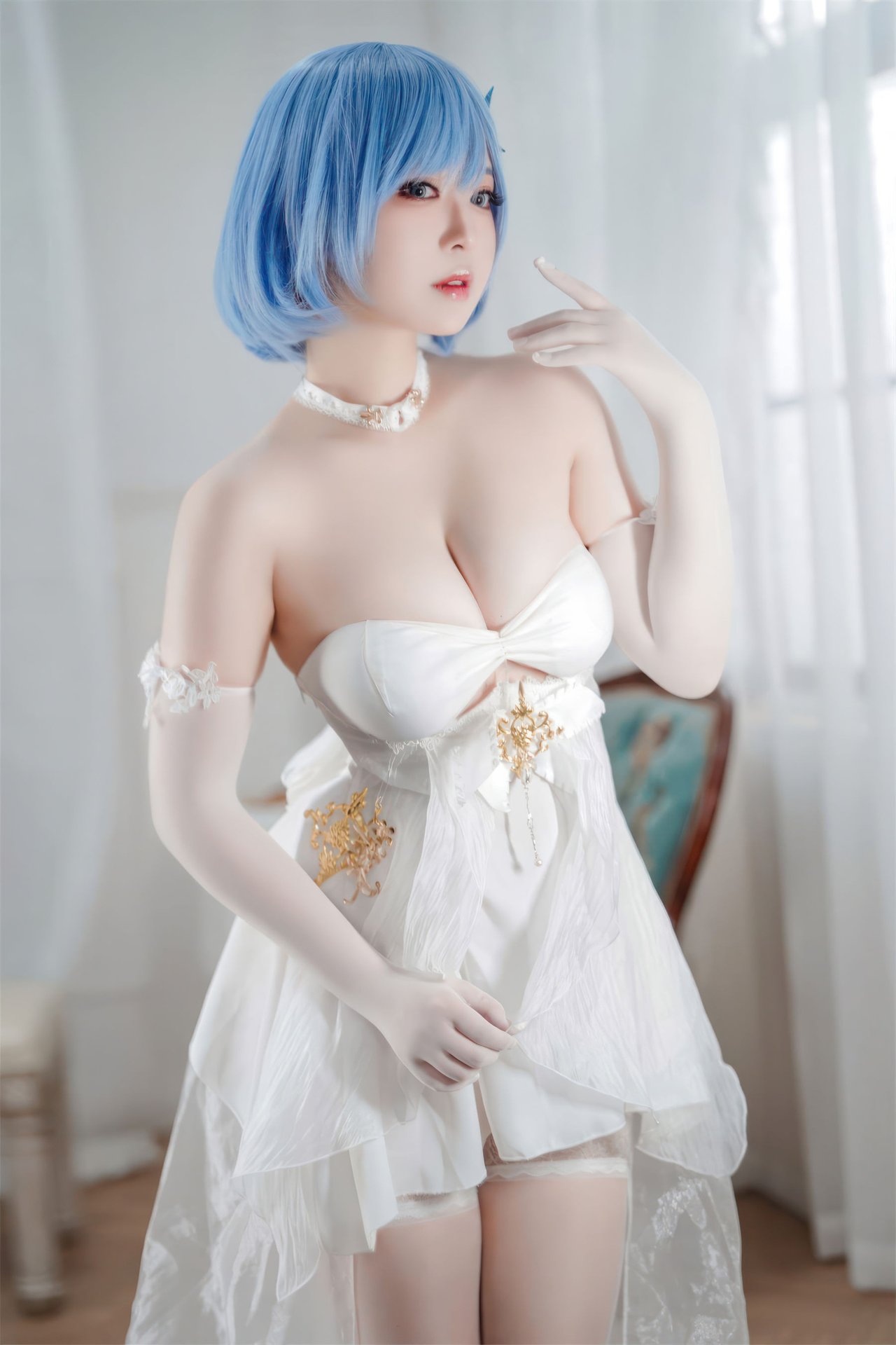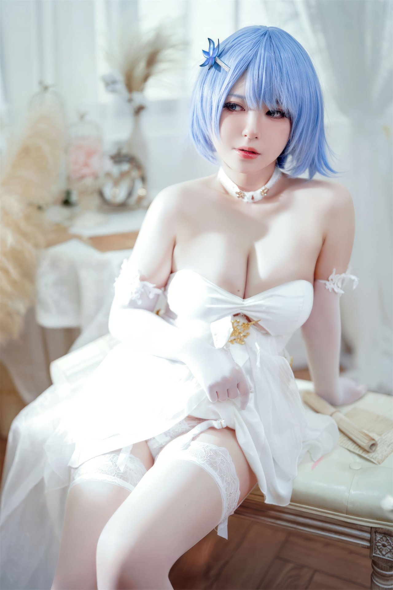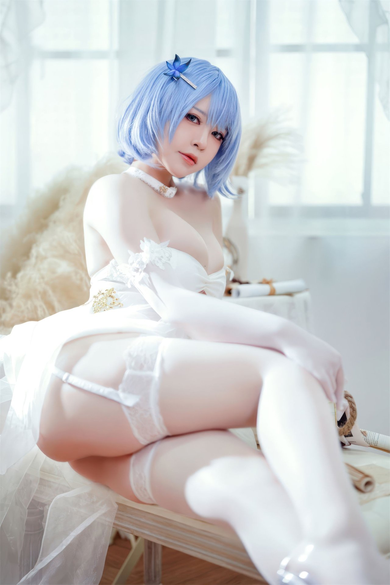 This stunning image showcases a magnificent cosplay of Chapaev from the popular game Azur Lane brought to life by cosplayer Banbanzi she embodies the character in the exquisite White Rider's Melody Dress a pristine white gown exuding elegance and grace her signature blue hair and captivating eyes perfectly capture Chapaevs essence Banbanzis fair skin further enhances the delicate beauty of the outfit delivering an impressive and emotional visual experience for Azur Lane fans and the wider cosplay community a truly captivating portrayal