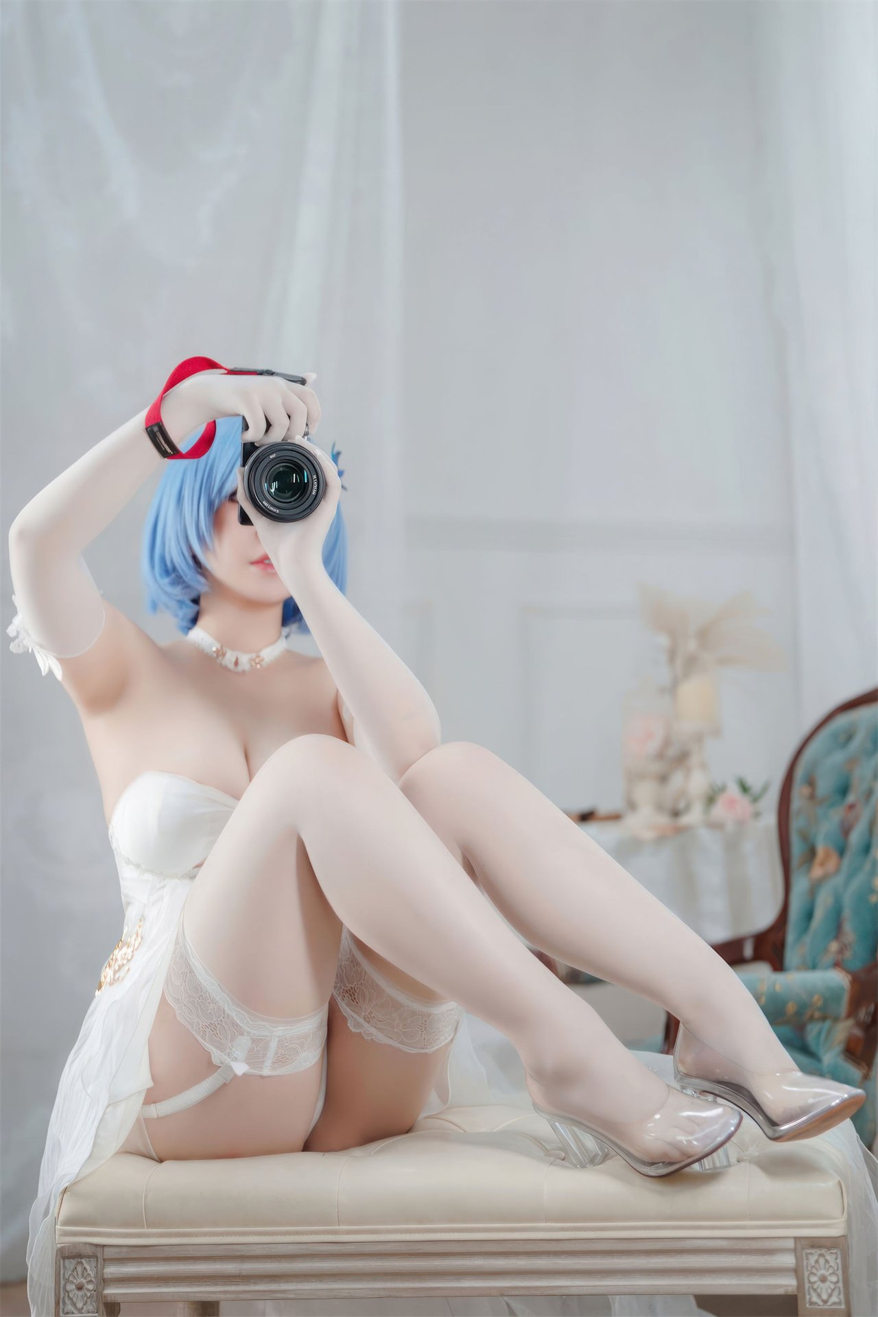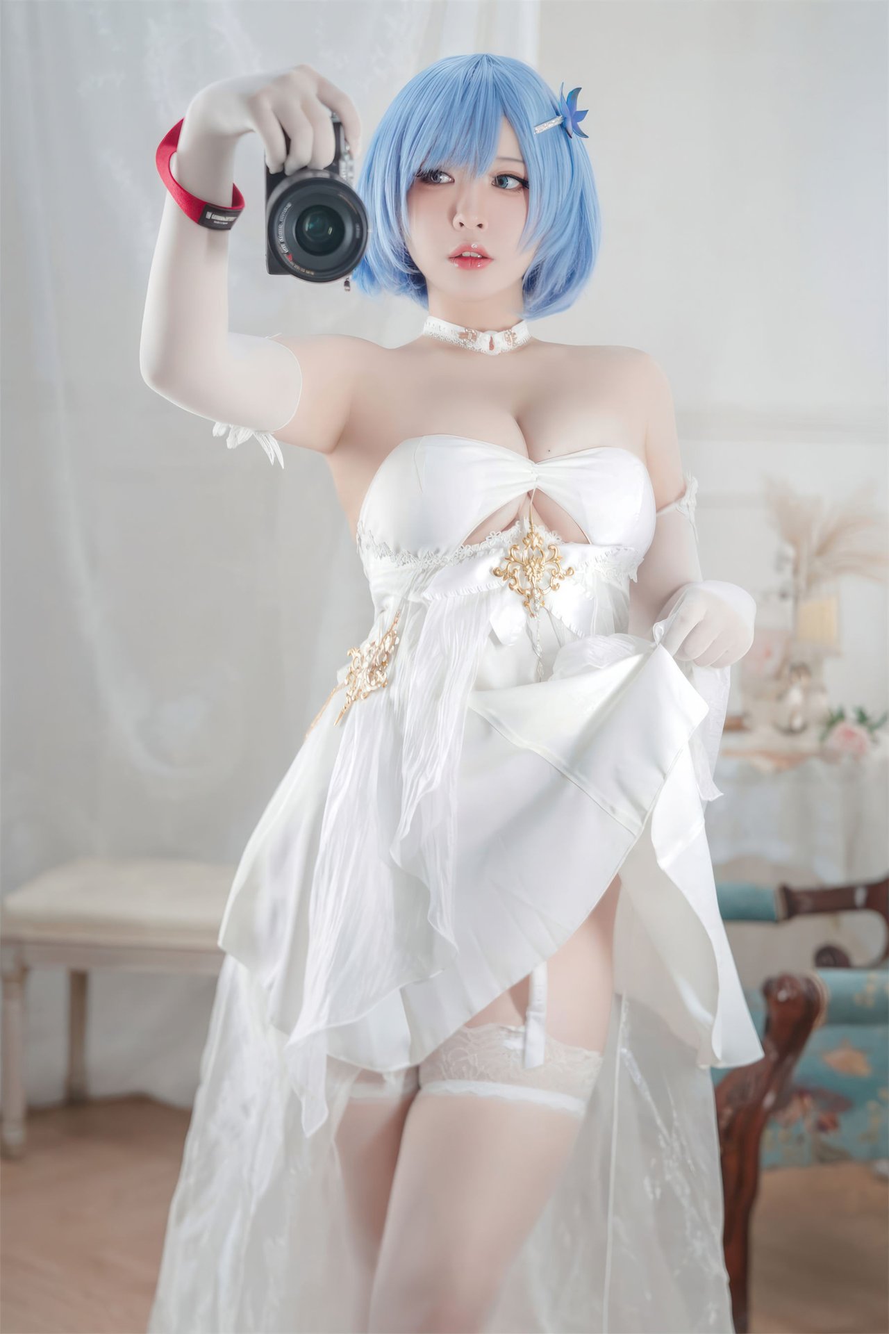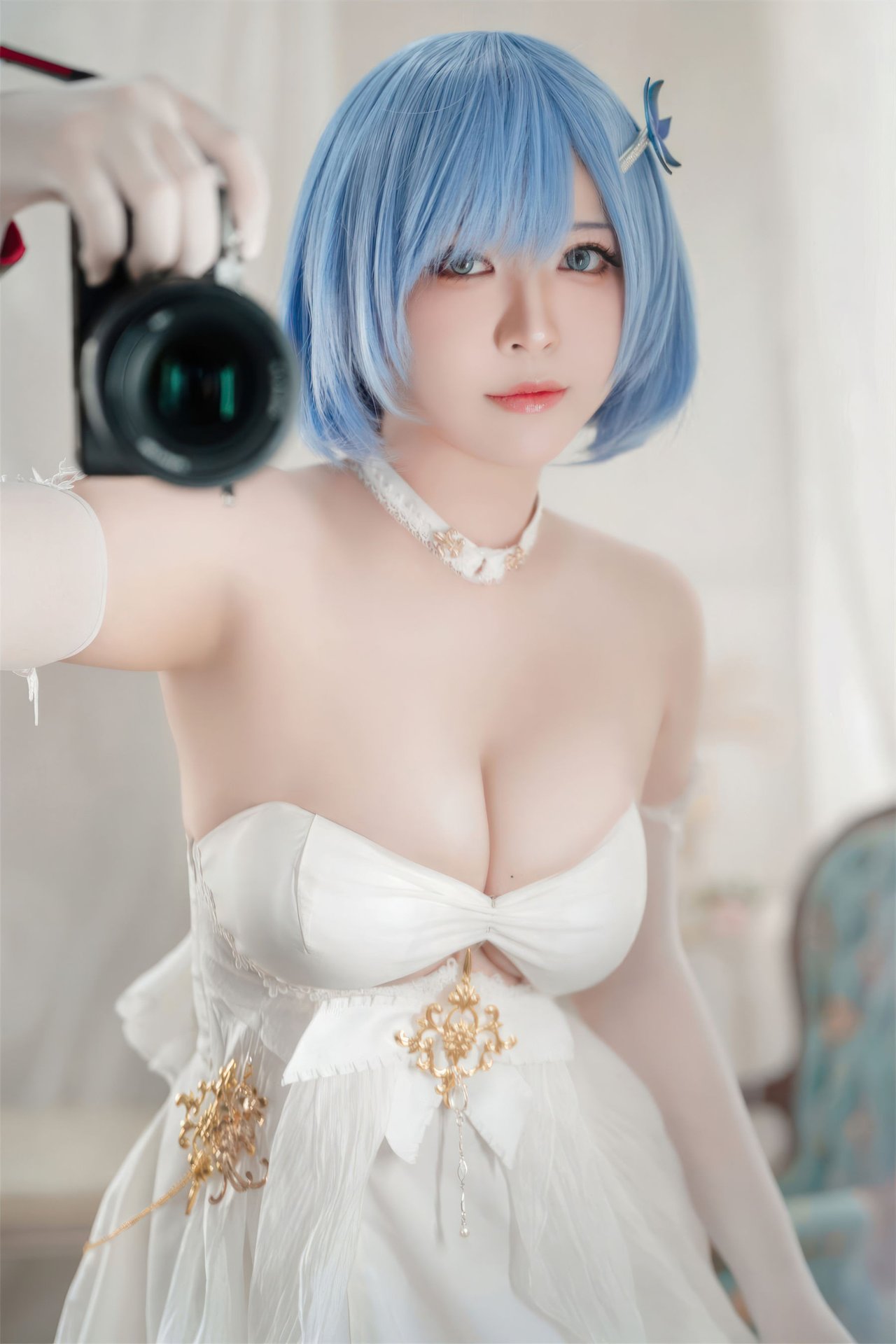 This stunning image showcases a magnificent cosplay of Chapaev from the popular game Azur Lane brought to life by cosplayer Banbanzi she embodies the character in the exquisite White Rider's Melody Dress a pristine white gown exuding elegance and grace her signature blue hair and captivating eyes perfectly capture Chapaevs essence Banbanzis fair skin further enhances the delicate beauty of the outfit delivering an impressive and emotional visual experience for Azur Lane fans and the wider cosplay community a truly captivating portrayal