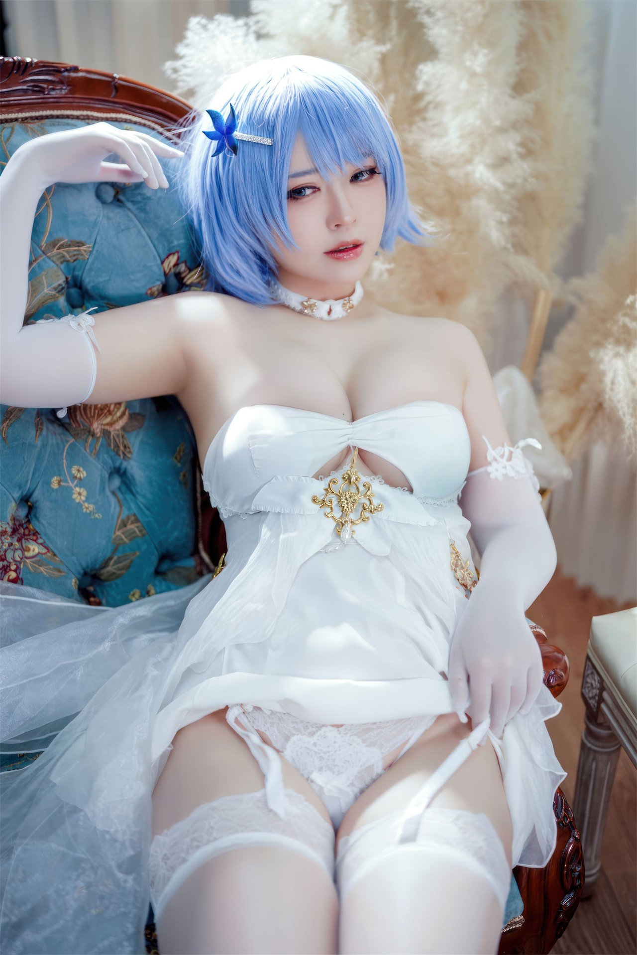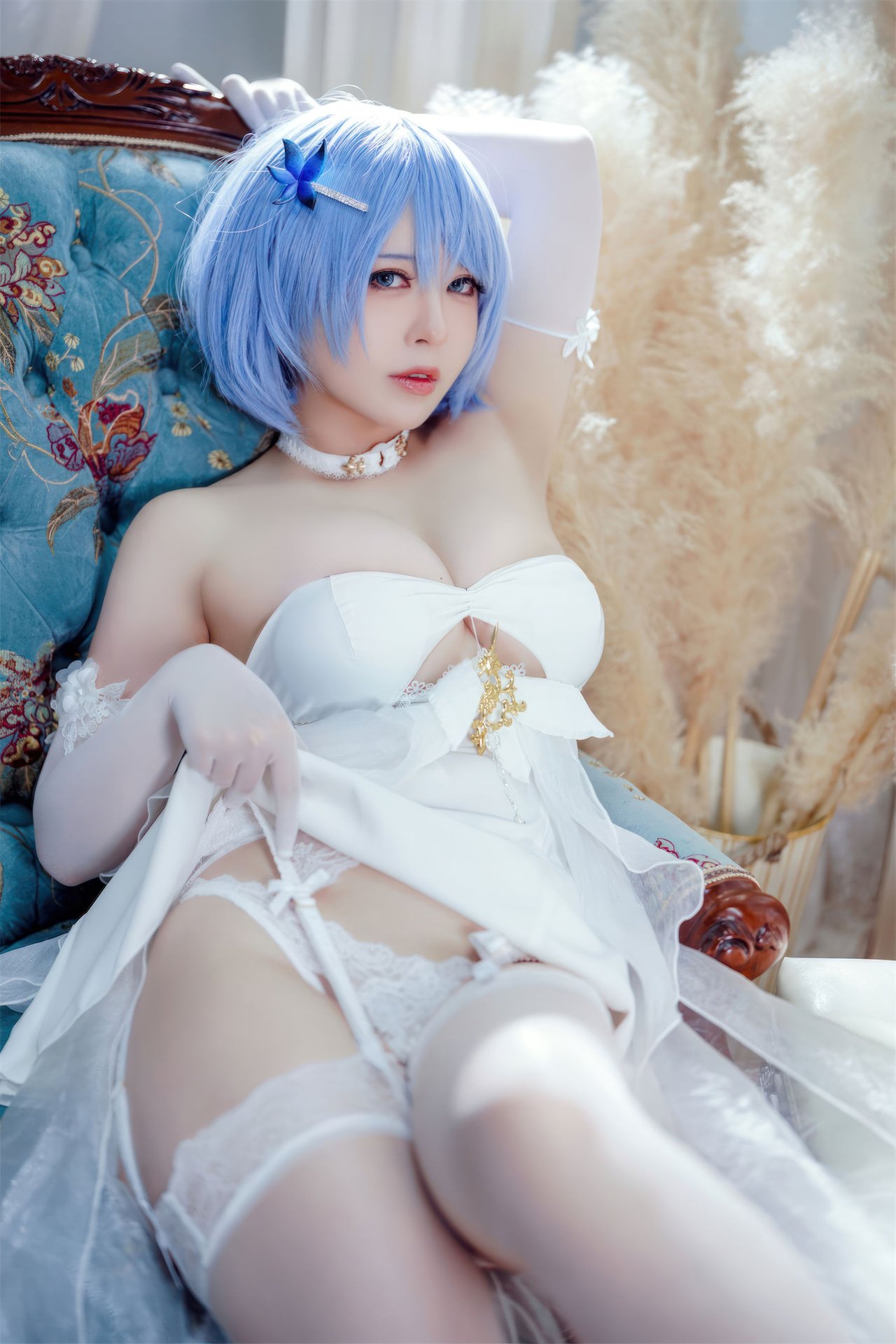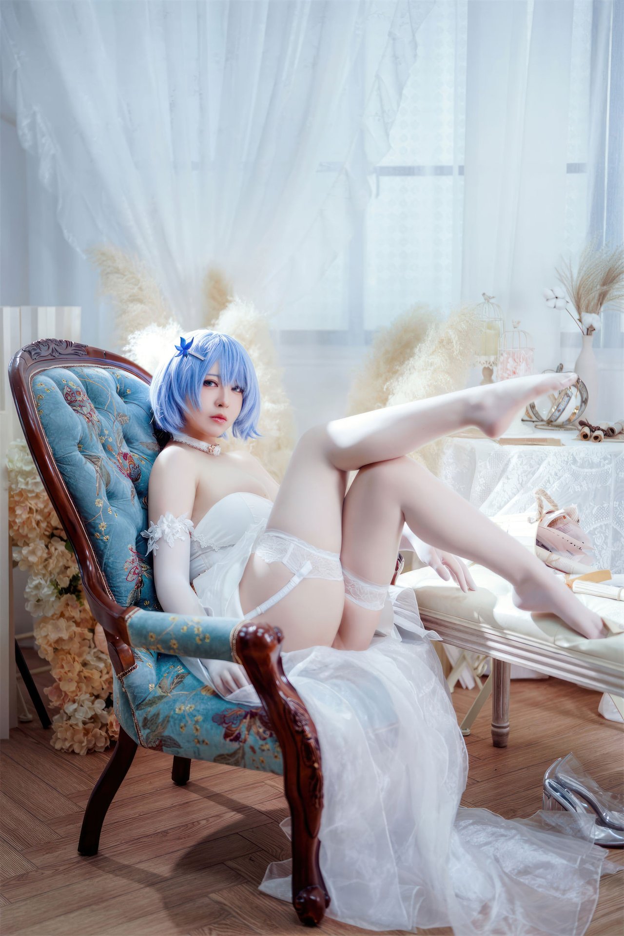 This stunning image captures Coser AzuNyan transforming into a gentle and ethereal fairy She dons a pure white dress with intricate ruffles highlighting her delicate and pristine beauty Her soft blue-purple hair flowing gracefully along with a subtle halo-like accessory enhances her mystical aura as if she were an angel wandering in a dreamy realm AzuNyans gentle smile exudes grace and captivates viewers into a fairytale world This exquisite portrayal is part of her special June 2025 collection showcasing her meticulous dedication to each intricate costume and character design