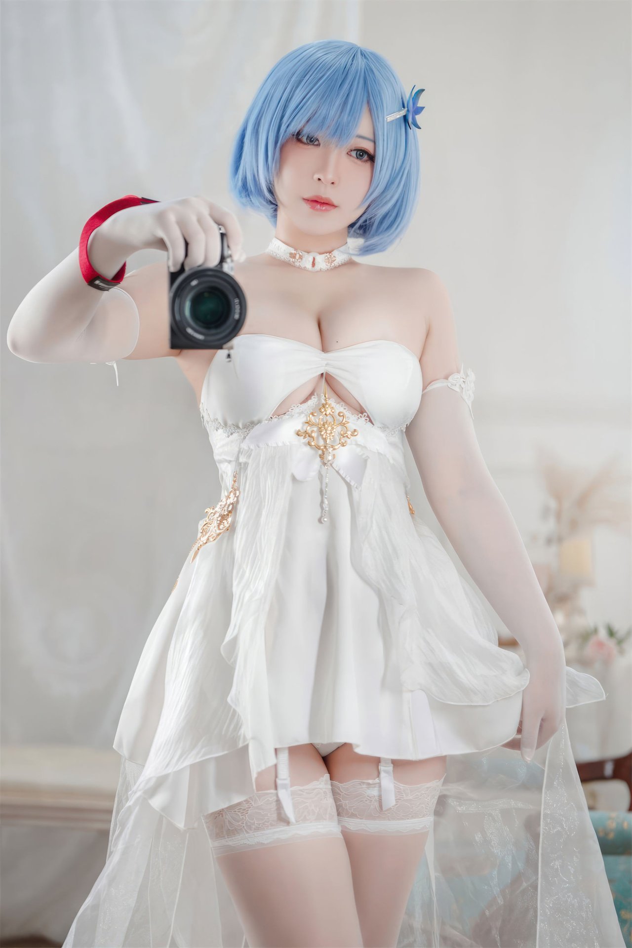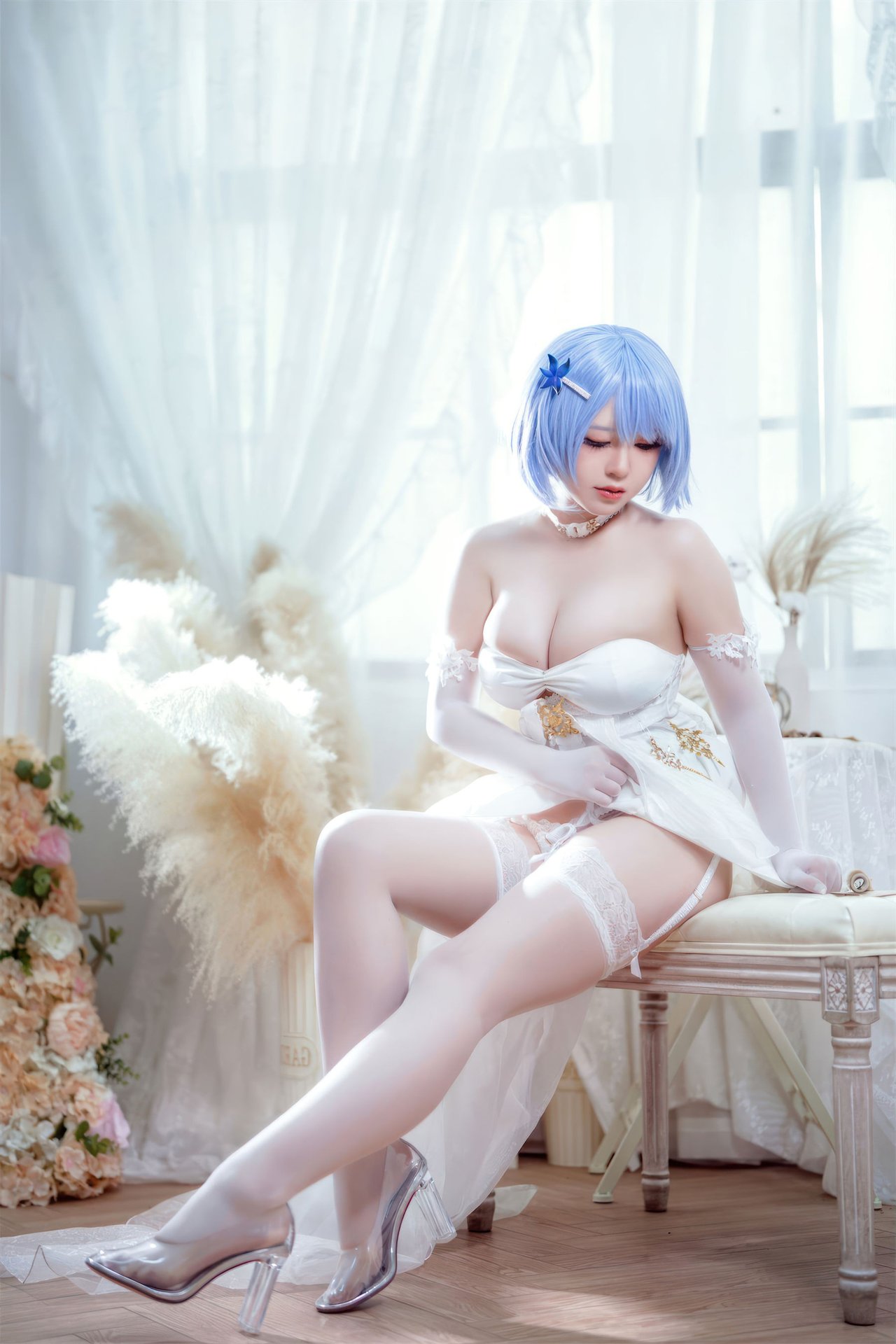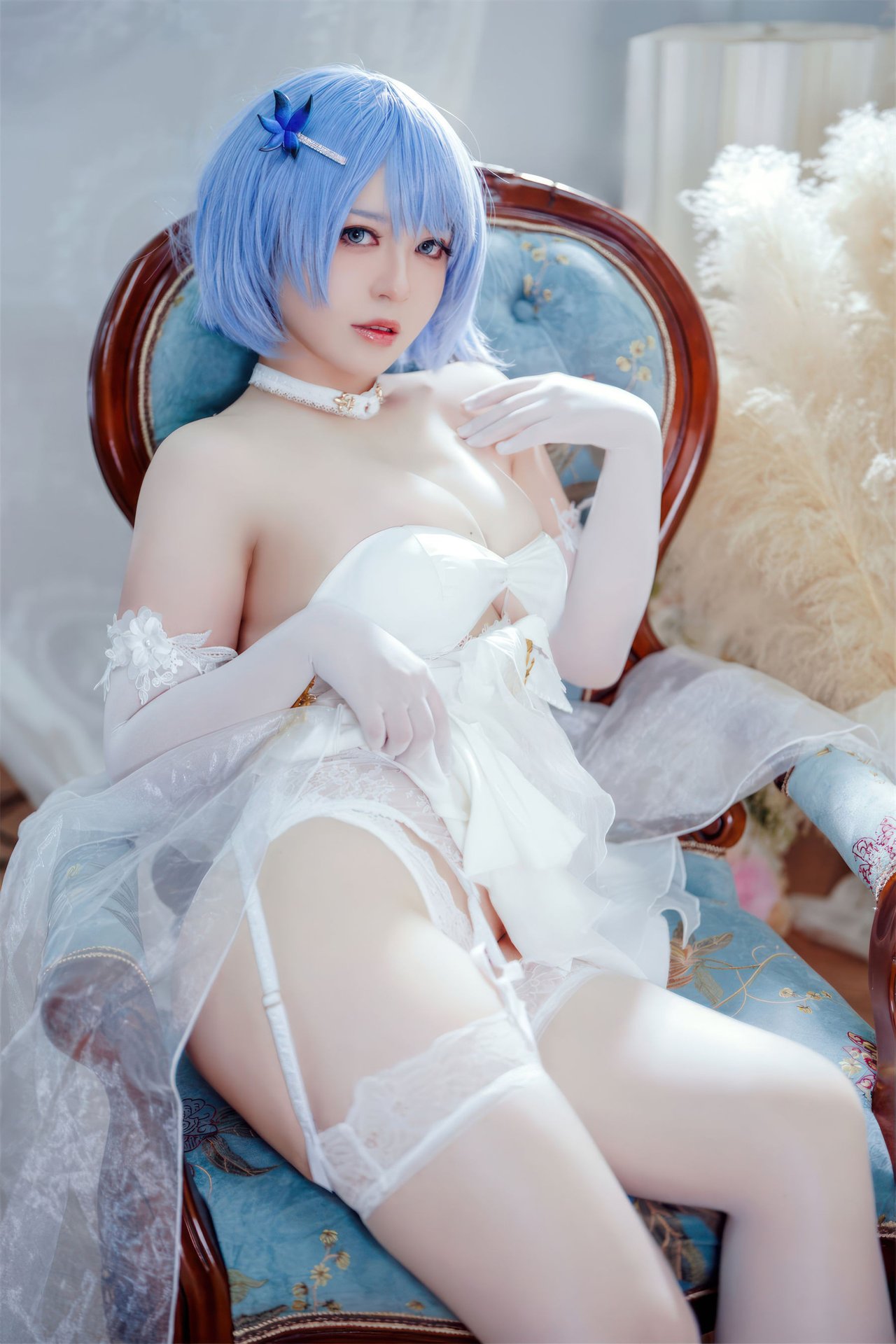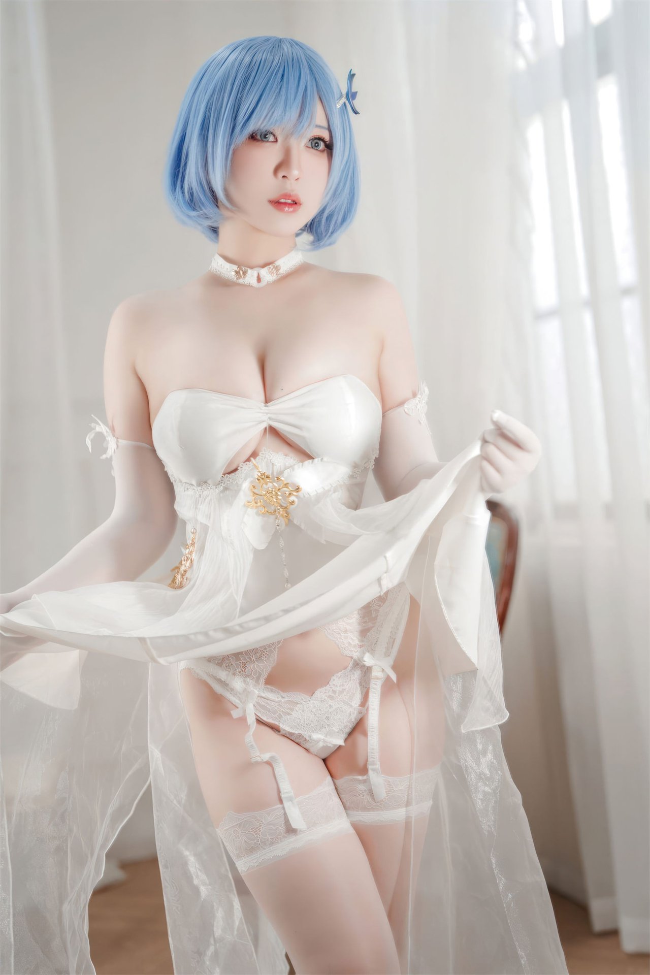 This stunning image captures Coser AzuNyan transforming into a gentle and ethereal fairy She dons a pure white dress with intricate ruffles highlighting her delicate and pristine beauty Her soft blue-purple hair flowing gracefully along with a subtle halo-like accessory enhances her mystical aura as if she were an angel wandering in a dreamy realm AzuNyans gentle smile exudes grace and captivates viewers into a fairytale world This exquisite portrayal is part of her special June 2025 collection showcasing her meticulous dedication to each intricate costume and character design