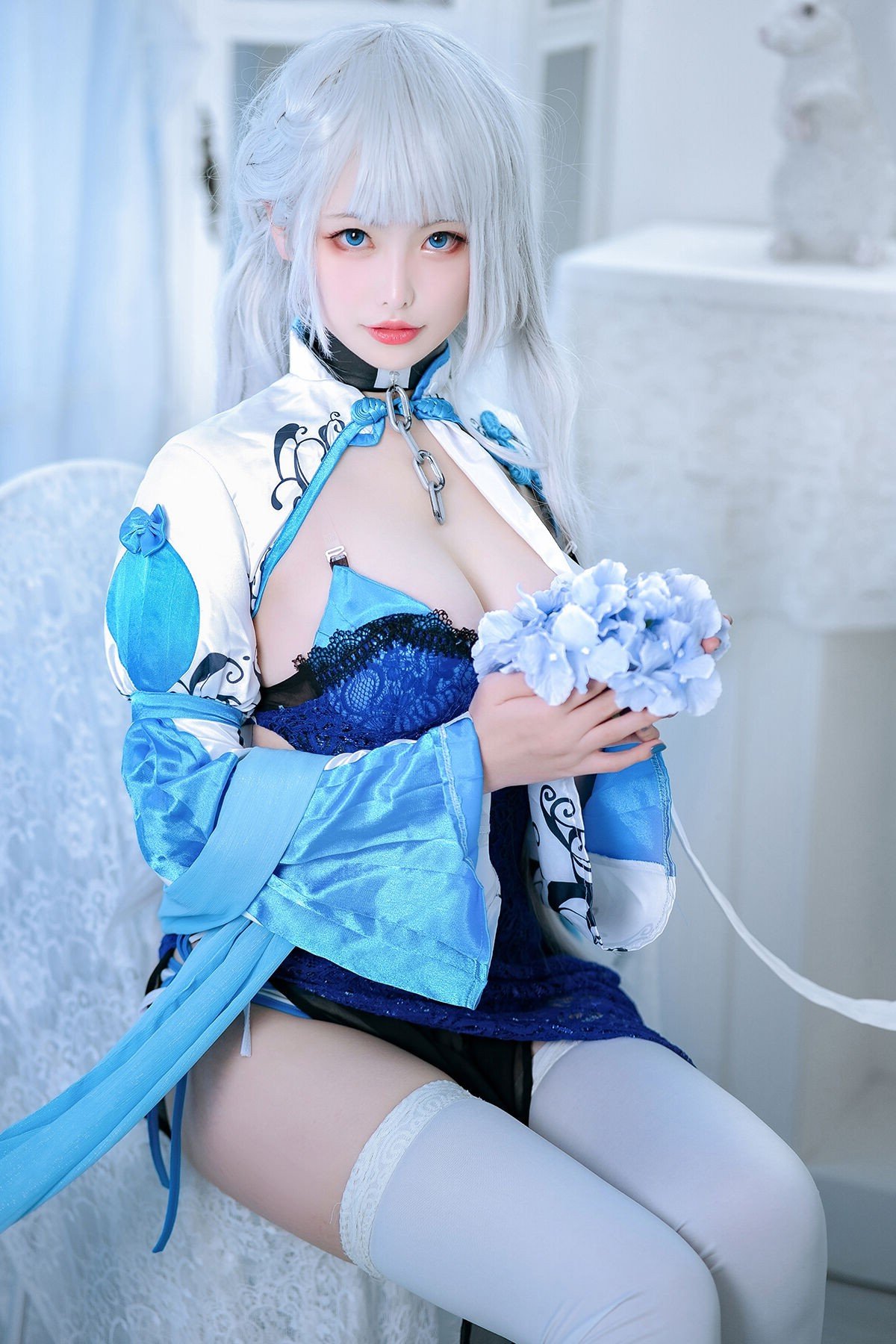 Coser@樱岛嗷一 delivers an outstanding portrayal of Belfast from Azur Lane. With her shimmering silver hair and magnificent royal blue outfit complemented by a pristine white cape she perfectly embodies the character's elegant and regal beauty. Every detail from the blue bouquet held in her hand to her gentle gaze is exquisitely rendered highlighting Belfast's grace and allure. This photograph is not merely an impressive cosplay piece but a harmonious blend of physical beauty and character spirit conveying a profound artistic emotion. It is undoubtedly a captivating image that will enchant fans.