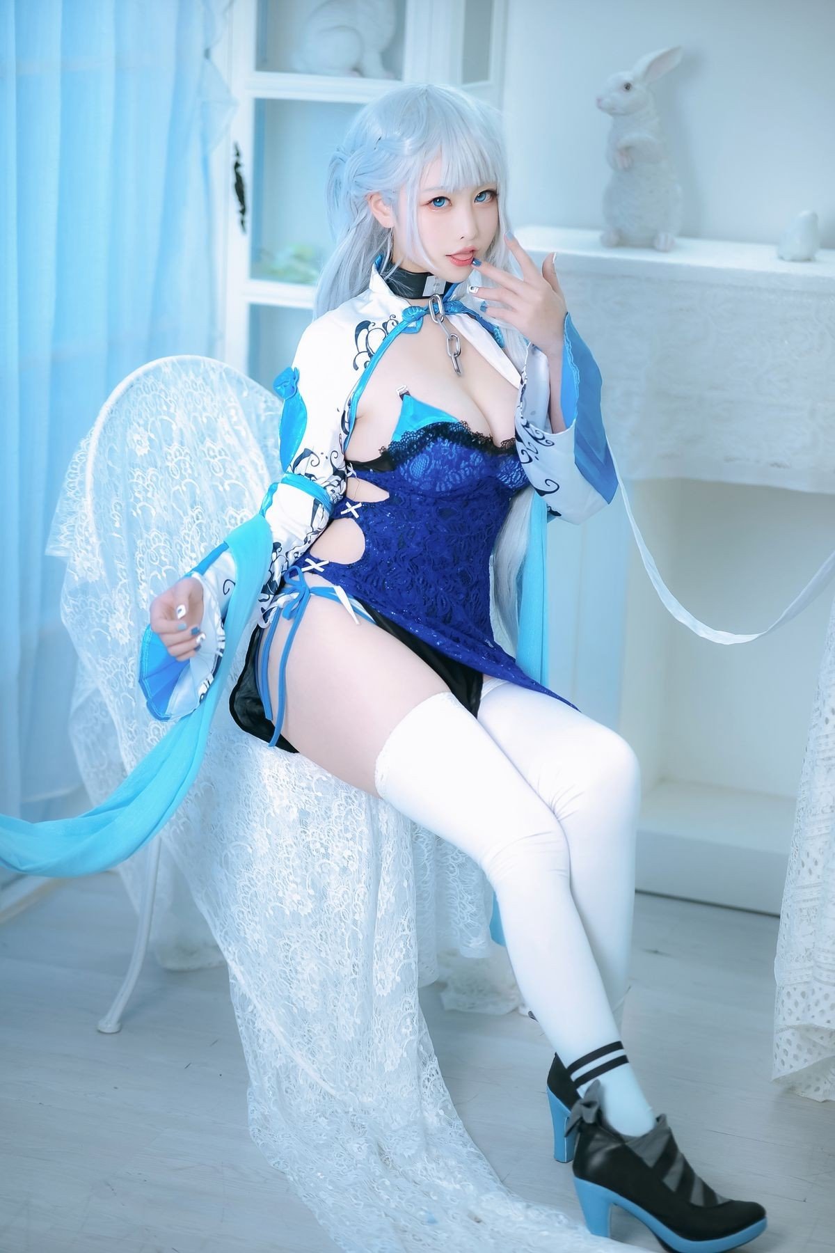 Coser@樱岛嗷一 captivates as the 'Evil Bunny Girl' in a stunning white cosplay ensemble. Her ethereal light blue hair and fluffy bunny ears create an innocent yet alluring contrast. The meticulously designed outfit features bold cutouts and delicate straps highlighting her graceful figure. With a subtle gaze and a hint of mischief 樱岛嗷一 embodies the character's unique blend of charm and edgy allure. This cosplay isnt just a portrayal its an artful interpretation that combines soft elegance with a distinctive unconventional style. The photoshoot leaves a lasting impression showcasing a captivating and memorable performance by Coser@樱岛嗷一.