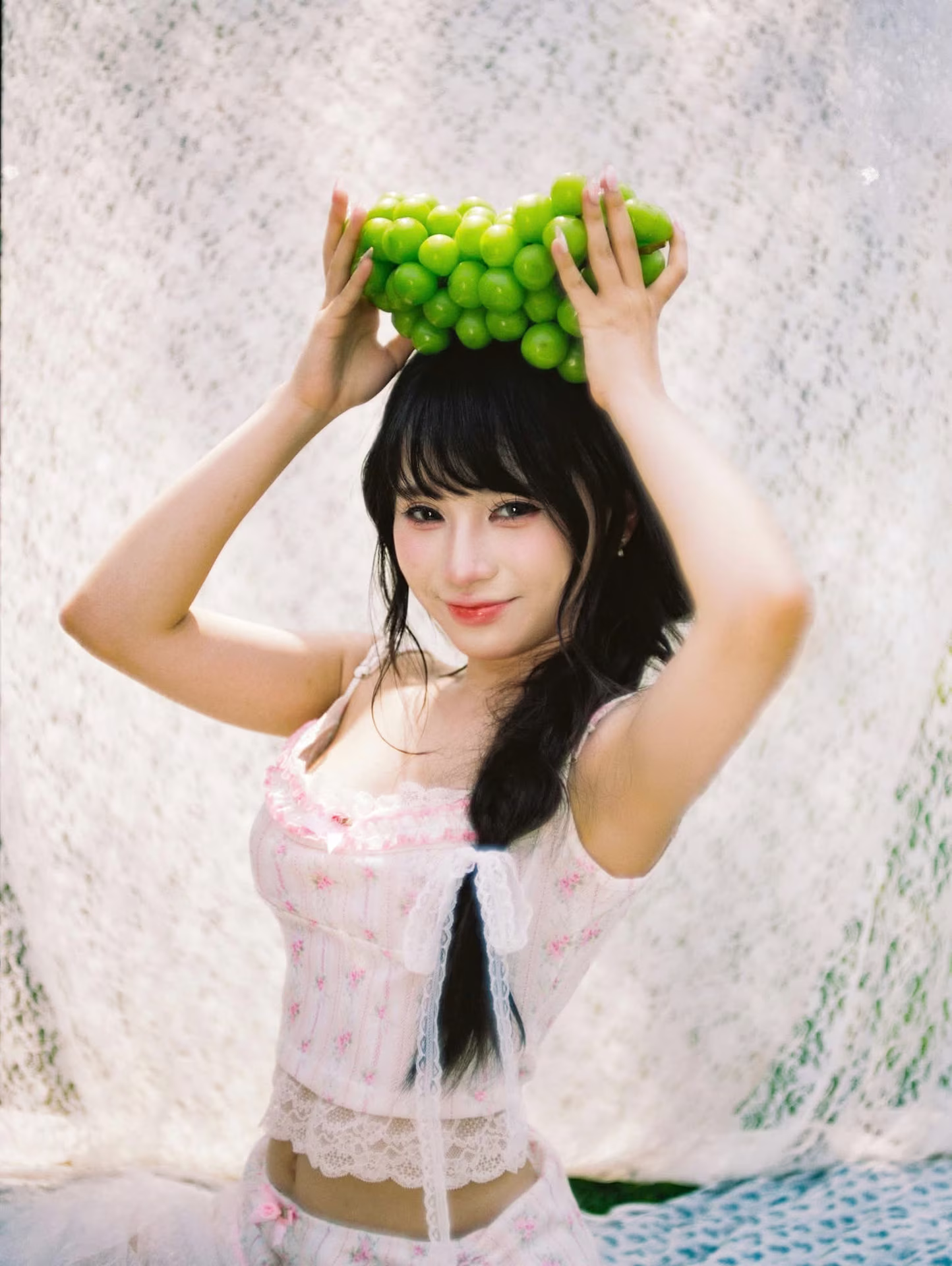 This image captures a serene and beautiful moment of a young woman With a gentle smile and softly closed eyes she exudes a delicate pure beauty The bright summer sunlight filters through the leaves accentuating her dark hair and fair skin Her light dress further highlights her graceful and modest charm She is enjoying luscious green grapes a symbol of freshness and sweetness The lush green natural background along with a pristine white curtain creates a perfect portrait of youth This is more than just a picture it is a story of tranquility natural beauty and those relaxing moments everyone yearns for The girl appears as a muse of summer bringing a sense of lightness and comfort to the viewer#Gentle #Beauty #Summer #Vibes #Youthful #Charm #Natural #Muse