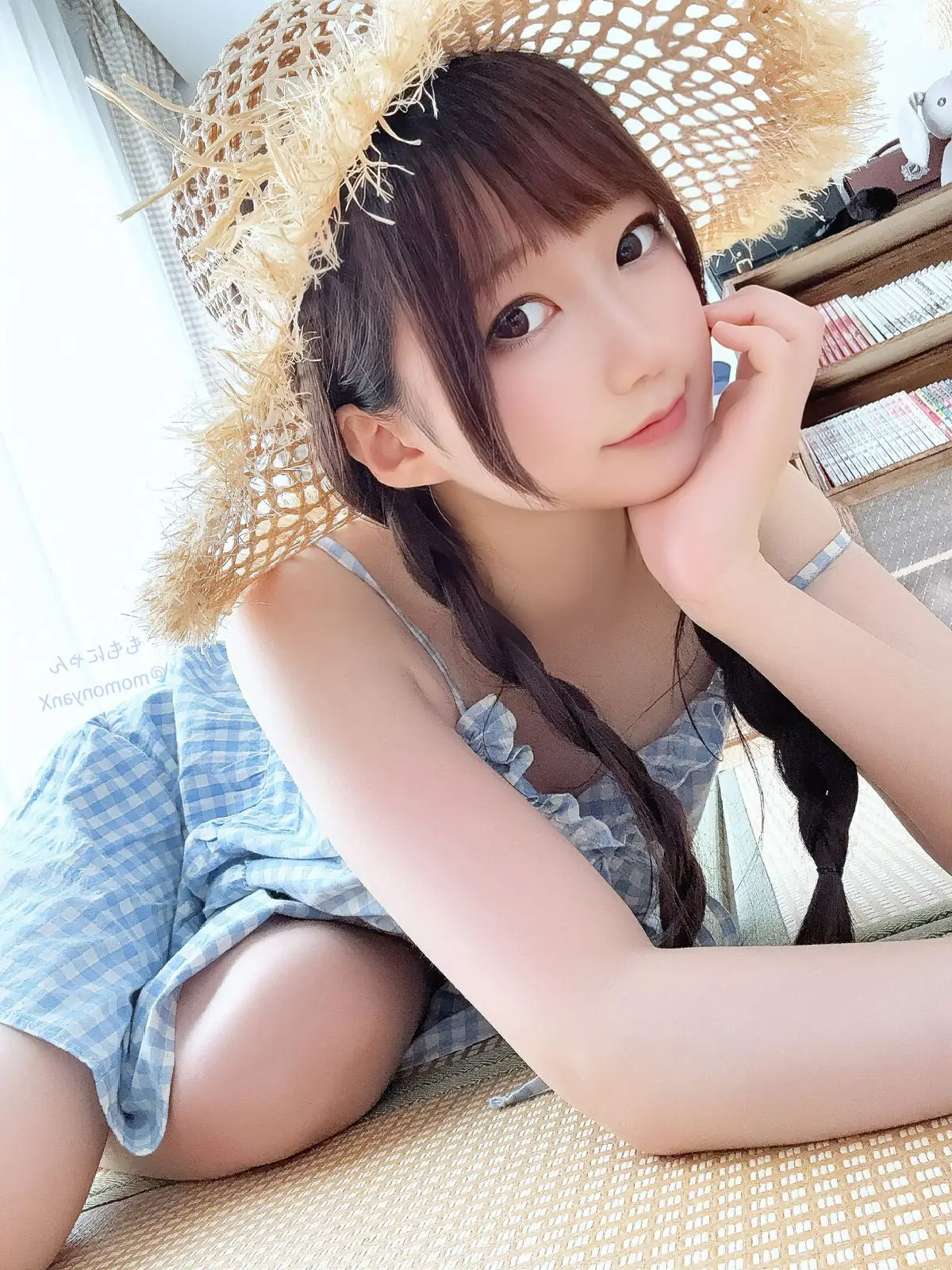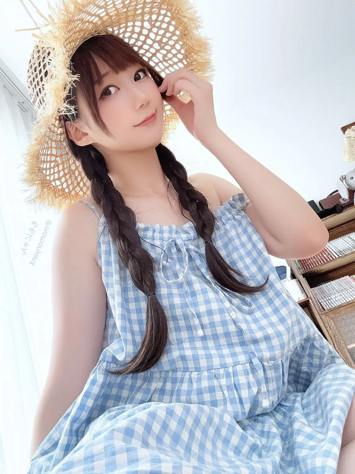 This beautiful image features coser NAGISA魔物喵 looking incredibly charming and fresh. She wears a light blue and white gingham dress, paired with a rustic straw hat, creating a distinct summer style. Her neatly braided hair further highlights NAGISA魔物喵s graceful and innocent charm. With captivating eyes and a gentle smile, she radiates sweetness and approachability. This is part of the special Part03 collection, offering serene and emotional moments. The image evokes a sense of peace, like a calm summer afternoon, making viewers feel captivated by NAGISA魔物喵s natural and alluring beauty.#NAGISA #魔物喵 #SummerCosplay #GinghamDress #StrawHat #CharmingCoser