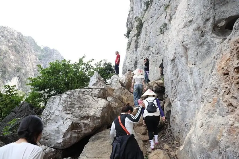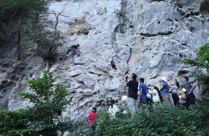 This image captures a challenging moment as a group of tourists conquers a rugged trail in Huu Lien, Lang Son. They navigate carefully along steep limestone cliffs, discovering the wild beauty of the mountains. This clearly demonstrates the allure of adventure tourism, where people immerse themselves in nature and push their personal limits. Rock climbing here is not just a physical challenge but also an opportunity to admire the majestic landscape, with its magnificent rock formations sculpted over millions of years. Each step is a unique nature exploration experience, bringing a sense of freedom and accomplishment. Huu Lien is becoming an ideal destination for outdoor enthusiasts seeking adventure and challenge. Come and experience this unforgettable journey.#AdventureTravel #HuuLien #RockClimbing #NatureExploration #LangSon