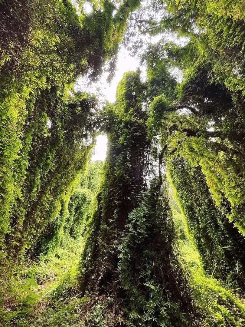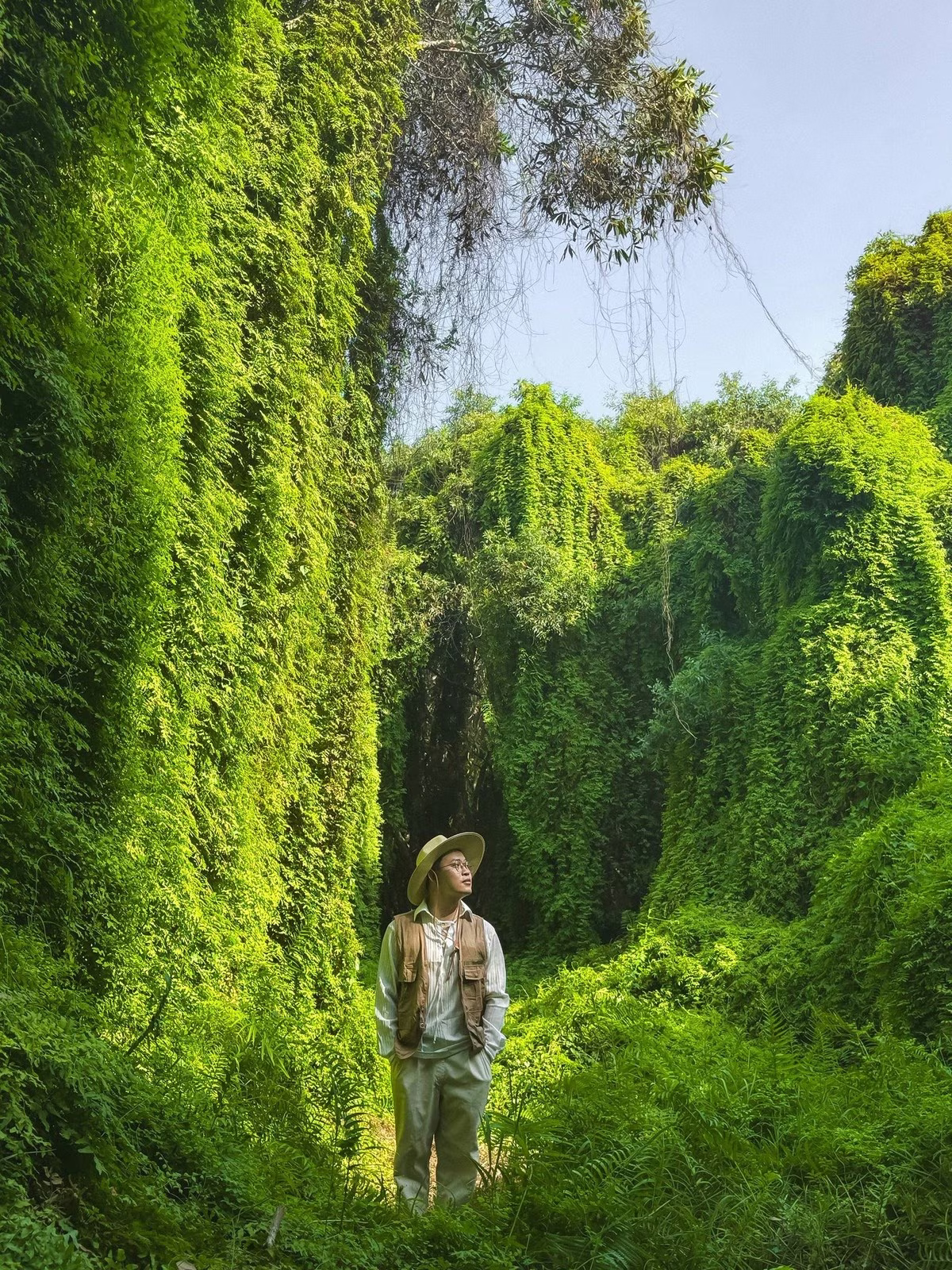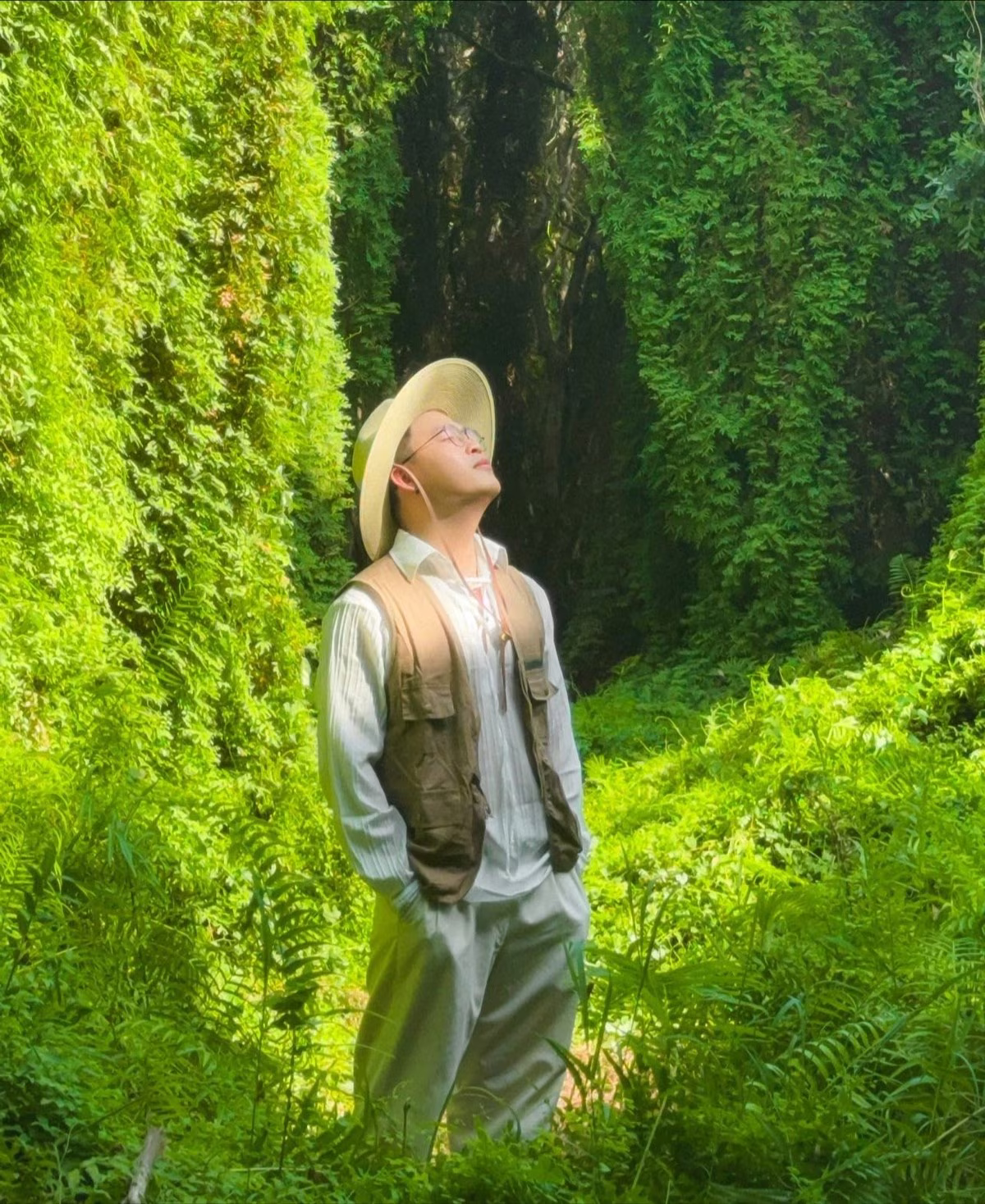This photo captures a young traveler passionately exploring the mossy melaleuca forest in Khanh Hoa Vietnam Donning a wide-brimmed hat and active wear he appears to be lost in a mystical fairy-tale world Ancient melaleuca trees adorned with lush green moss create an enchanting and captivating spectacle This is an ideal destination for those seeking tranquility and unique experiences amidst pristine nature The melaleuca forest in Cam Lam Khanh Hoa not only attracts with its distinct beauty but also serves as a wonderful spot for young people to freely check in and preserve memorable moments An unmissable location for discovery travel enthusiasts