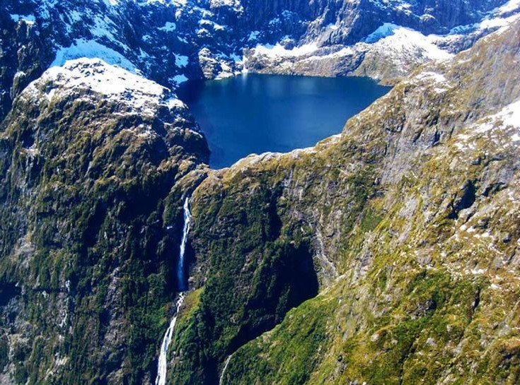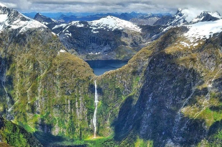 This breathtaking image captures the majestic Sutherland Falls in New Zealand, a true natural masterpiece nestled within the vast Fiordland National Park. The pristine waters cascade dramatically from a glacial lake atop rugged cliffs, showcasing the untouched beauty of this wild landscape. It stands as a prominent tourist destination, inviting adventurers to explore its untouched ecosystem and unique fiord terrain. The harmonious blend of snow-capped mountains, a deep blue lake, and the powerful waterfall paints a magnificent picture of New Zealand's natural grandeur, a must-see for those seeking to discover unparalleled wilderness.Stories