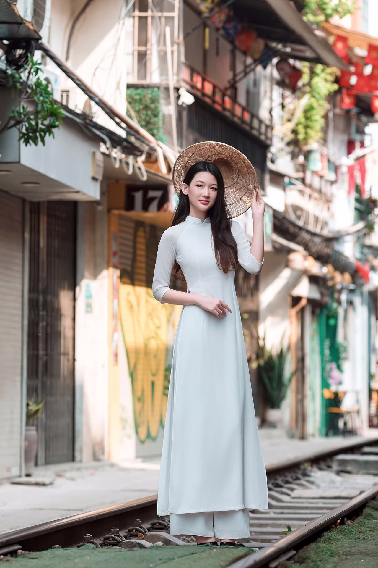 VGU No79 proudly presents the graceful and elegant beauty of a Vietnamese young woman in a pristine white Ao Dai. She stands amidst the charming old Hanoi Train Street a famous tourist destination steeped in history. With a radiant smile and the traditional conical hat held gently behind her the image exudes shyness and tenderness. This photograph not only captures a beautiful moment but also celebrates Vietnam's culture and the iconic Ao Dai traditional dress. The girl's serene elegance combined with the nostalgic atmosphere of the old quarter creates a captivating and harmonious blend. This is an impressive travel highlight for anyone wishing to explore the tranquil beauty and unique culture of Hanoi. #Vietnamese #pretty #charm