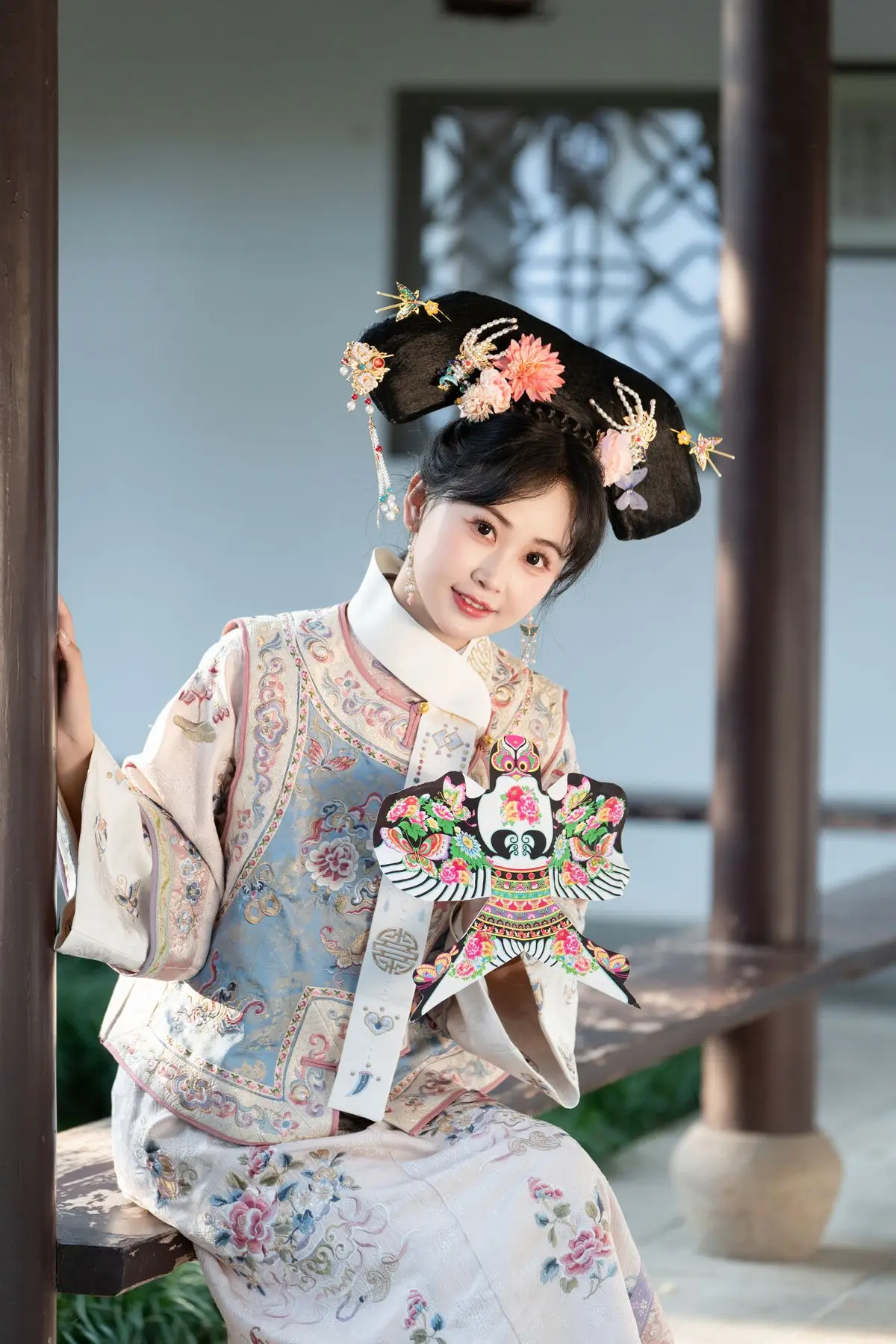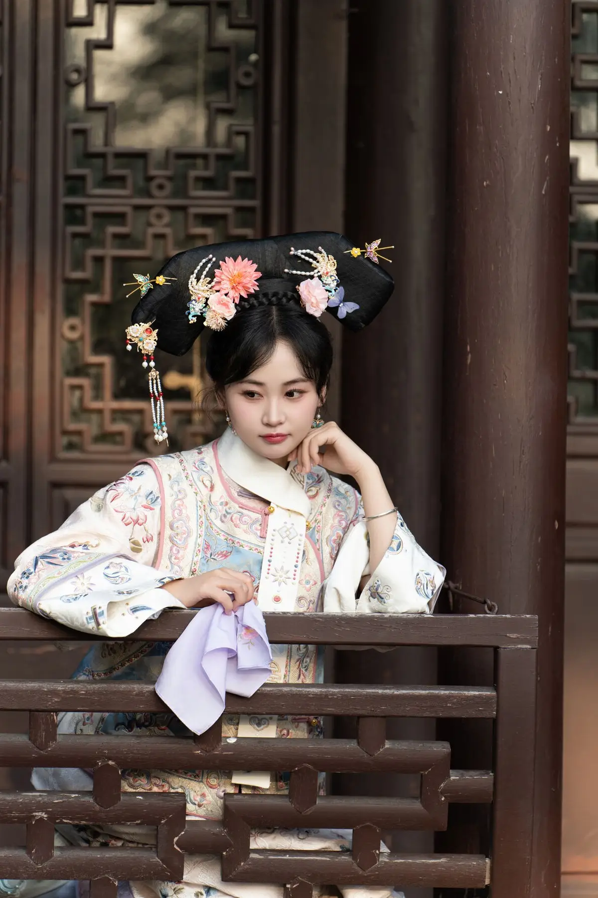 This photo captures a young woman with a gentle and ethereal beauty deeply imbued with traditional East Asian charm. She wears a delicate light blue ancient costume her long dark hair adorned with light blue hair accessories creating a harmonious and enchanting overall look. Her expression conveys serenity and depth as if lost in thought amidst the ancient surroundings. Behind her are wooden pillars and vermilion red railings evoking images of traditional architecture possibly a communal house pagoda or ancient home in Vietnam. The entire scene transports viewers back to a bygone era where human beauty and architecture intertwine forming a captivating cultural tapestry. This is a perfect blend of the young woman's elegant beauty and the ancient charm of the architecture a symbol of Vietnamese grace and cultural depth.#TraditionalBeauty #EastAsianGirl #AncientCostume #AncientArchitecture #VietnamBeauty