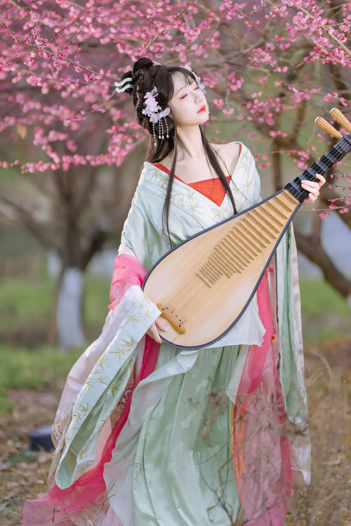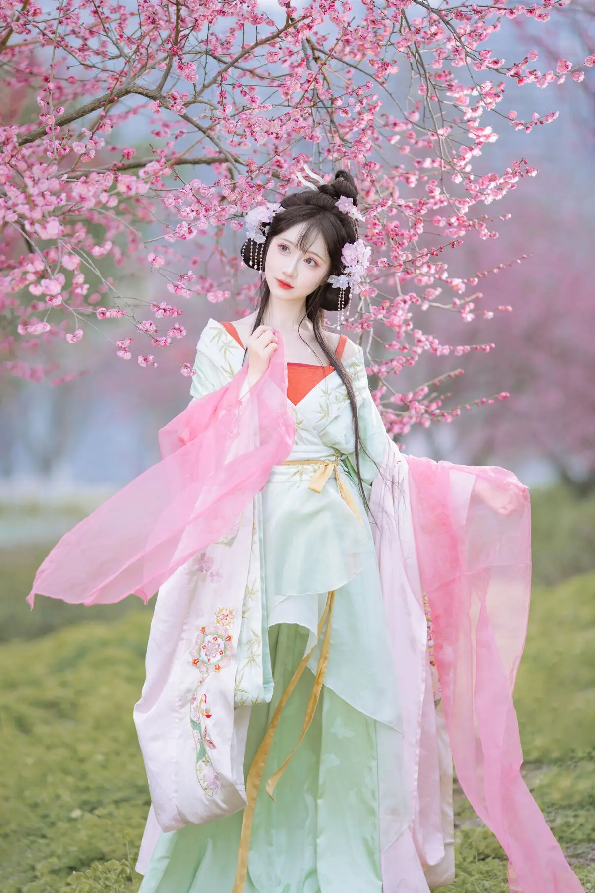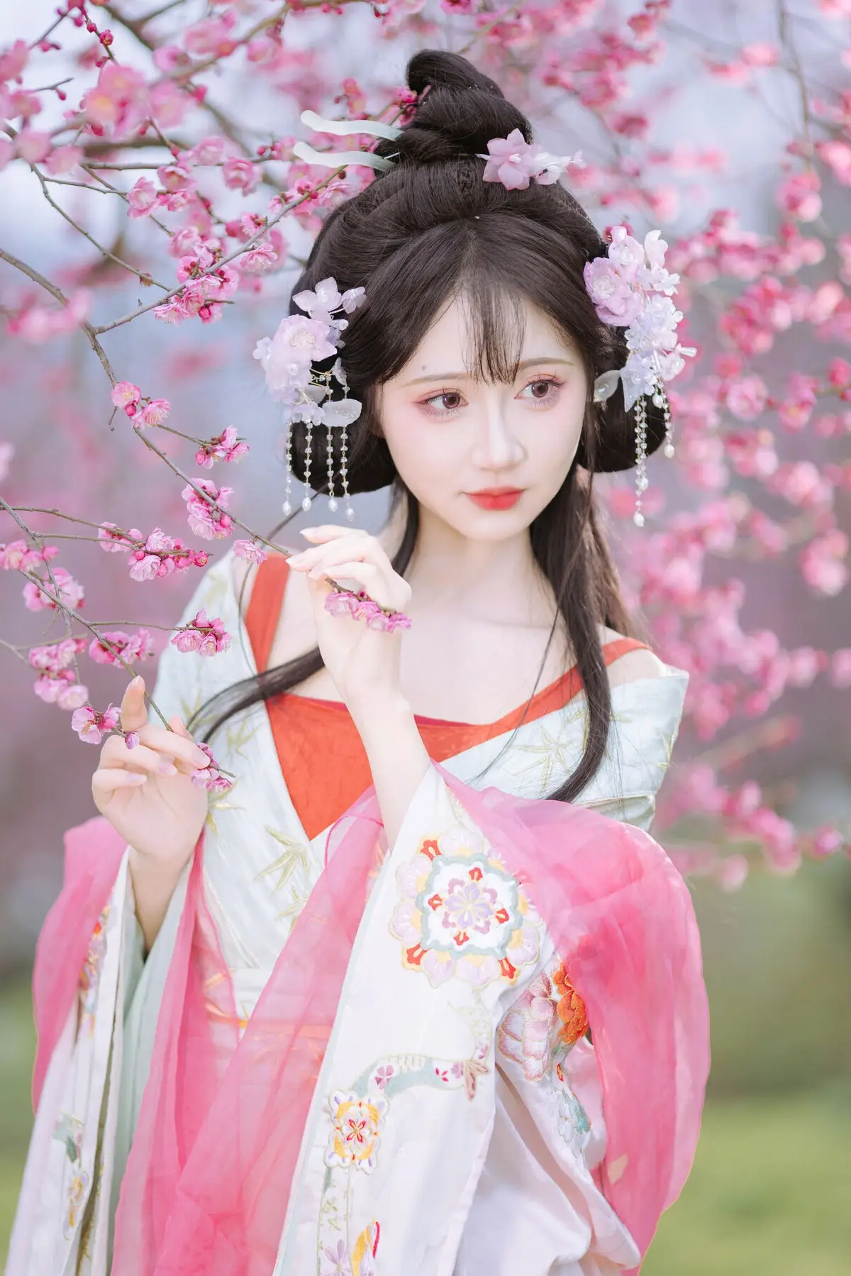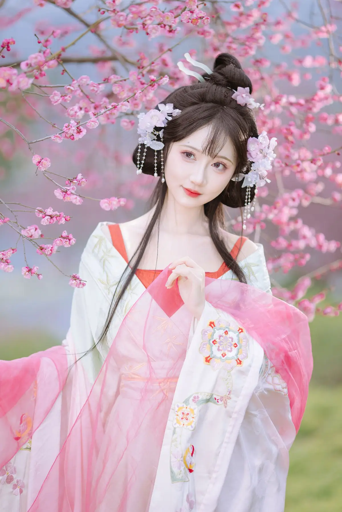 This stunning photograph captures Qi Luo Sheng De Xiao Su Su in an exquisitely crafted traditional Hanfu, radiating ethereal beauty and grace. Amidst a romantic backdrop of blooming cherry blossoms, each pink petal enhances the maiden's gentle and delicate charm. Her elaborate updo, adorned with fresh flowers and classic ornaments, creates a poetic and artistic representation of East Asian aesthetics. She appears like a fairy who has descended to earth, embodying purity and timeless beauty. The image is not just a moment but a narrative of harmony between humanity and nature, beautifully presented through the artistic photography style of YiTuYu Vol.8553. The allure of Qi Luo Sheng De Xiao Su Su, her traditional attire, and the enchanting natural setting are sure to captivate hearts.#Hanfu #QiLuoShengDeXiaoSuSu #CherryBlossom #AsianBeauty #TraditionalChinese