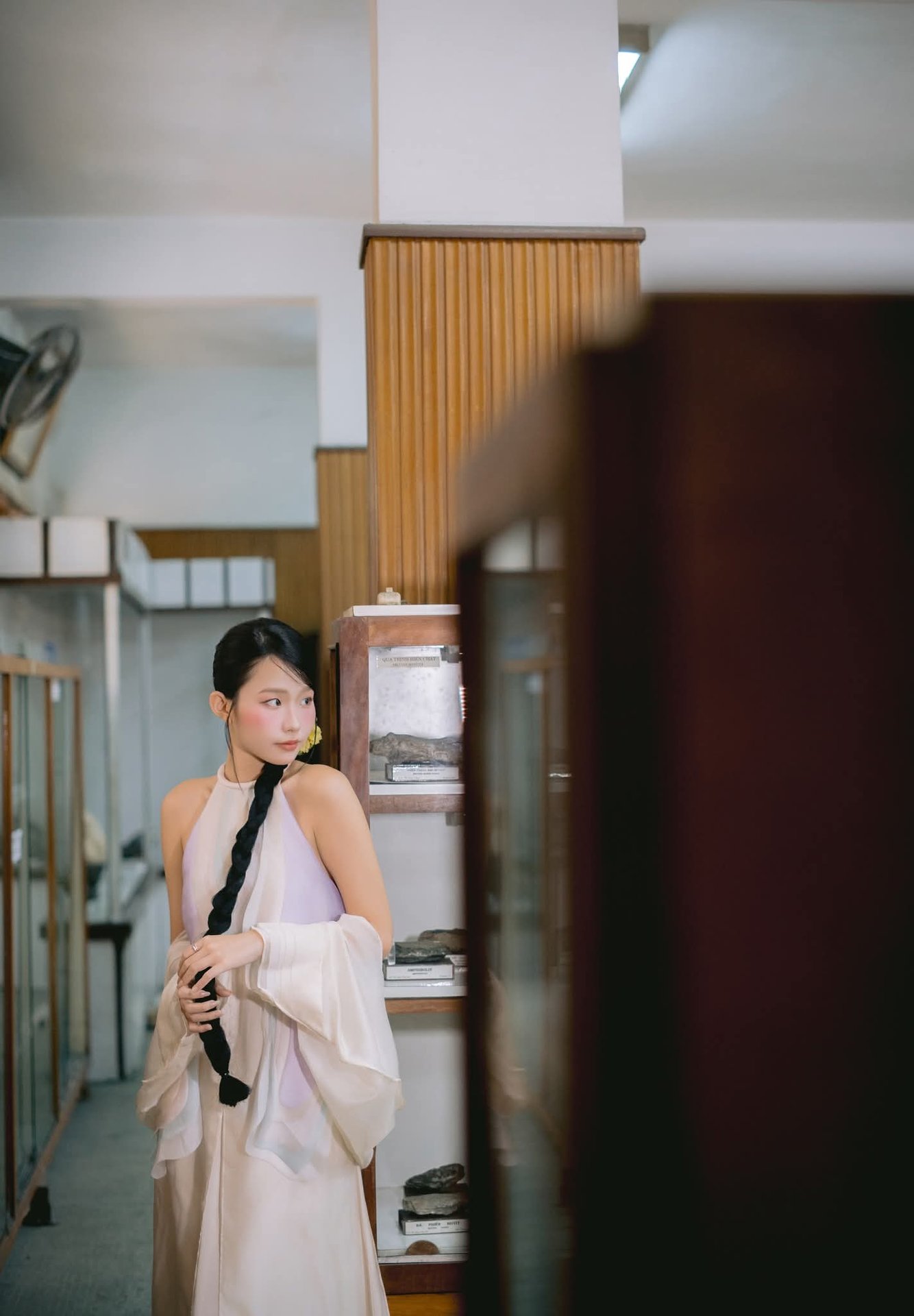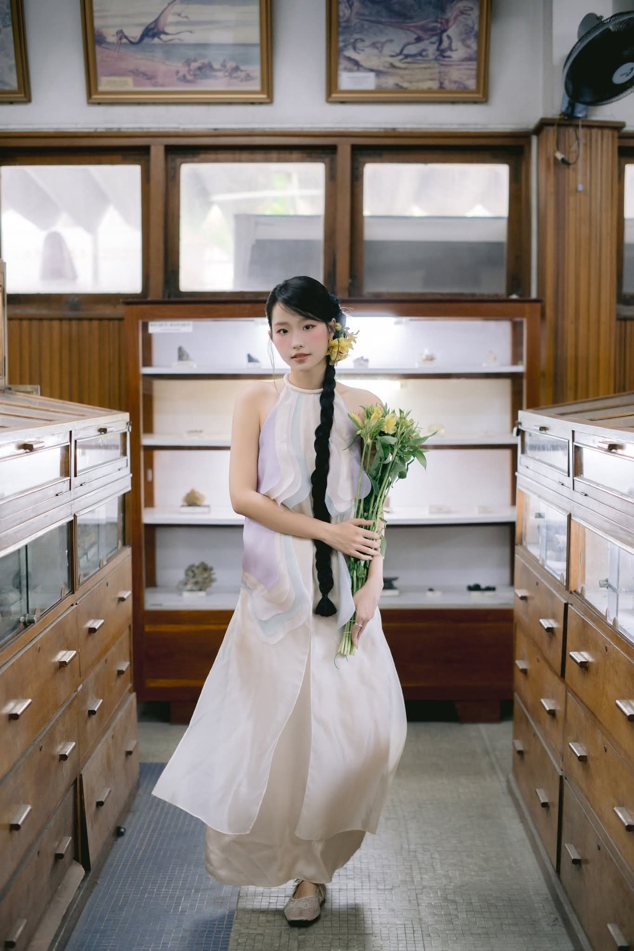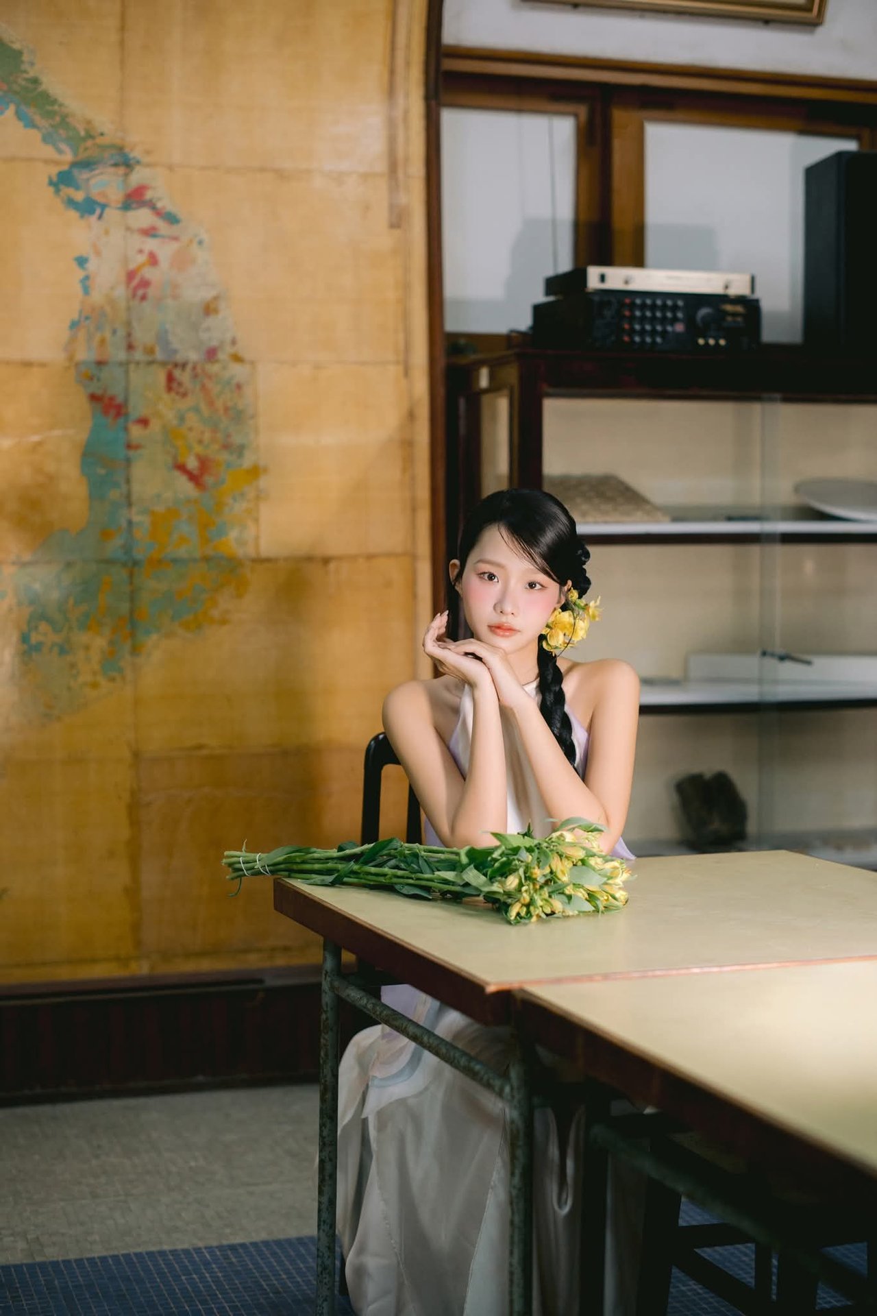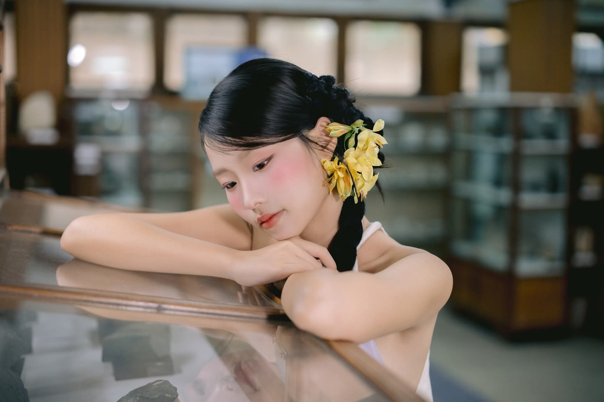 This stunning portrait captures the serene beauty of a young Asian woman, exuding elegance and grace. She sits in a contemplative pose, her dreamy gaze directed upwards, creating a profound sense of tranquility and introspection. Her long, dark hair is styled in a beautiful braid, subtly adorned with a delicate yellow flower, highlighting her gentle and classic charm. The flowing, light-colored, elegant attire complements her slender figure, radiating sophistication. The warm wooden backdrop, complete with artistic framed pictures, further enhances the timeless appeal of the subject. More than just a photograph, it tells a story of peacefulness, inner beauty, and a harmonious blend of traditional and modern Asian style.