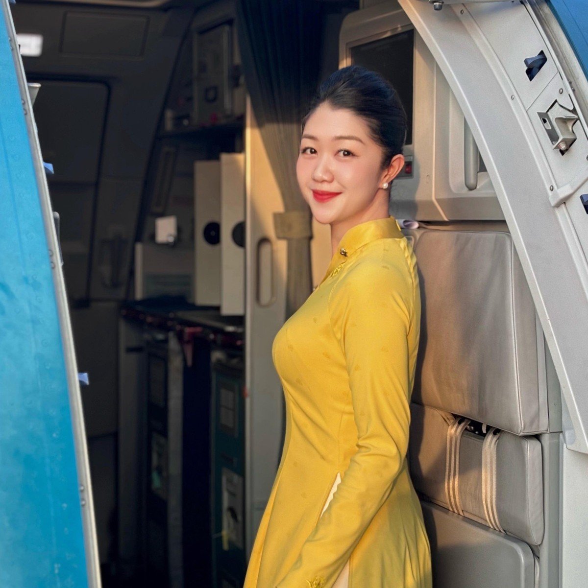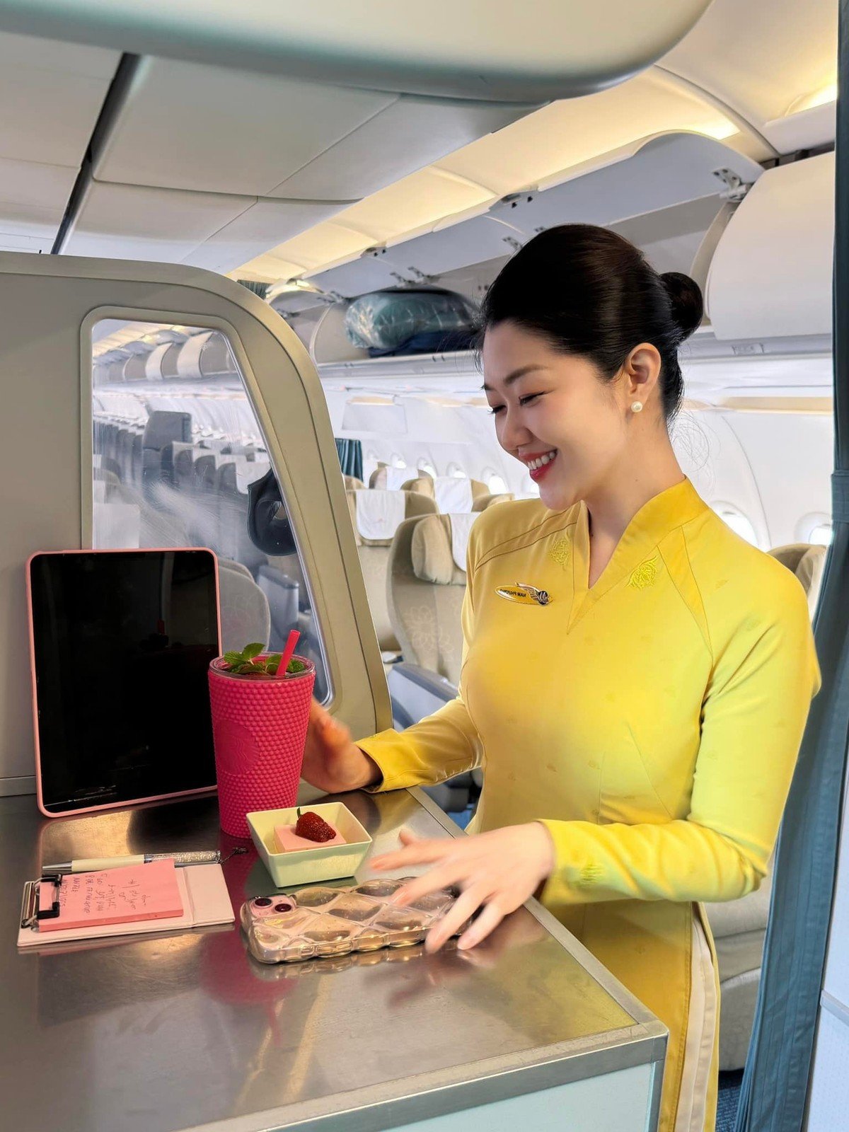 This image captures a beautiful senior flight attendant adorned in a traditional yellow Ao Dai. She radiates a captivating smile that draws every gaze. The Ao Dai elegantly accentuates the graceful and slender figure of Vietnamese women. The setting inside the airplane cabin highlights her professionalism and dedication in serving passengers. This gentle yet confident beauty truly stands out, radiating positive energy. The image not only showcases her elegance but also embodies the pride of Vietnamese culture and people within the aviation industry. Her 'ten thousand people adore' smile will undoubtedly leave a lasting impression on every passenger, affirming the class and hospitality of the flight crew.