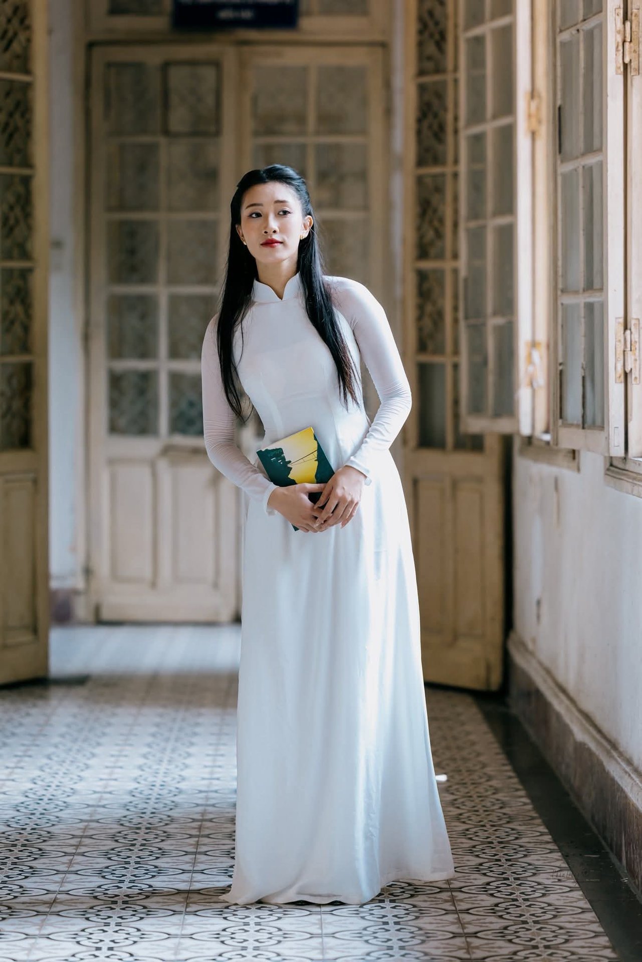 This exquisite photograph captures the serene elegance of a Vietnamese woman adorned in traditional attire Standing gracefully within an ancient architectural setting she embodies the timeless beauty and cultural richness of Vietnam Her gentle gaze and composed demeanor reflect a profound sense of peace and inner tranquility The delicate white flower adorning her neatly styled hair enhances her refined charm Her pristine white garment harmonizes beautifully with the rustic wooden tones of the traditional structure creating a visually captivating and poetic scene More than just a portrait this image celebrates the enduring grace and cultural heritage of Vietnamese women offering a captivating glimpse into their unique eleganceGraceful Vietnamese Girl in White Ao Dai by Window, Celebrating Traditional Beauty