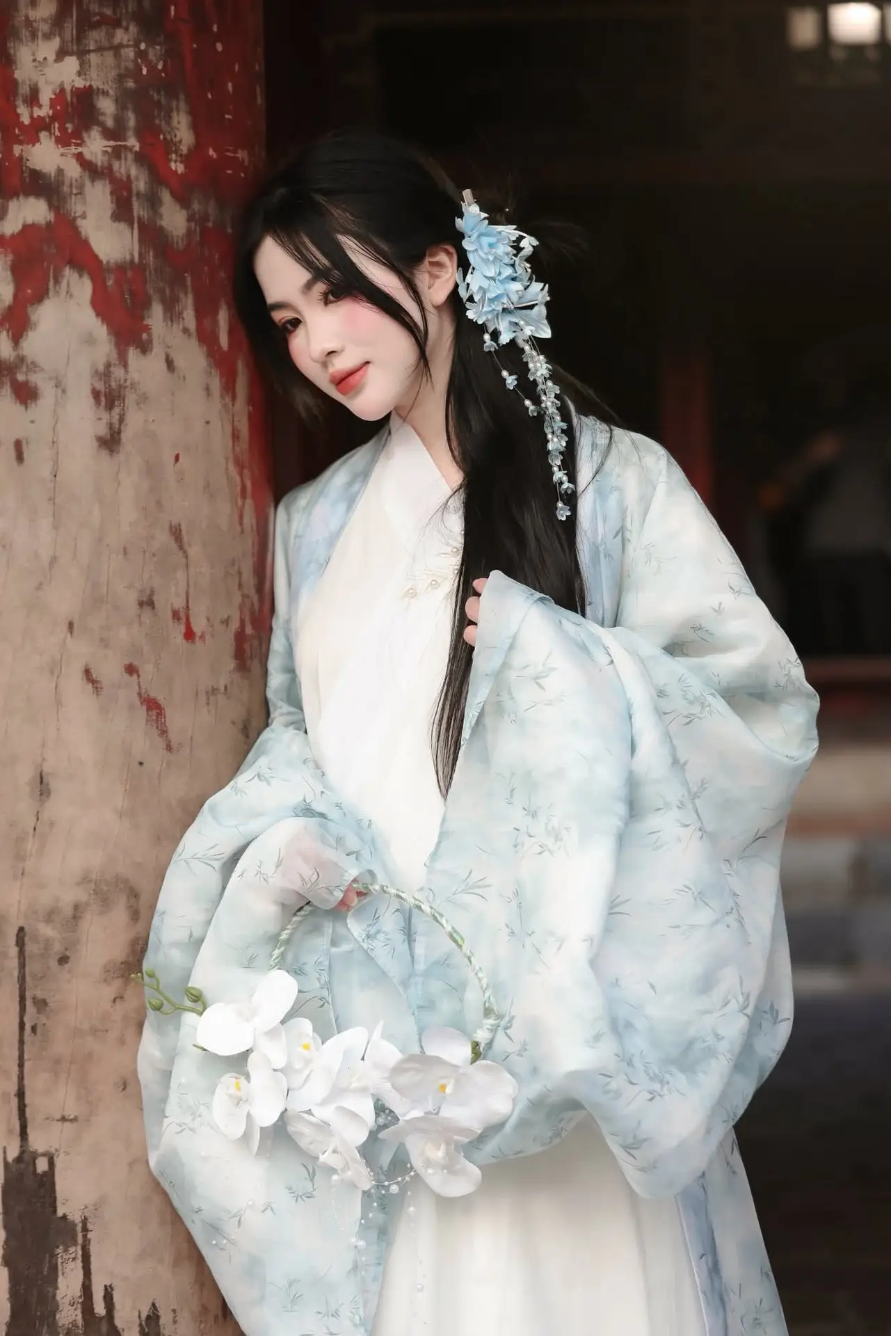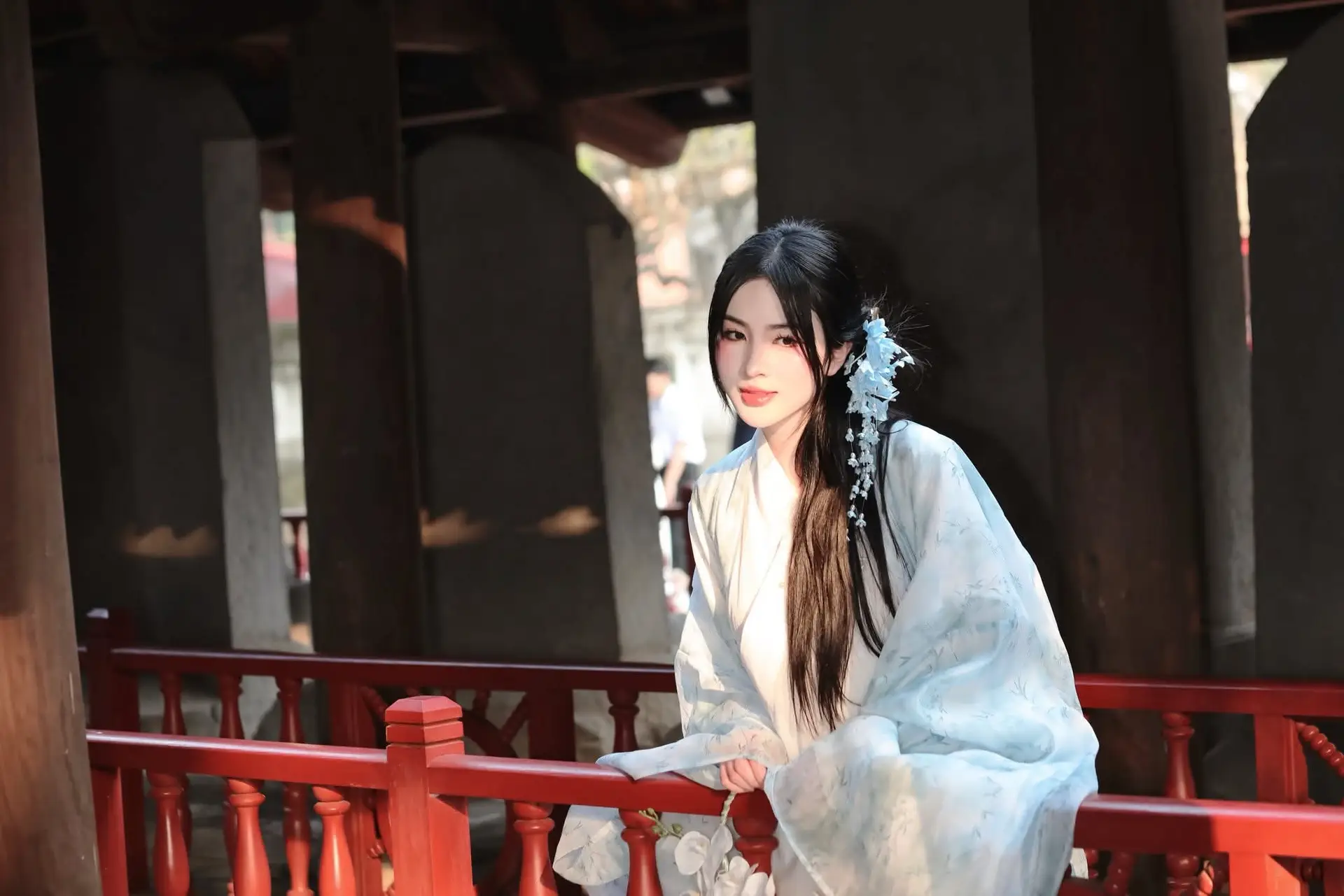 This photo captures a young woman with a gentle and ethereal beauty deeply imbued with traditional East Asian charm. She wears a delicate light blue ancient costume her long dark hair adorned with light blue hair accessories creating a harmonious and enchanting overall look. Her expression conveys serenity and depth as if lost in thought amidst the ancient surroundings. Behind her are wooden pillars and vermilion red railings evoking images of traditional architecture possibly a communal house pagoda or ancient home in Vietnam. The entire scene transports viewers back to a bygone era where human beauty and architecture intertwine forming a captivating cultural tapestry. This is a perfect blend of the young woman's elegant beauty and the ancient charm of the architecture a symbol of Vietnamese grace and cultural depth.