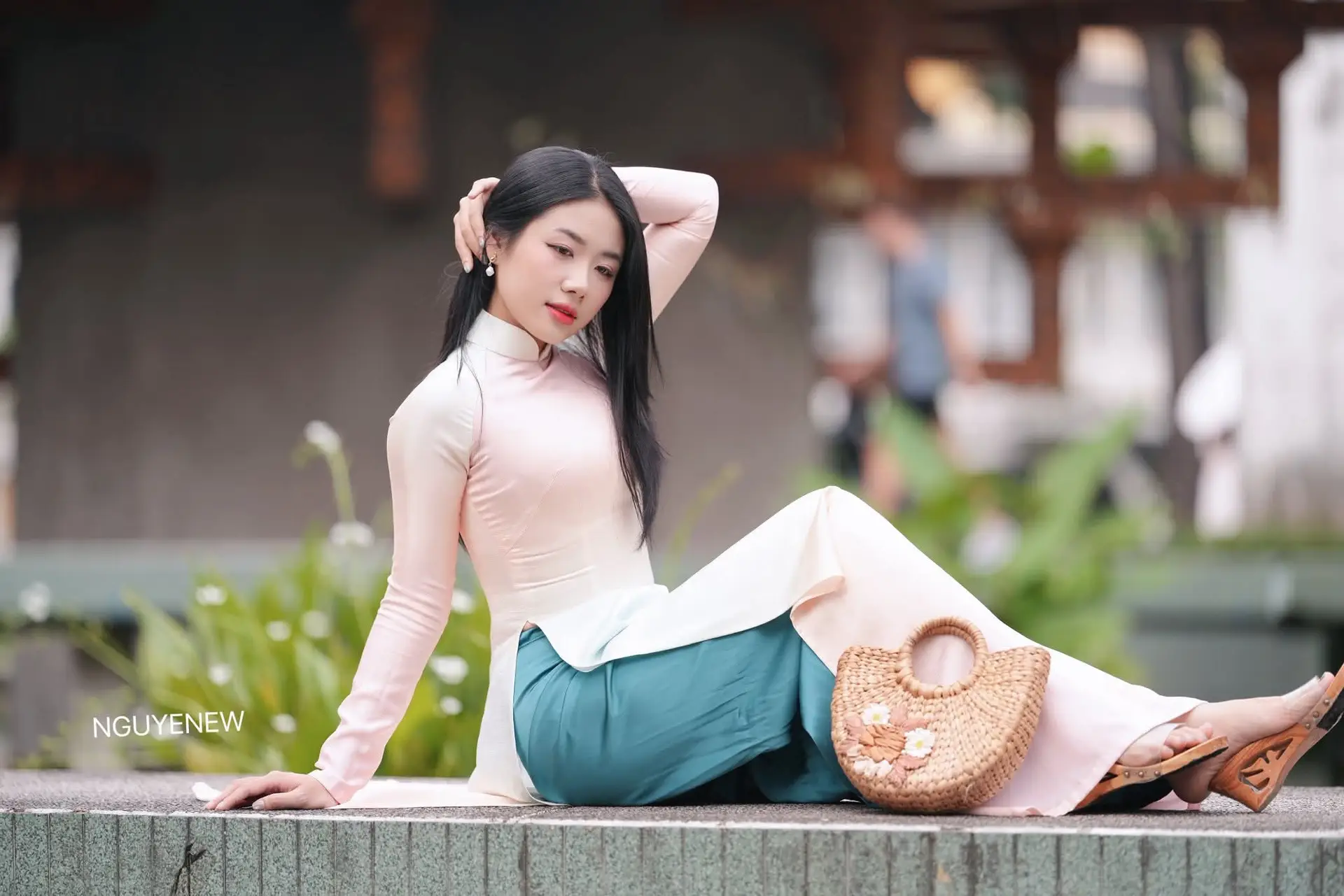 This beautiful photograph captures a serene moment of a Vietnamese lady, gracefully adorned in a delicate pink traditional Ao Dai. With her long, flowing dark hair and gentle demeanor, she embodies the pure and charming beauty characteristic of Vietnamese women. The Ao Dai is more than just an outfit; it's a cultural symbol, celebrating modest yet captivating elegance. This image evokes a sense of grace, highlighting the deep-rooted cultural heritage of Vietnam, bringing feelings of peace and pride in the national legacy. It's a perfect blend of human beauty and traditional attire, radiating timeless charm.