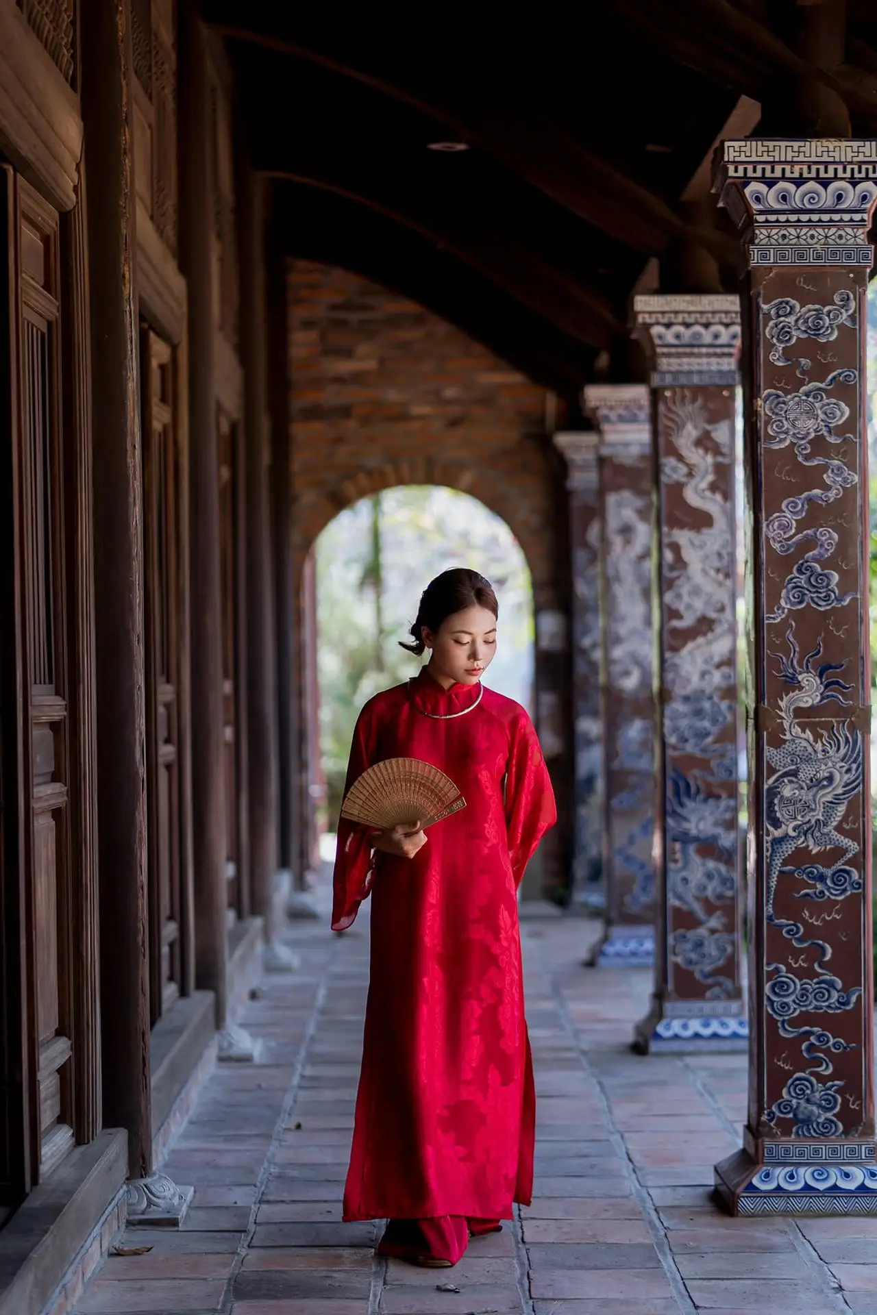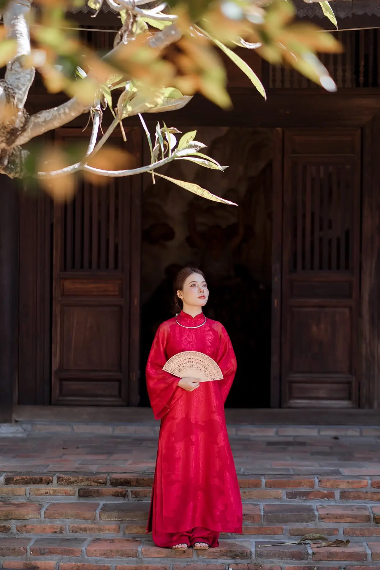 This image captures a serene moment of a graceful Vietnamese woman in a vibrant red Ao Dai. She sits calmly on a traditional wooden porch, holding a classic fan, exuding a gentle and elegant beauty. The Ao Dai is more than just an outfit; it's a profound cultural symbol of Vietnam. Traditional elements are evident through the wooden architecture and the warm golden sunlight, creating a harmonious, distinctly Asian scene. This photograph evokes nostalgia for traditional values and the graceful beauty of Vietnamese women, showcasing a connection between past and present. It is a timeless and captivating beauty.