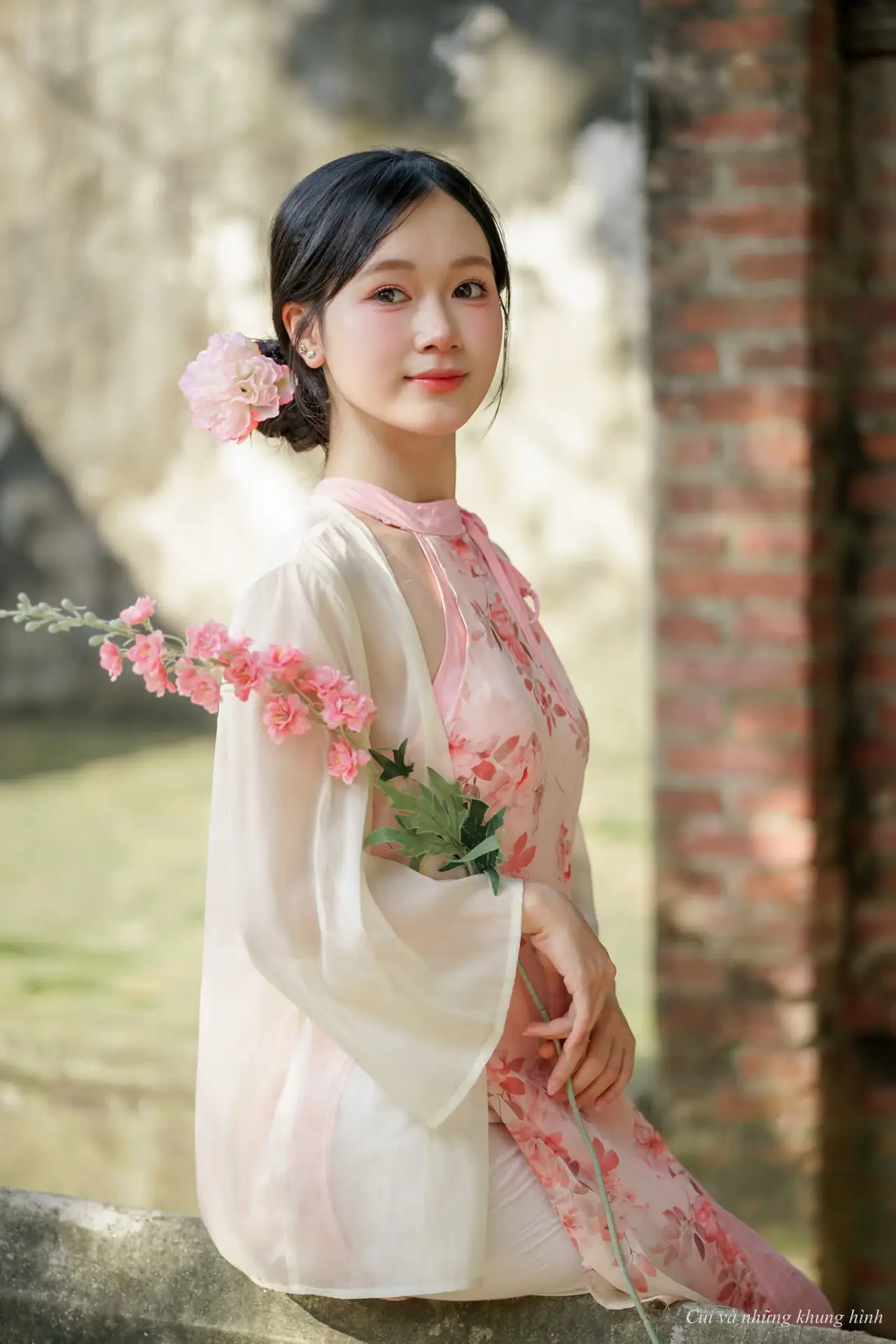 This captivating photograph beautifully captures a graceful Vietnamese woman adorned in the traditional Ao Dai. She radiates an ethereal elegance with her soft pink floral Ao Dai, complemented by a sheer outer layer that adds a delicate, flowing charm. Her neatly styled hair, accented with a matching pink flower, highlights her classic East Asian beauty. The blurred background featuring ancient brickwork subtly enhances the gentle allure and profound Vietnamese spirit of the young lady. More than just an outfit, the Ao Dai is an enduring symbol of Vietnamese culture. This image evokes a sense of pride and celebrates the timeless traditional beauty of Vietnamese women.