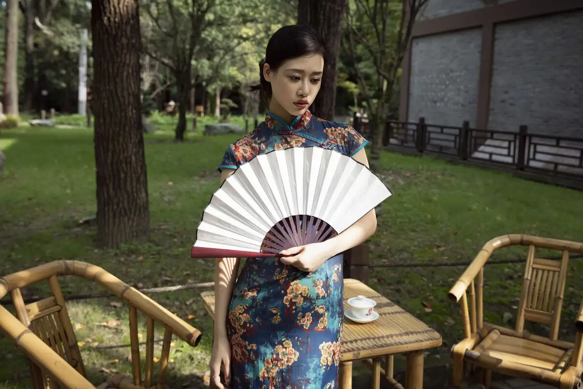 This stunning photograph beautifully captures model Chenaling_CL adorned in an exquisite traditional Cheongsam. The dress, featuring intricate blue floral patterns, accentuates her gentle charm and elegant posture. Chenaling_CL is gracefully seated, holding a classic fan, her gaze distant and contemplative, evoking a poetic and serene moment. The lush green backdrop enhances the overall harmony and timeless allure of the scene. More than just a portrait, this image is an artistic portrayal of the grace and enduring appeal of an East Asian woman in her traditional attire. This Vol.8523 collection promises to captivate admirers of cultural beauty and refined artistic expression.