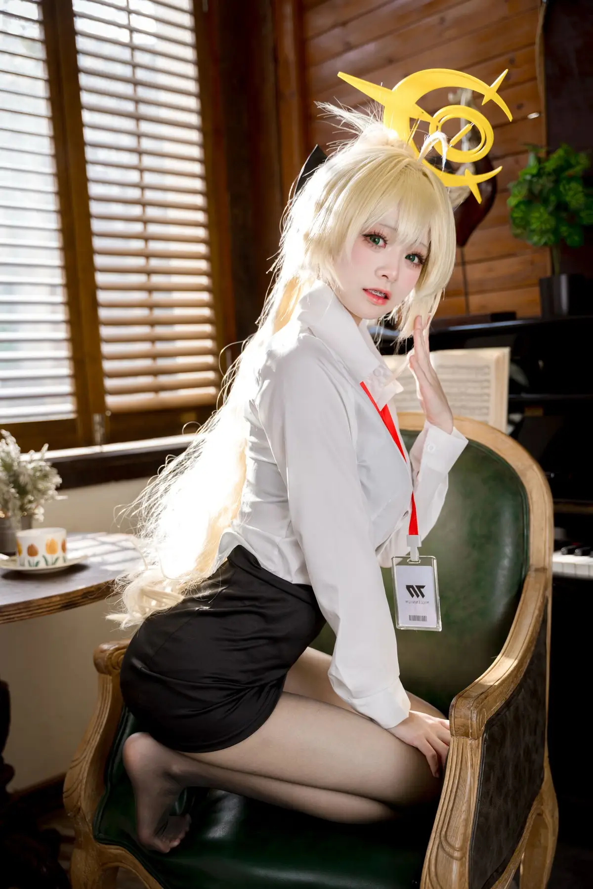 The image showcases Coser Jiu Qi Miao in a creative and captivating Smiling Professor OL uniform. She appears with radiant blonde hair, dressed in a pristine white shirt paired with a striking red tie and an elegant black skirt. Unique highlights include a distinctive golden head accessory and a handcuff cleverly held in her hand, creating an unexpected and intriguing blend of professional appearance and mysterious allure. Her direct gaze and gentle smile exude confidence and invitation. The relaxed pose on the classic armchair further enhances the sophistication and charm of the entire photograph. This is an outstanding transformation, clearly demonstrating Jiu Qi Miao's personality and creativity.#CoserJiuQiMiao #OLProfessor #SeductiveCosplay #OfficeUniform #UniqueStyle