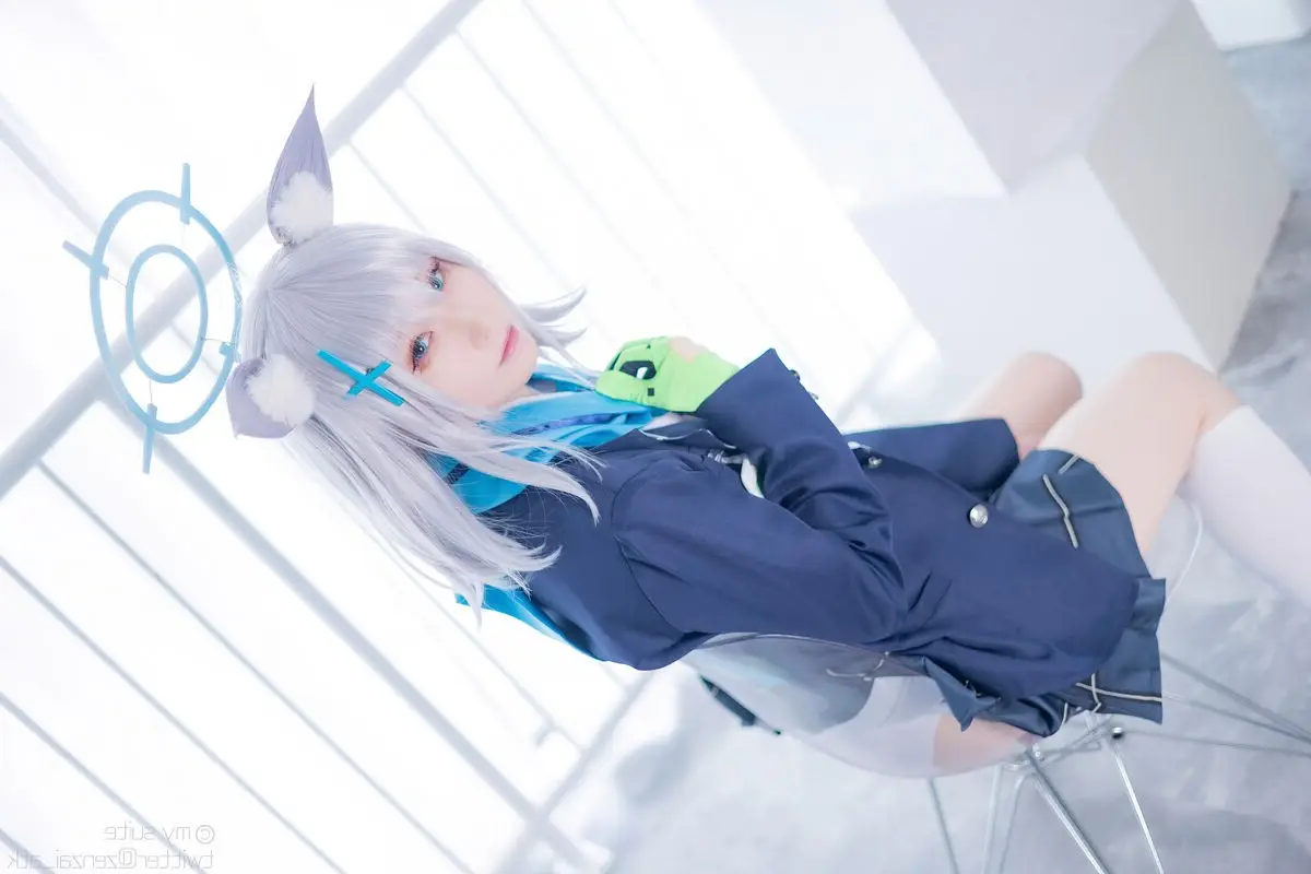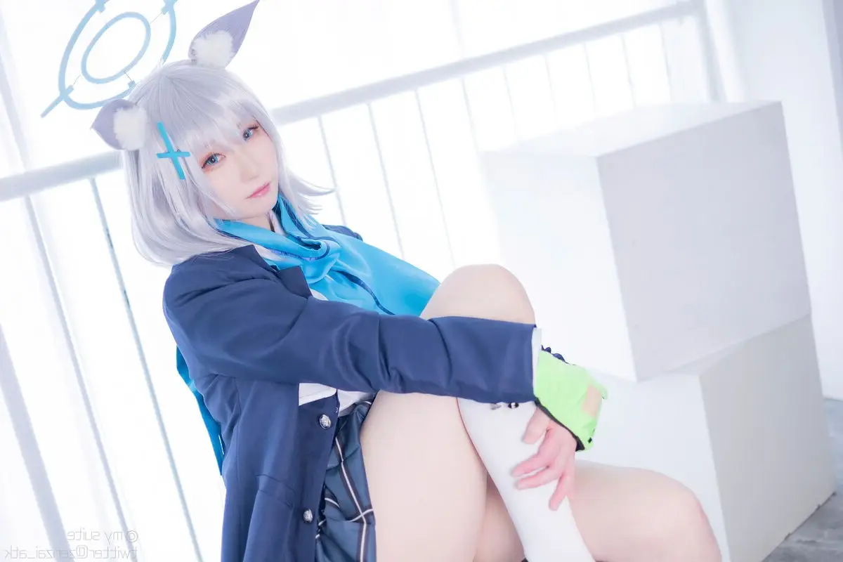 Immerse yourself in the enchanting world of cosplay with Atsuki (あつき) in this captivating Suite Archive 8 Part05 photoshoot. The talented cosplayer masterfully embodies the character, featuring platinum hair, adorable animal ears, and an intricate halo, radiating a beauty that is both innocent and mysterious. Her stylized school uniform, complete with a dark blue jacket, plaid skirt, and white thigh-high socks, creates a unique and charming look. Atsuki's alluring gaze and graceful pose capture every viewer's attention. This image not only showcases meticulous attention to costume detail but also conveys the character's essence authentically, making it impossible to look away from her charming and emotional presence. This is truly a top-tier cosplay, perfectly showcasing Atsuki's undeniable appeal.#CoserAtsuki #AnimeCosplay #AtsukiCosplay #SuiteArchive8 #CuteCosplay
