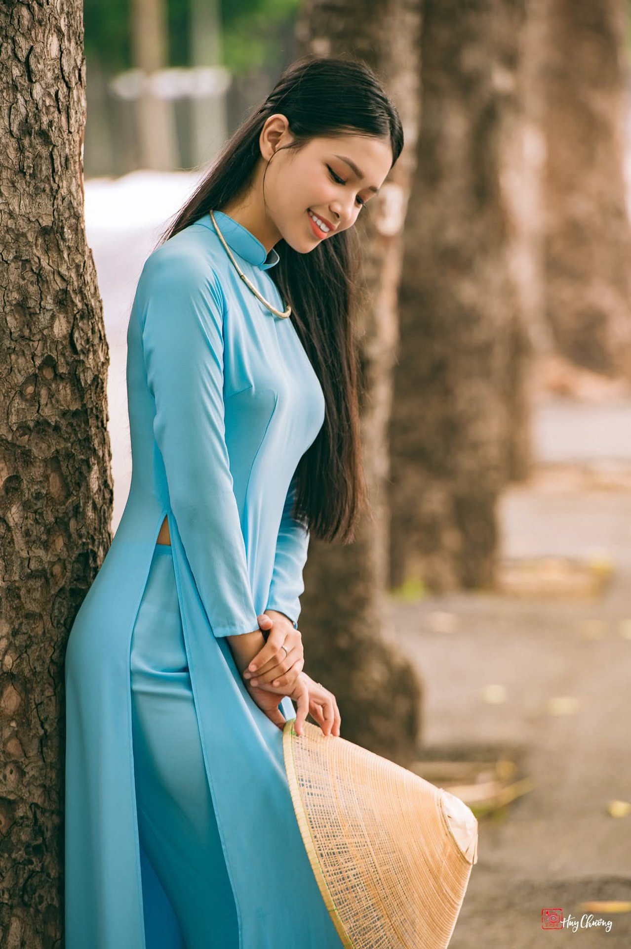 This stunning photograph captures a young and graceful Vietnamese woman elegantly dressed in a modern light blue ao dai. The traditional conical hat on her head not only enhances her gentle beauty but also serves as a profound cultural symbol of the country. With a confident and refined demeanor the girl stands amidst a tree-lined street creating a harmonious scene between humanity and nature. The familiar urban landscape suddenly becomes more poetic thanks to her captivating presence. This is not just a fashion moment but also a tribute to the intertwined modern and traditional beauty of Vietnam. The image evokes a sense of peace and pride in the unique charm of Vietnamese women.