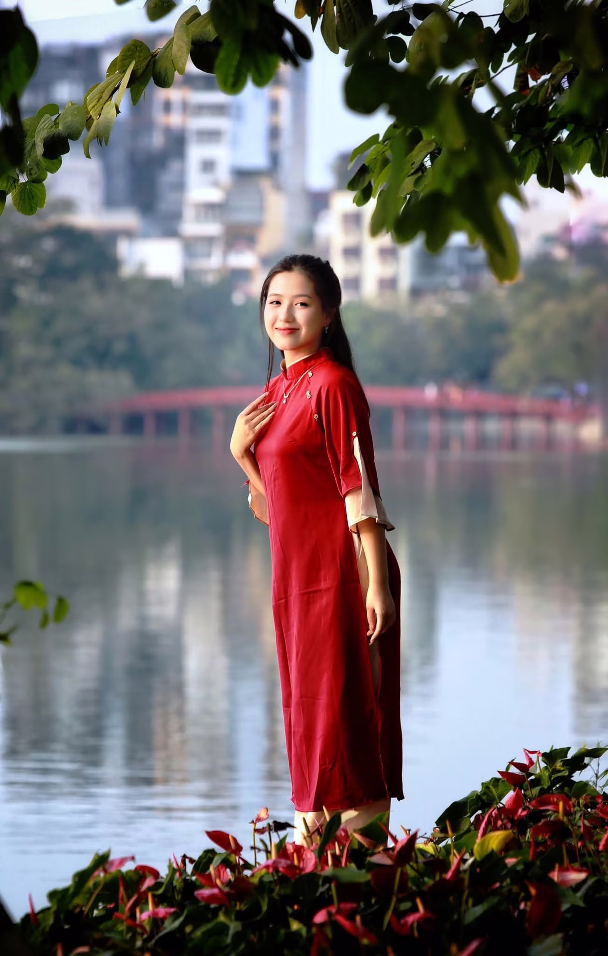 This VGU No.106 photograph captures the exquisite beauty of a graceful Vietnamese woman, radiating elegance and charm. She dons a vibrant red attire, subtly evoking traditional aesthetics with a modern flair. Her poised stance and captivating gaze perfectly complement the poetic scenery of Hoan Kiem Lake, the iconic heart of Hanoi. In the background, the serene lake reflects the gentle sunlight, alongside the characteristic red bridge and distant city skyline, creating a harmonious blend of heritage and urban development. This image not only celebrates the allure of Vietnamese women but also serves as an invitation to explore the rich culture and distinctive landscapes of Hanoi, offering an unforgettable experience for anyone who beholds it. #Vietnamese #pretty #charmVGU No.88: Captivating Elegance A Young Woman's Gentle Beauty with a Lotus Bouquet