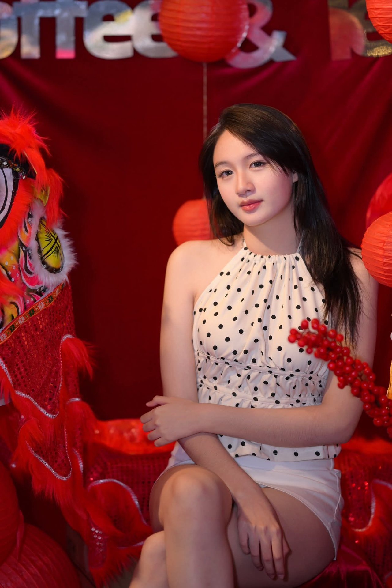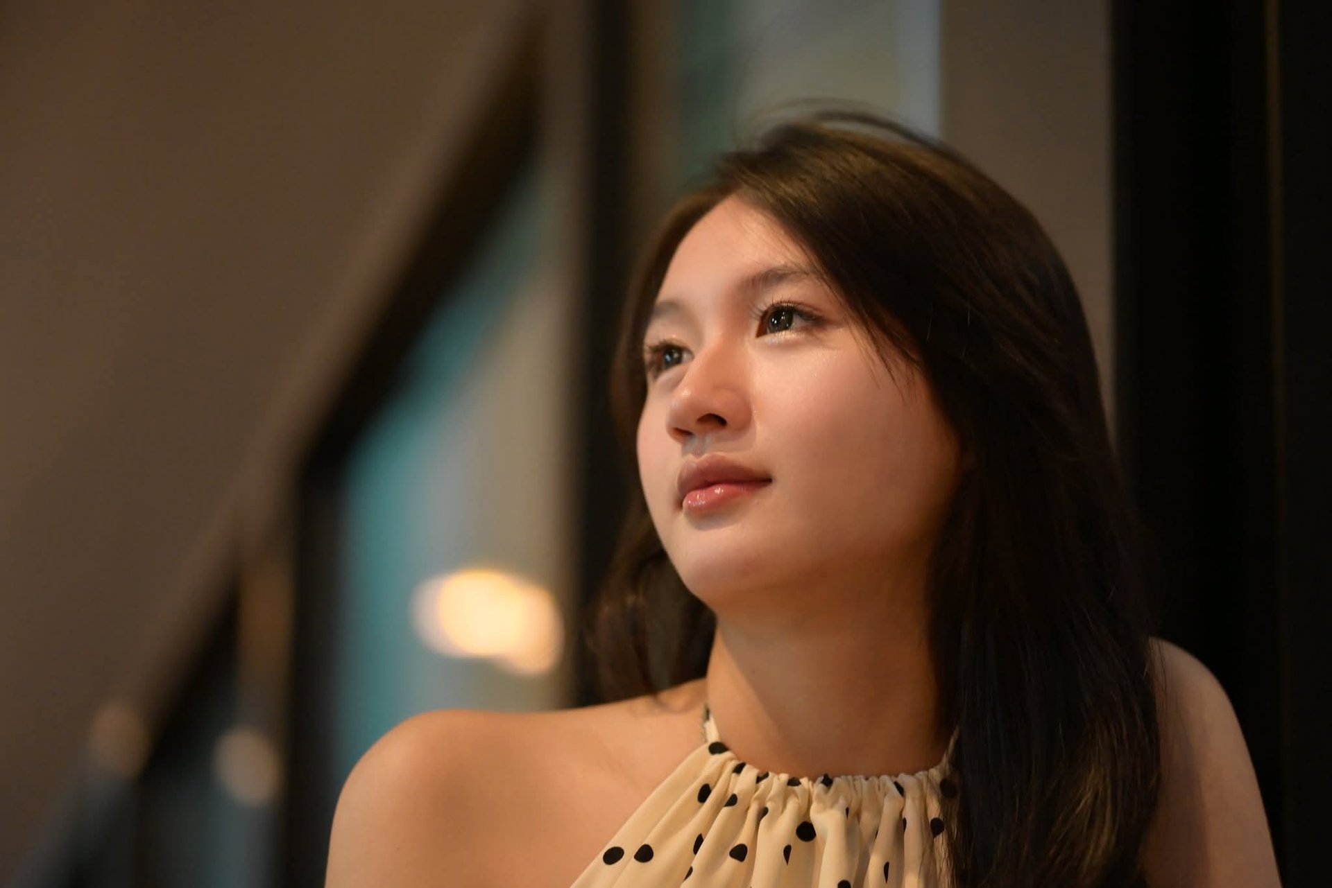 This captivating photo captures a serene moment of a young Vietnamese woman, exuding elegant and graceful beauty. She features long, smooth hair, fair skin, and a contemplative gaze, suggesting gentle introspection. Her stylish polka-dot halter top highlights a youthful, modern aesthetic. The softly blurred background hints at a cozy indoor setting, possibly a chic cafe or restaurant within a vibrant city. This image not only celebrates the natural charm of Vietnamese women but also portrays a sense of peace and sophistication in contemporary life. It's an ideal portrait for content related to lifestyle, fashion, or the inherent beauty of Vietnamese people, perfect for promoting urban female imagery.