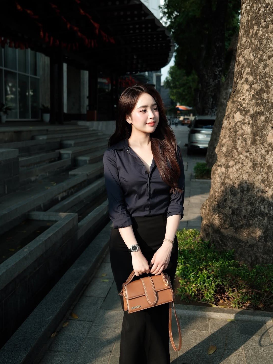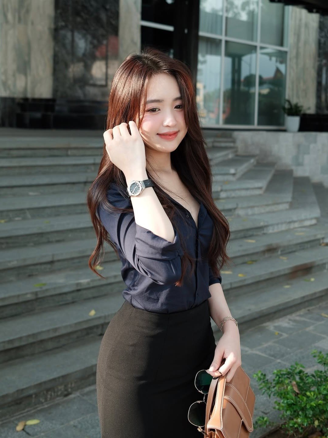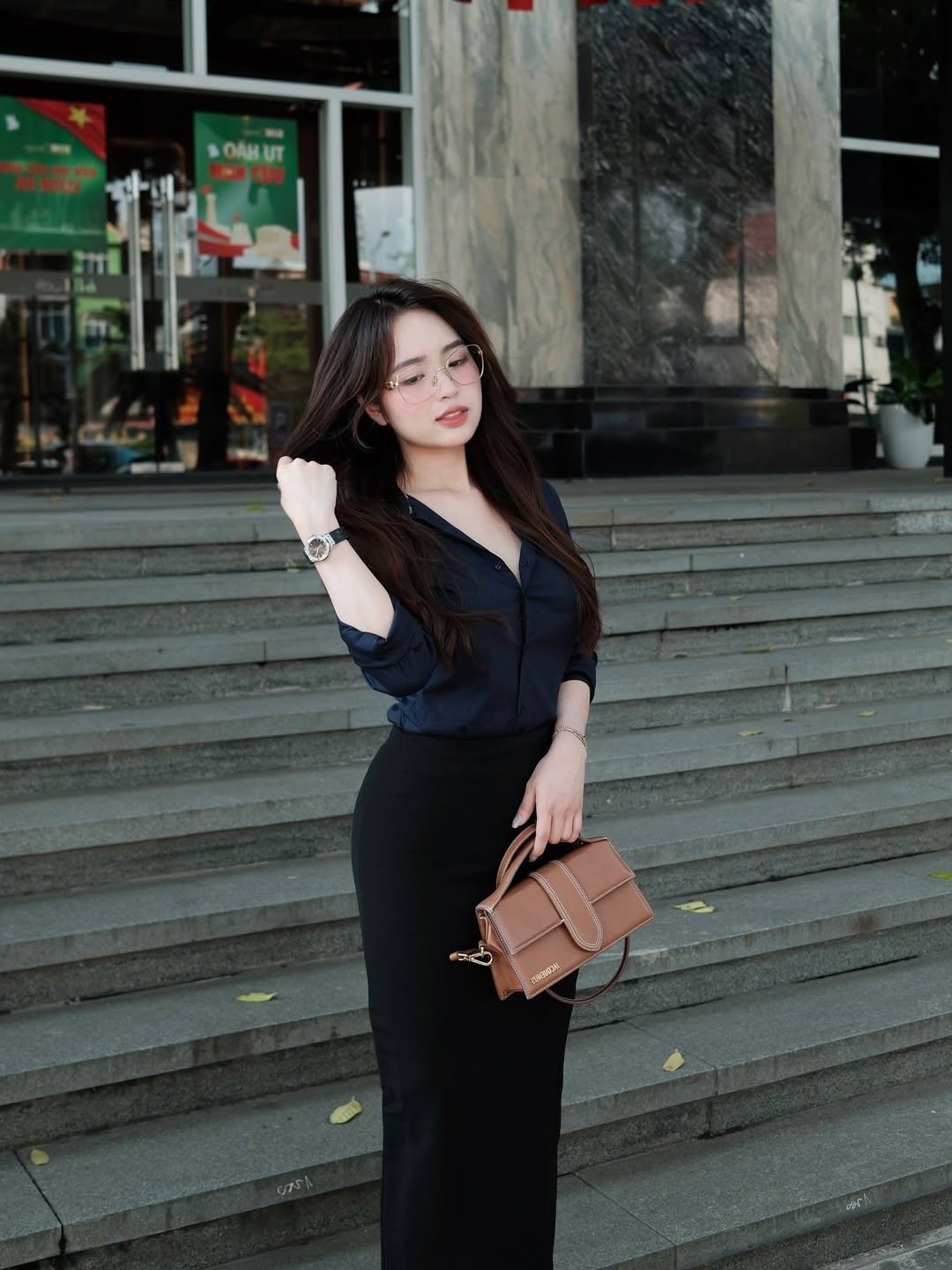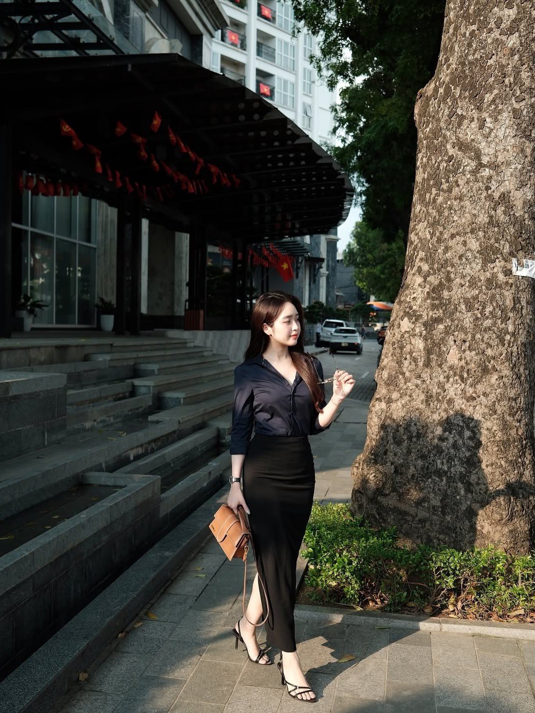 This exquisite photograph beautifully captures an office lady radiating confidence and grace effortlessly drawing every eye. Her impeccable office fashion choice features an elegant dark shirt paired with a long subtly slit black pencil skirt skillfully accentuating her slender silhouette and modern aesthetic. Thoughtful details such as her chic brown handbag and stylish high heels perfectly complete her professional ensemble exuding an air of refined sophistication. As she takes a gentle stroll along the urban street the woman embodies not only self-assured independence but also a captivating positive energy. This image serves as a wonderful source of inspiration for women aspiring to cultivate an office fashion style that is both elegantly polished and a powerful expression of their unique personality.