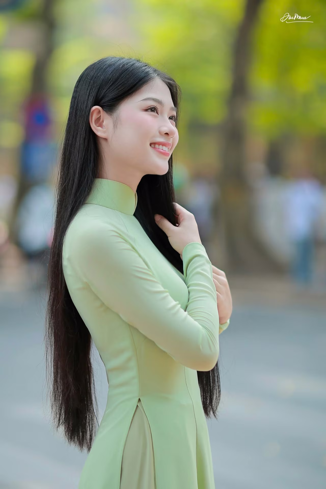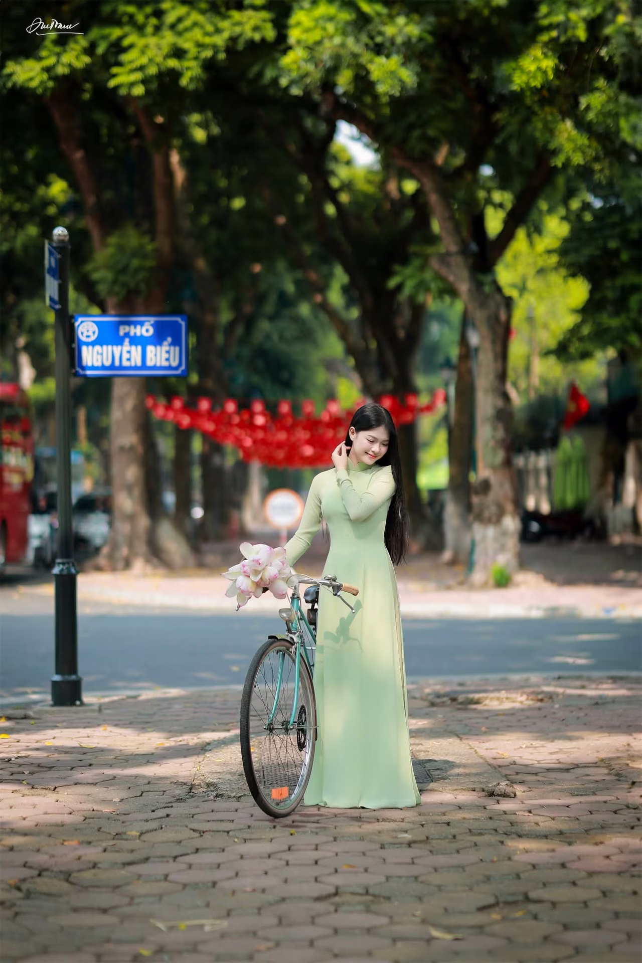 This image XVG No48 captures a beautiful moment of a Vietnamese girl in a gentle light green Ao Dai. Her radiant smile blends with traditional beauty creating a captivating and serene image. Standing beside a vintage bicycle adorned with colorful fresh flowers the girl exudes elegance and the distinctive grace of Vietnamese women. The tree-lined street with vibrant red lanterns in the distance evokes a nostalgic and poetic atmosphere. This is a perfect fusion of human beauty natural scenery and the unique cultural essence of Vietnam. The photograph is not just a mere moment but a story of tranquility eternal beauty and the Vietnamese soul.XVG No.35: Vintage Artistic Muse – Dreamy and Pure Beauty