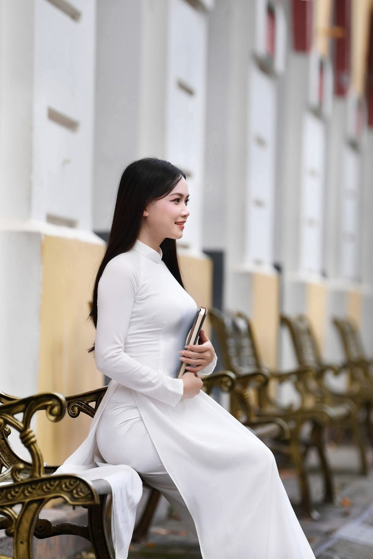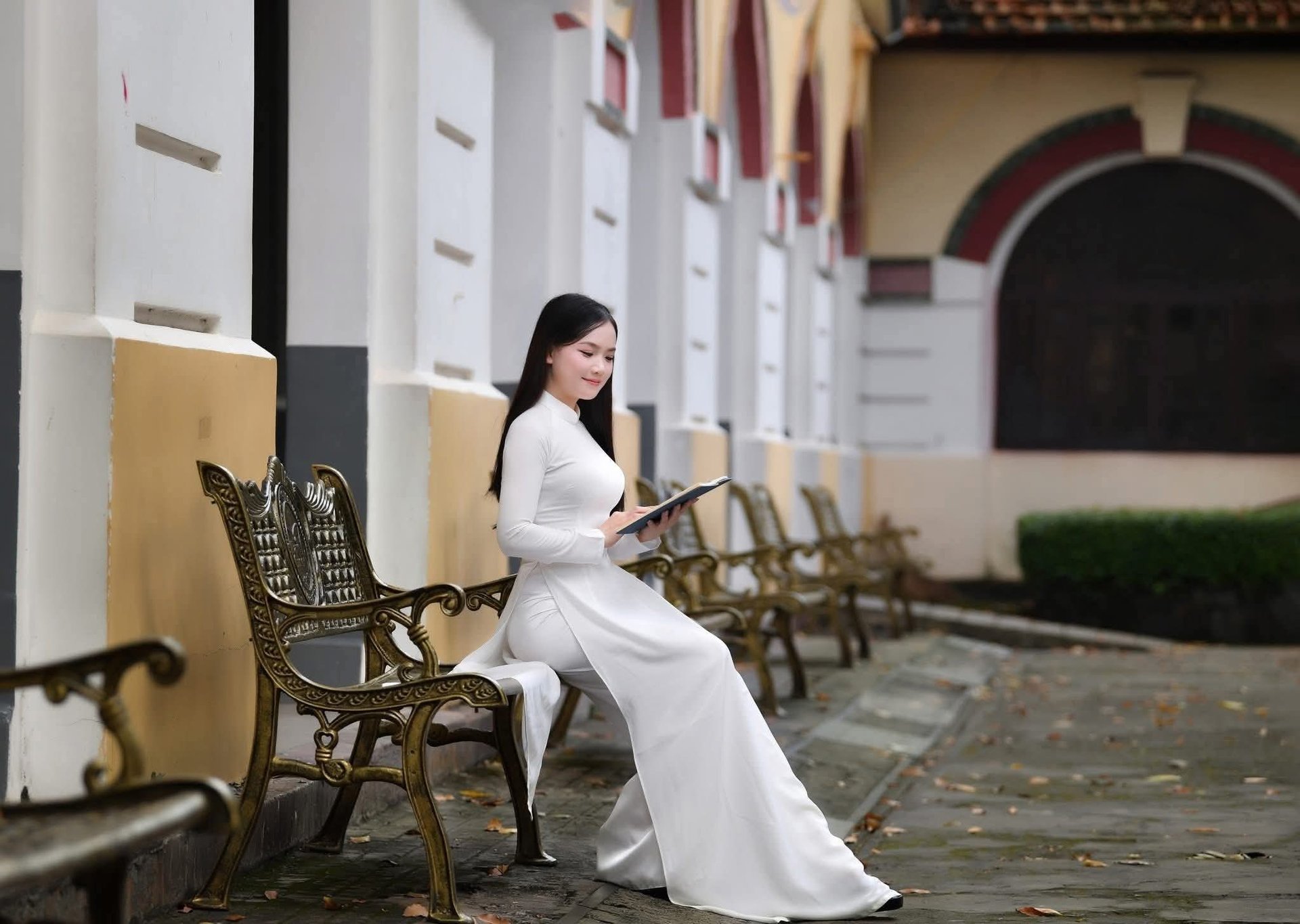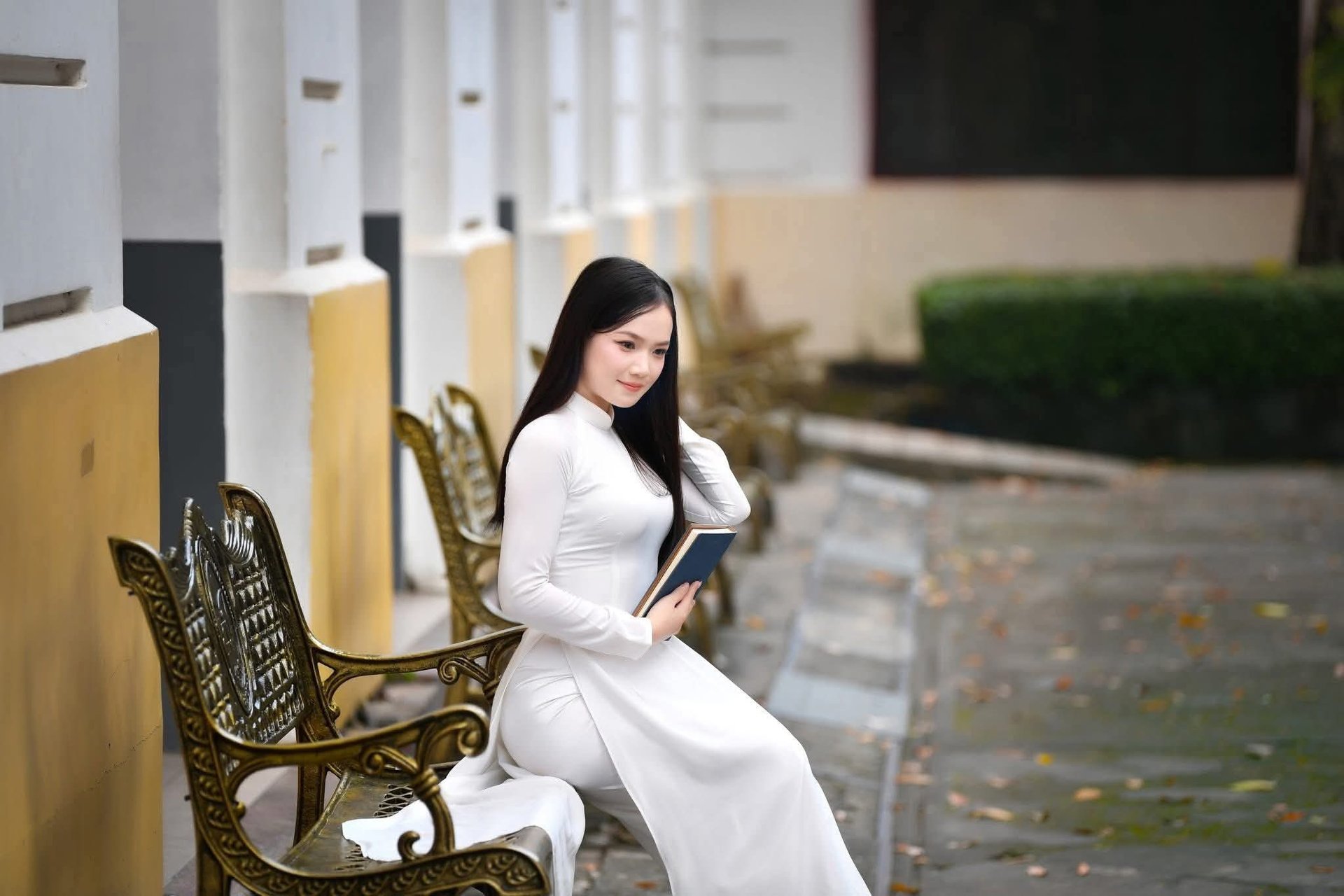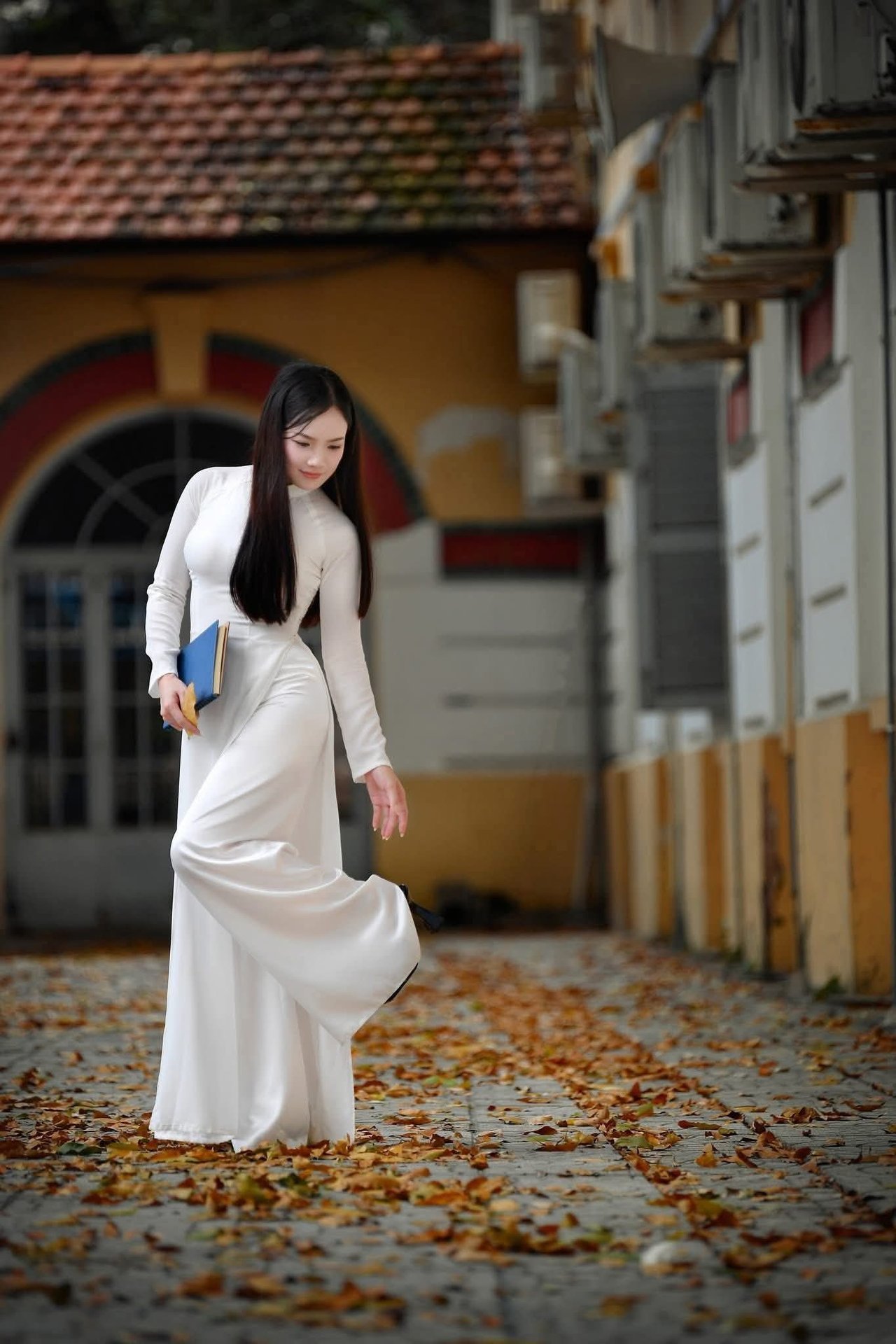 This captivating image features an elegant schoolgirl gracefully walking through a classic vintage-style hallway Dressed in a chic school uniform the young woman is engrossed in a book embodying the poetic essence of youth and intellectual pursuit Soft light filtering through the large windows enhances her dreamy contemplative demeanor The old architectural hallway evokes nostalgic memories of student days a place where knowledge and dreams are nurtured This portrayal of a girl with her book is not merely a symbol of learning but also a captivating blend of cultural beauty and timeless vintage styleElegant Vietnamese student in white Ao Dai reading, timeless beauty amidst classic architecture.