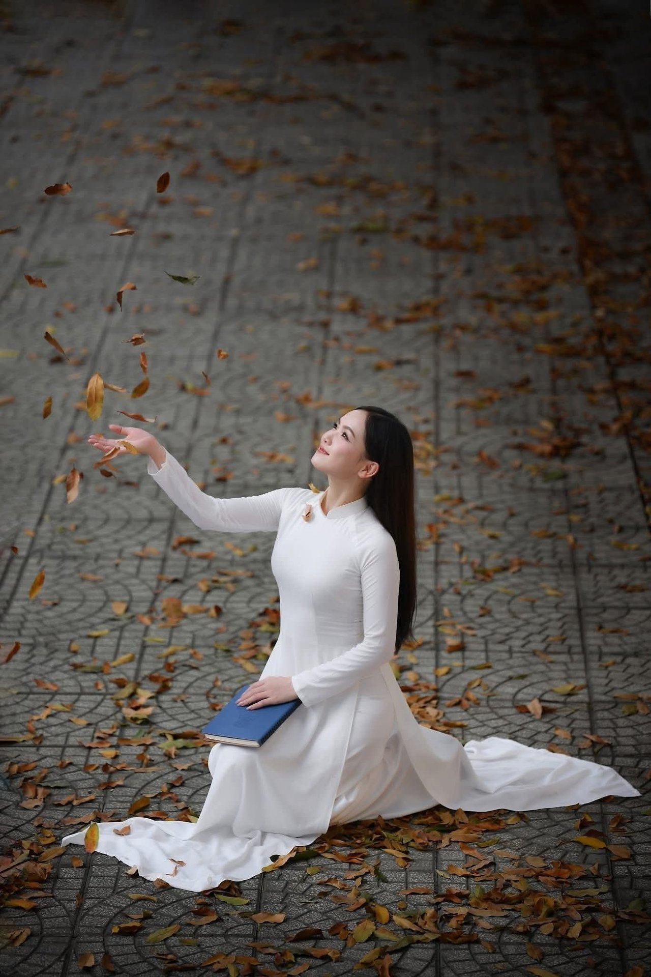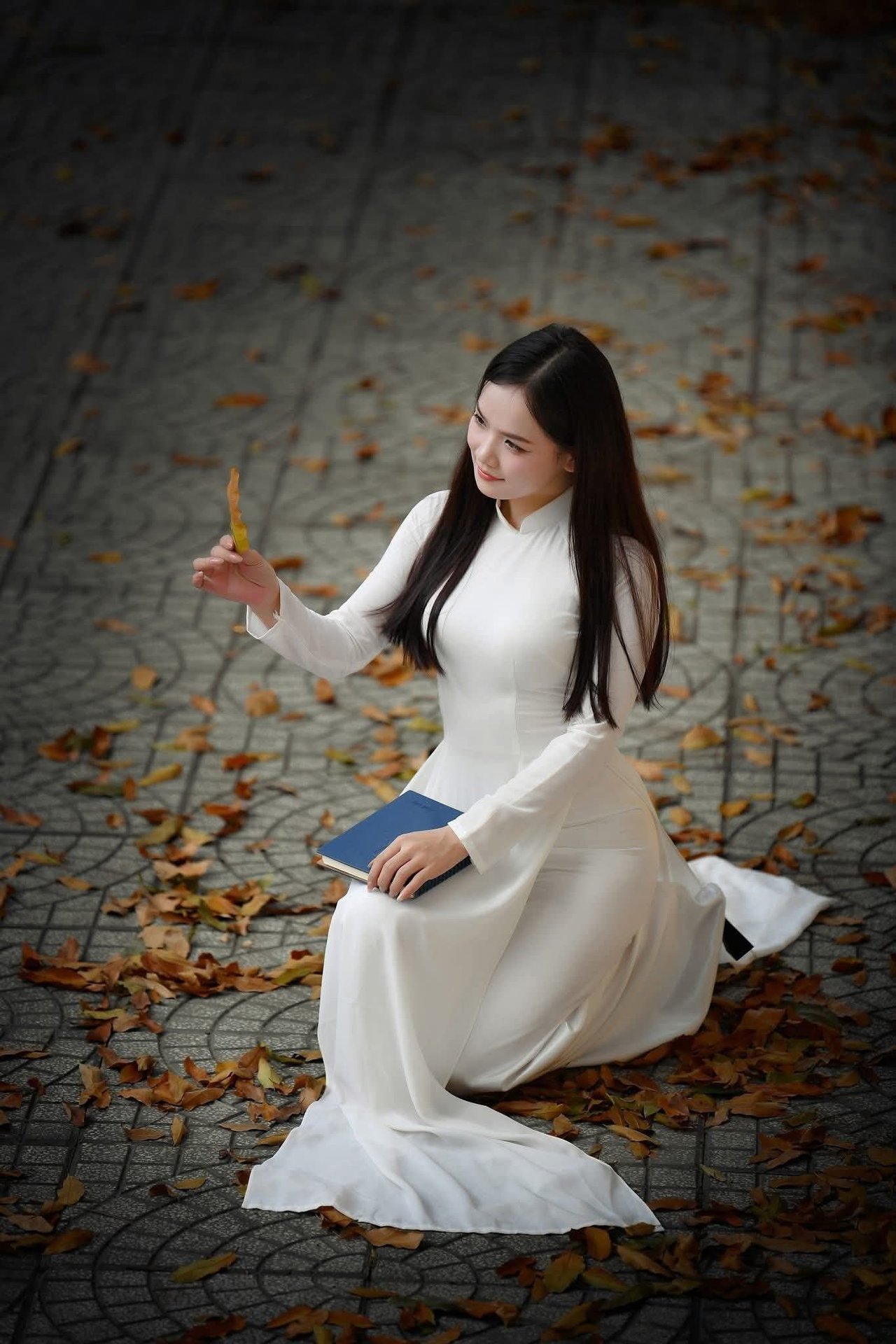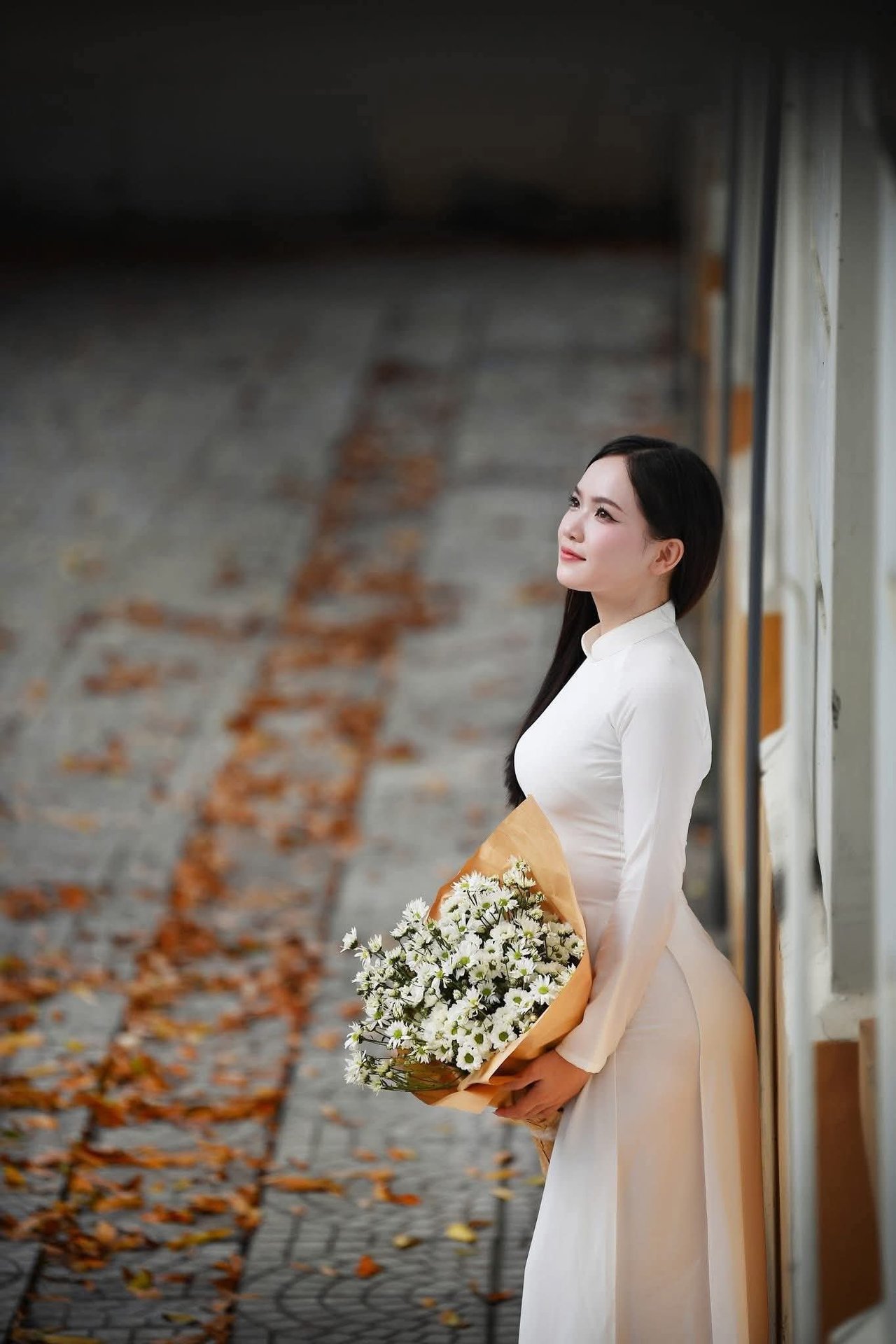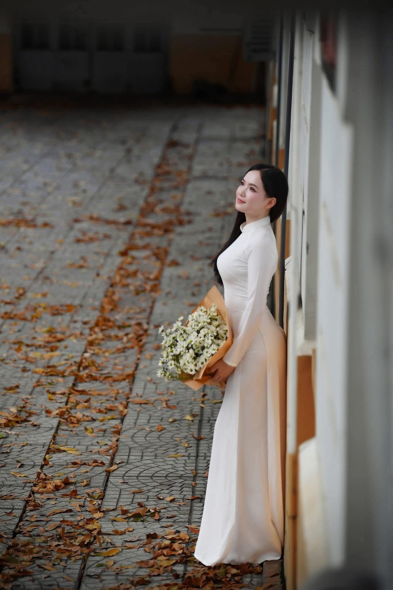 This captivating image features an elegant schoolgirl gracefully walking through a classic vintage-style hallway Dressed in a chic school uniform the young woman is engrossed in a book embodying the poetic essence of youth and intellectual pursuit Soft light filtering through the large windows enhances her dreamy contemplative demeanor The old architectural hallway evokes nostalgic memories of student days a place where knowledge and dreams are nurtured This portrayal of a girl with her book is not merely a symbol of learning but also a captivating blend of cultural beauty and timeless vintage styleElegant Vietnamese student in white Ao Dai reading, timeless beauty amidst classic architecture.