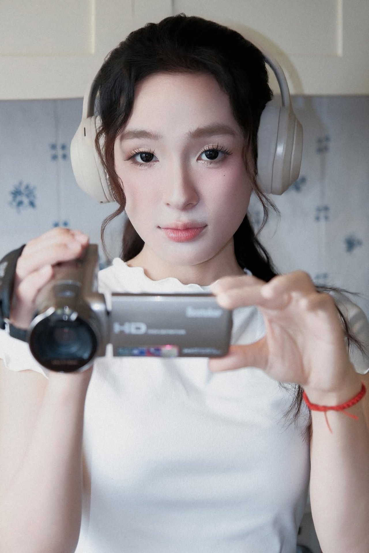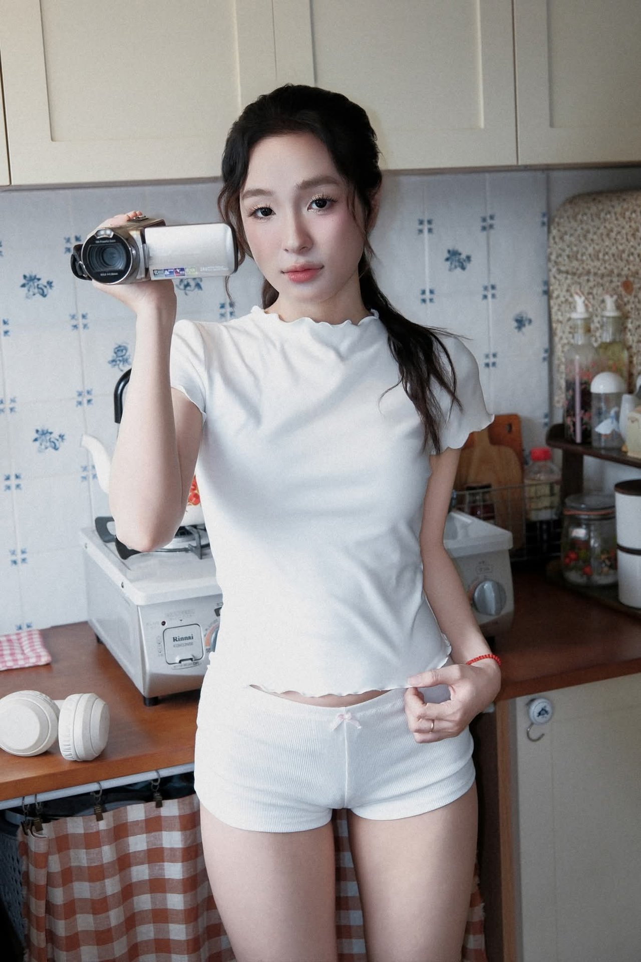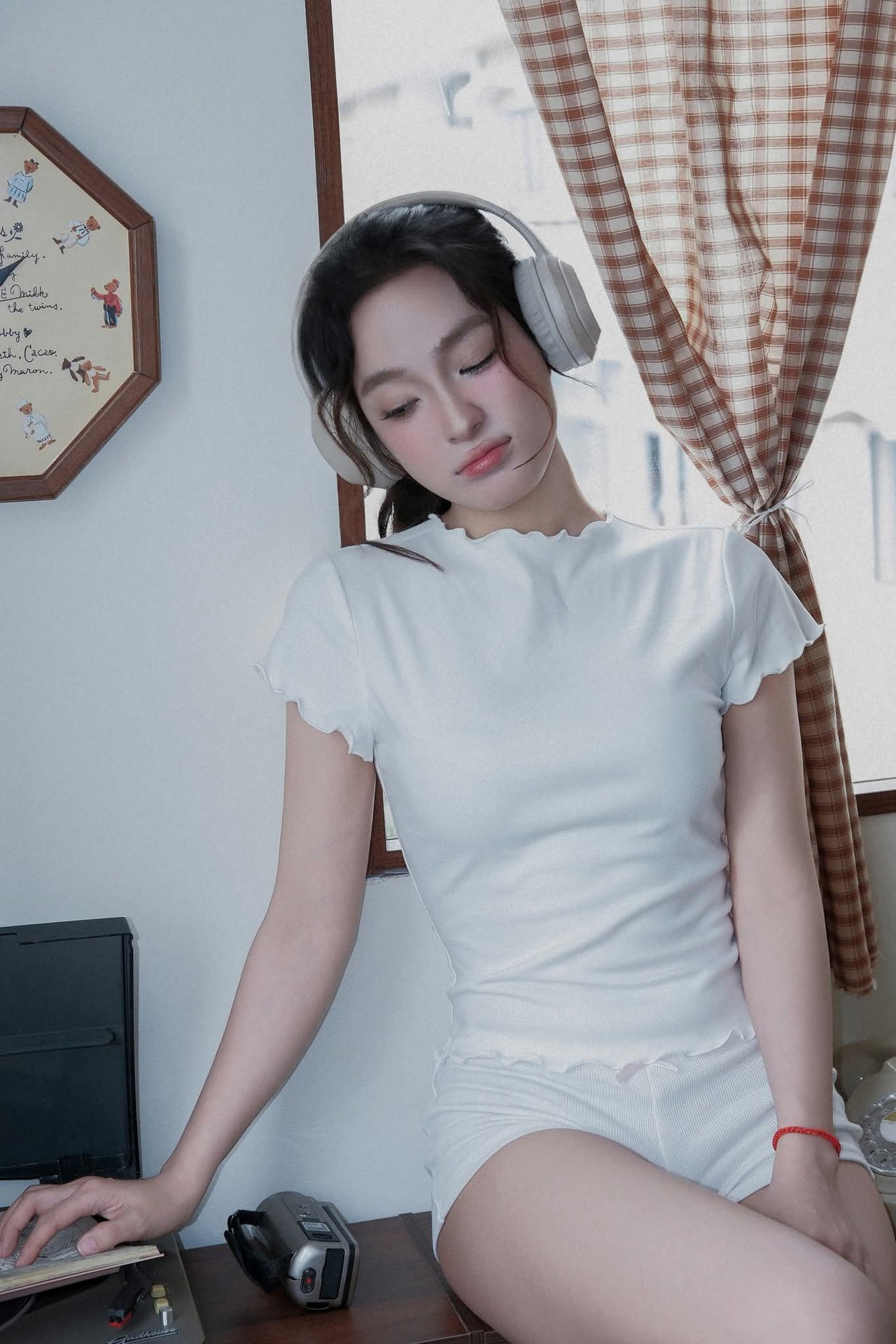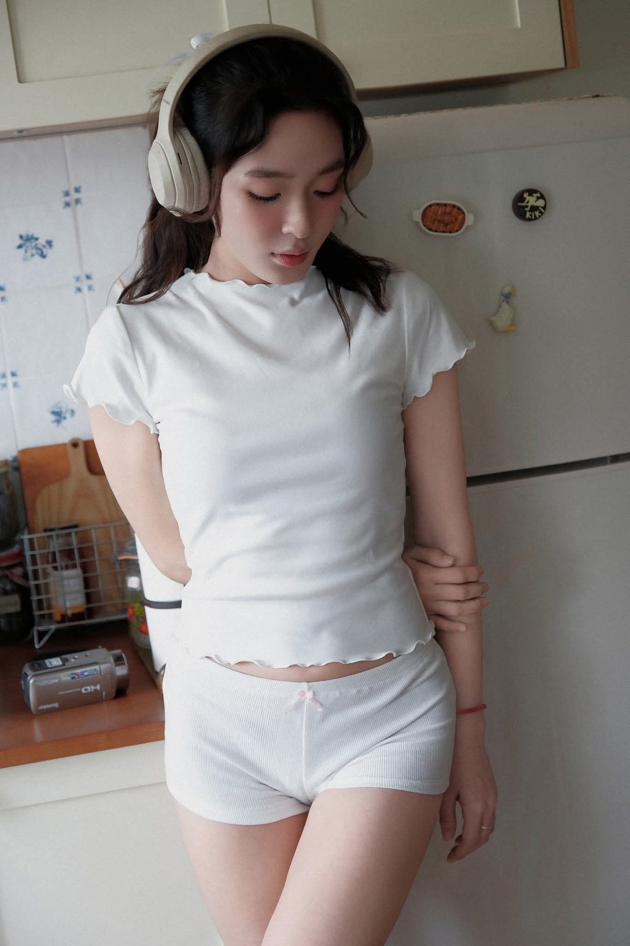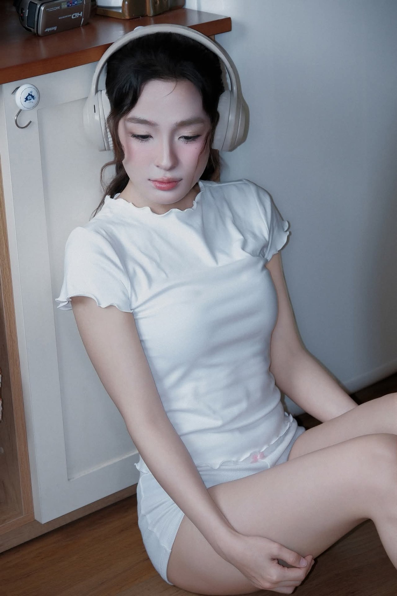 This image captures a serene moment of a young woman unwinding at home. Sitting comfortably on the warm wooden floor in a familiar kitchen setting, she is immersed in her world of music through headphones. Her simple, comfortable attire of a white t-shirt, shorts, and socks highlights her natural beauty and relaxed state. In the background, a vintage refrigerator and a tidy kitchen space create a cozy, inviting atmosphere, reflecting a comfortable home lifestyle. This scene evokes a feeling of tranquility, enjoying private moments away from life's hustle and bustle. It's an ideal depiction of recharging, listening to oneself, and finding peace within the comfort of one's own home.Vintage Ao Dai Beauty: Elegant Vietnamese Woman with Flowers in a Nostalgic Setting