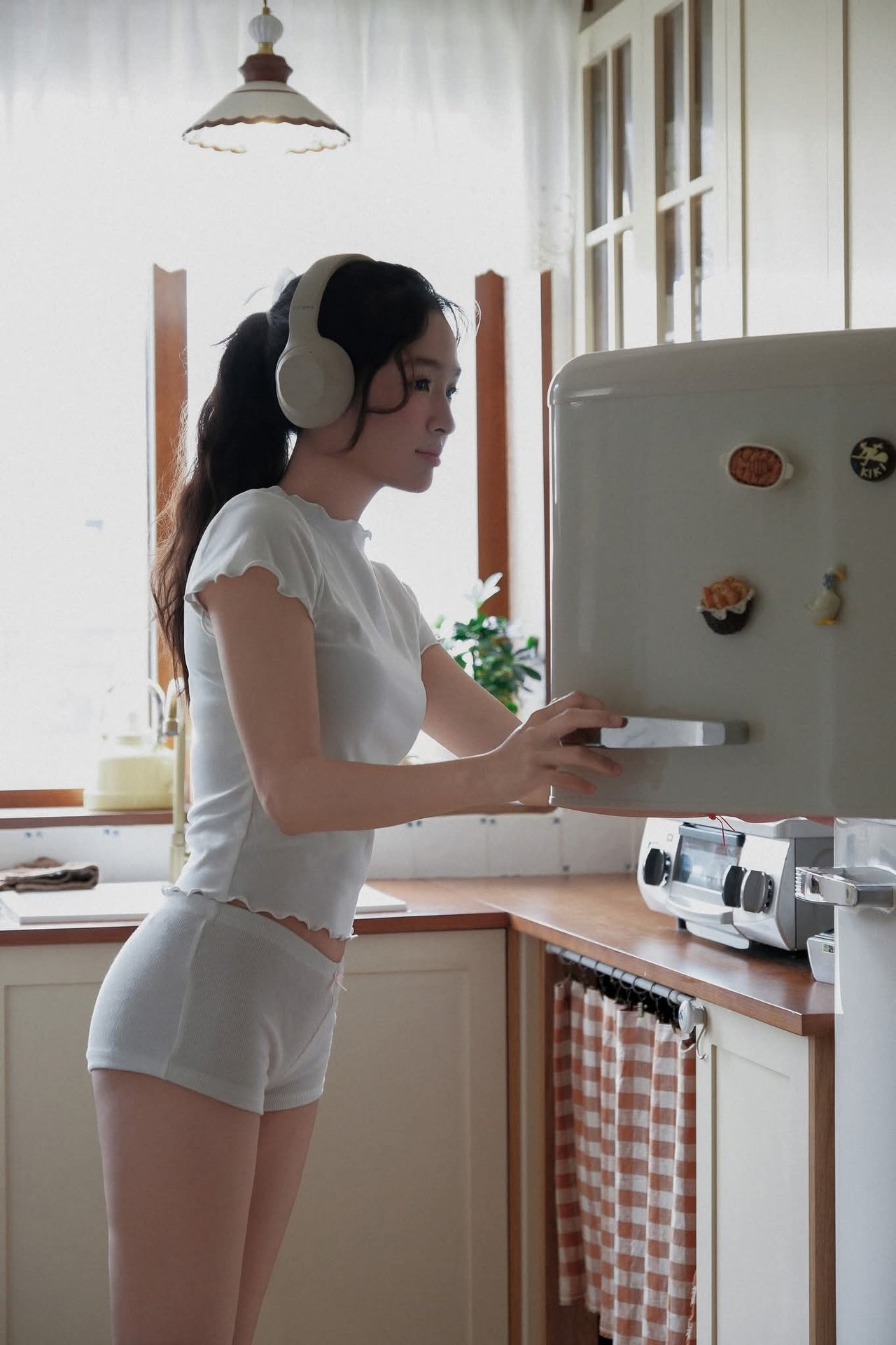 This captivating photograph captures a serene moment of a Vietnamese student adorned in a pristine white Ao Dai. Seated gracefully on an ornate vintage bench, she is engrossed in a book, embodying intellectual beauty and pure elegance. The traditional white Ao Dai drapes elegantly, accentuating her slender figure and highlighting the gentle modest charm of Vietnamese women. The backdrop features classic architecture with weathered columns and tiled roofs, creating a nostalgic and romantic ambiance. This image not only celebrates the timeless beauty of the Ao Dai but also portrays peace wisdom and the distinctive cultural essence of Vietnam. It is a truly cherished and emotional moment.Young Woman Relaxing with Headphones & Music in Cozy Kitchen: Serene Home Lifestyle Moment