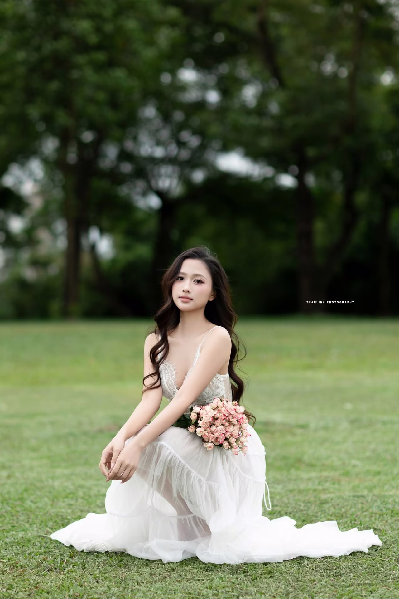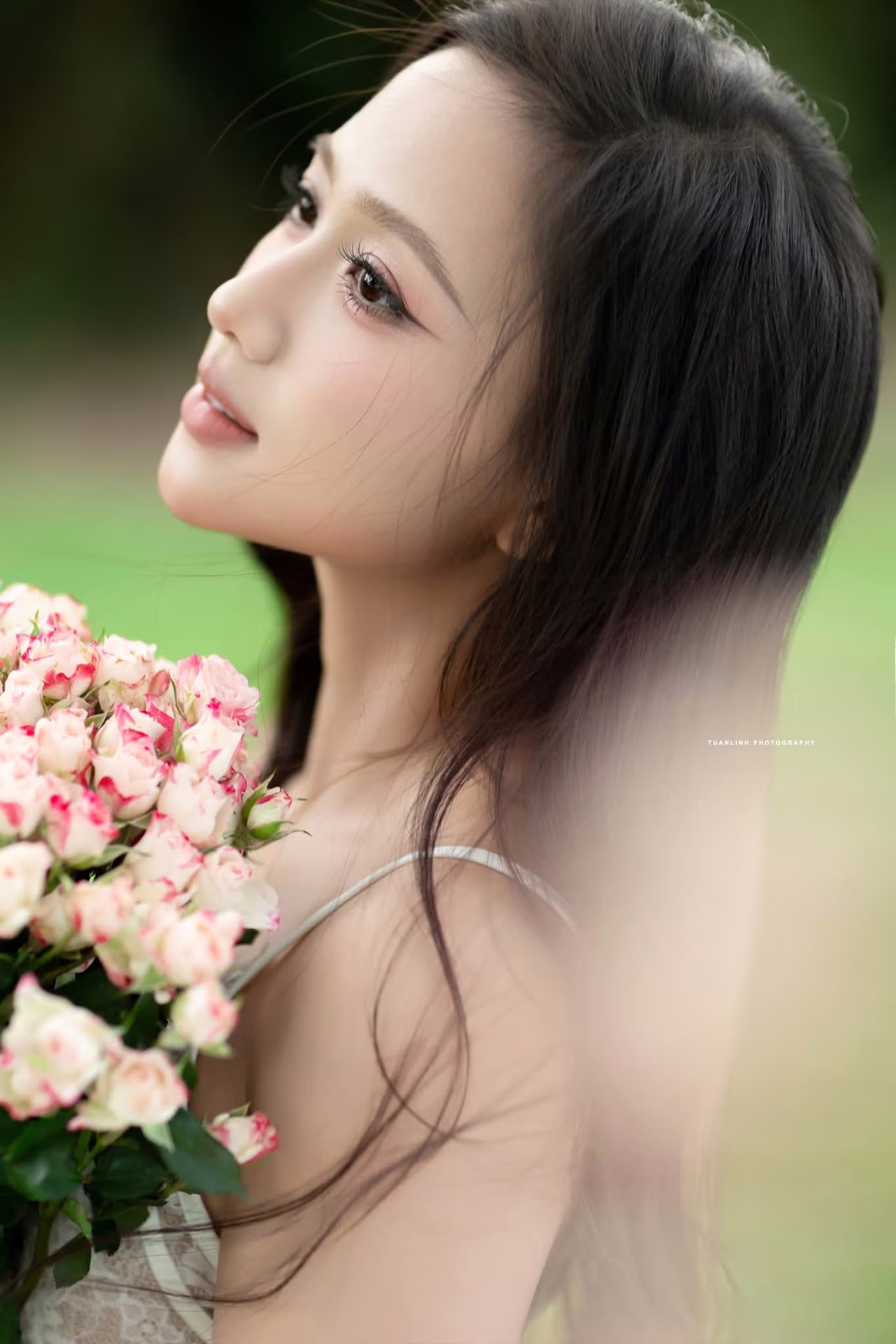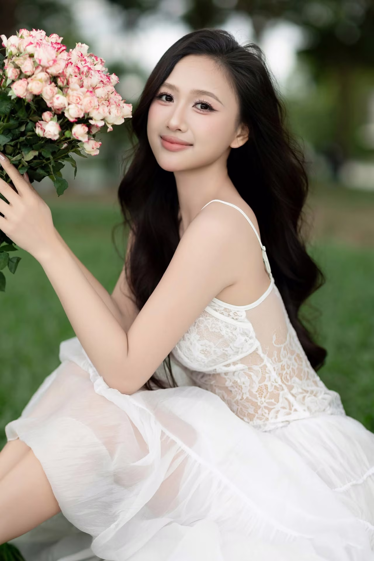 The VGU No.98 image captures the gentle and elegant beauty of a vibrant young woman. Dressed in a pristine white gown she exudes grace and sophistication. Her long flowing hair and soft smile create a captivating aura. She stands beside a vase of lush fresh flowers with blooming pink roses evoking freshness and romance. The entire scene is delicately arranged against an artistic backdrop highlighting the subject's natural beauty and luxurious fashion style. This image embodies pure femininity and the harmonious blend of human elegance with natural splendor. #Vietnamese #pretty #charmVGU No.97: Effortless Summer Charm: A Picnic Beauty Embracing Natural Serenity