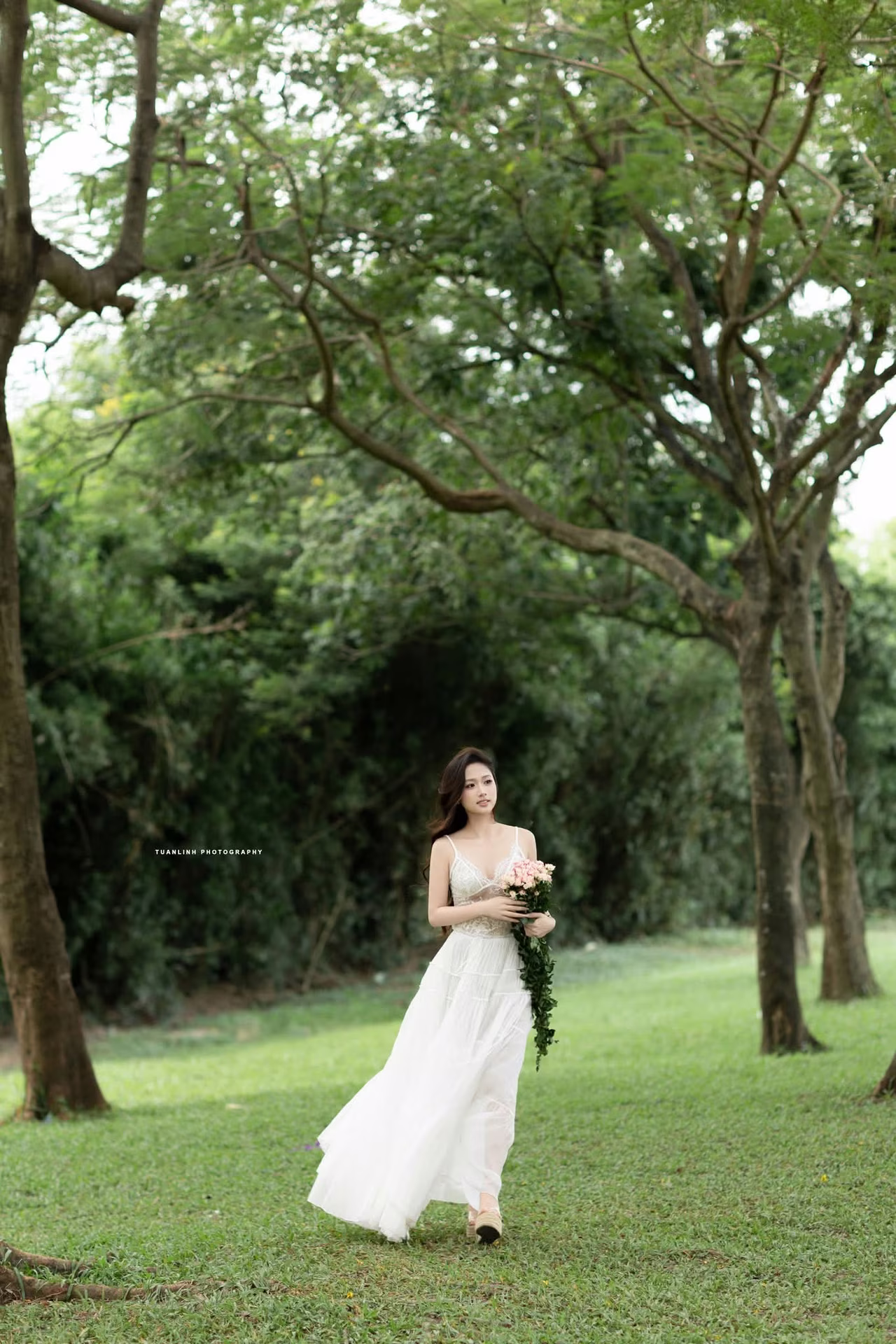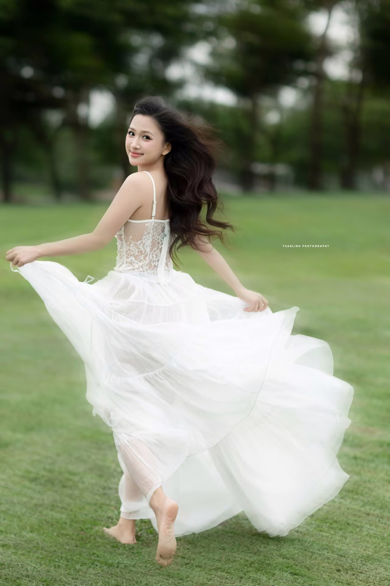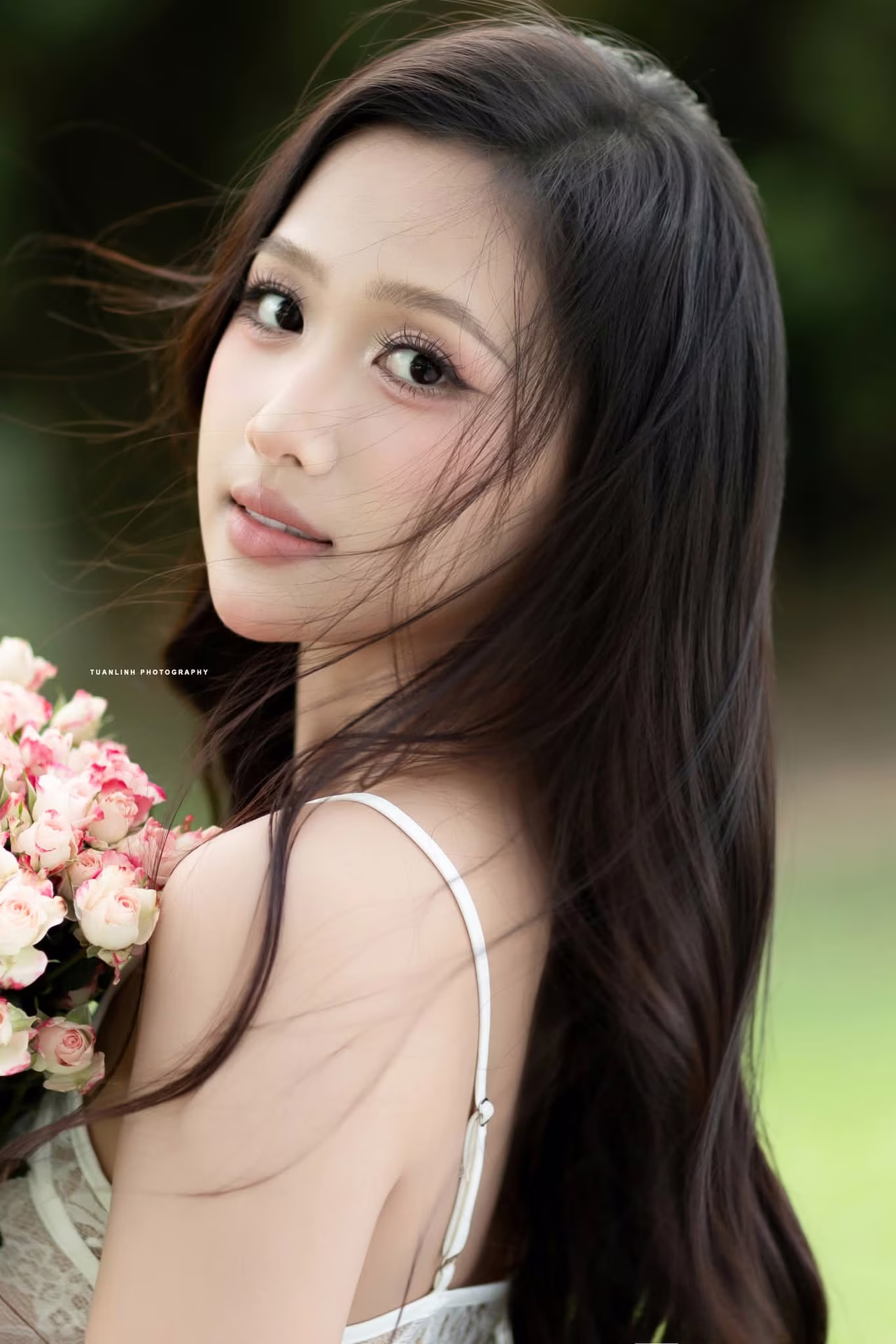 The VGU No.98 image captures the gentle and elegant beauty of a vibrant young woman. Dressed in a pristine white gown she exudes grace and sophistication. Her long flowing hair and soft smile create a captivating aura. She stands beside a vase of lush fresh flowers with blooming pink roses evoking freshness and romance. The entire scene is delicately arranged against an artistic backdrop highlighting the subject's natural beauty and luxurious fashion style. This image embodies pure femininity and the harmonious blend of human elegance with natural splendor. #Vietnamese #pretty #charmVGU No.97: Effortless Summer Charm: A Picnic Beauty Embracing Natural Serenity