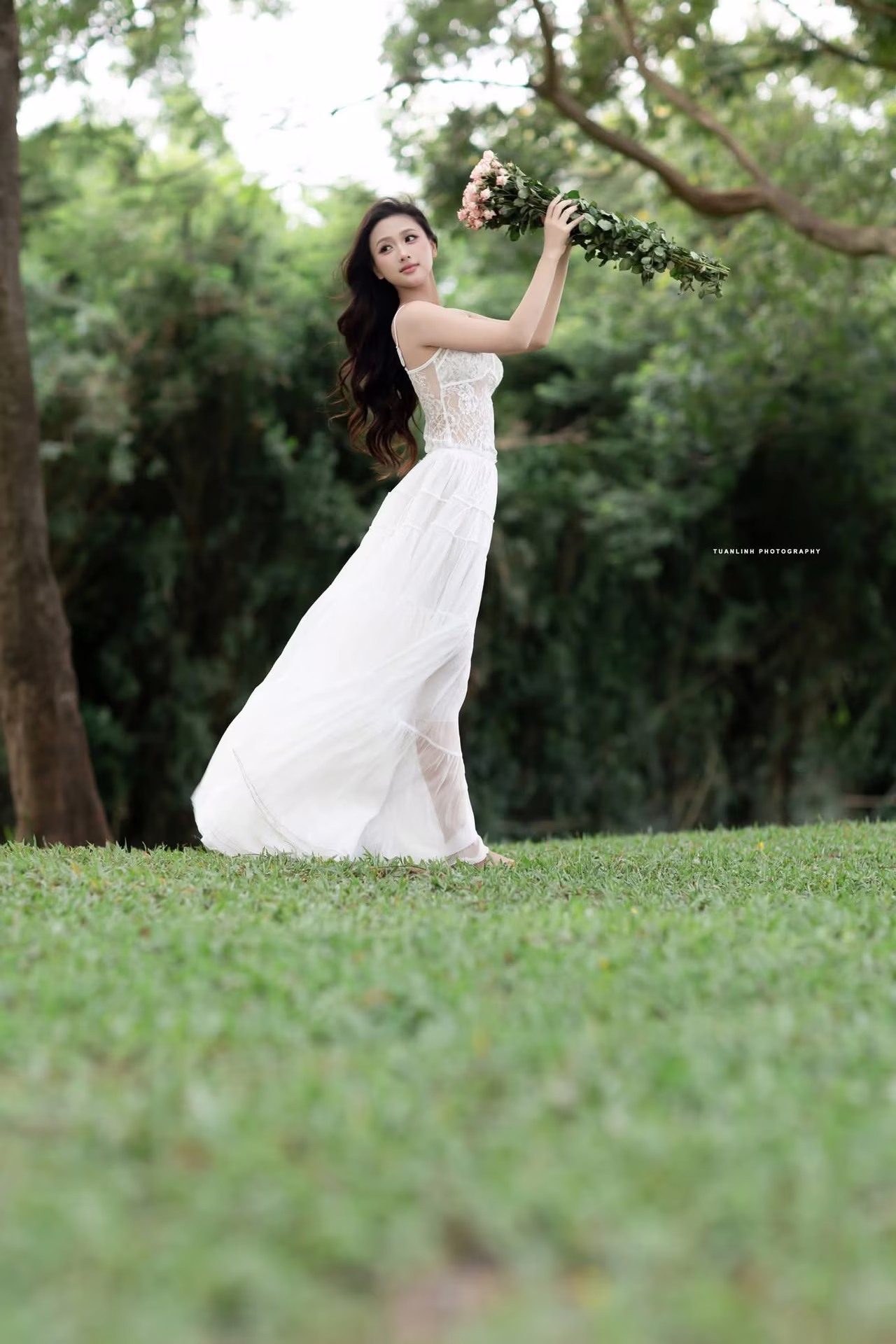 Amidst a breathtaking mountainous backdrop, an elegant figure emerges gracefully from a vast field of swaying pampas grass. Her pristine white backless dress accentuates a sense of delicate freedom and timeless beauty. Soft natural light bathes the scene creating a poetic tableau where the woman's serene charm harmonizes perfectly with the tranquil landscape. Her gentle gaze and subtle pose evoke an air of mystery and allure inviting viewers to immerse themselves in this peaceful dreamlike setting. It is a moment of pure serenity found within nature. #Vietnamese #pretty #charmVGU No.98: Elegant Beauty in White Dress with Fresh Flowers – A Timeless Allure.