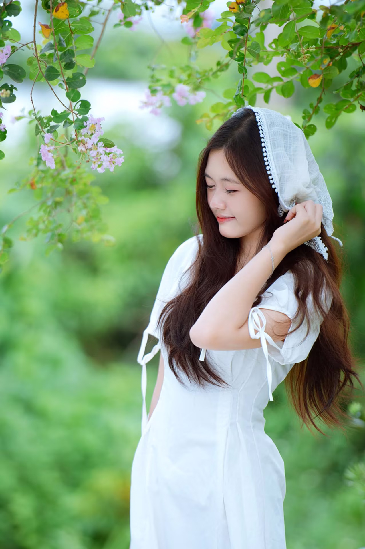 VGU No76 captures a serene moment of a beautiful young woman amidst a vibrant green natural setting Her long flowing hair and pristine white dress exude a pure and gentle charm The delicate lace veil softly adorning her head enhances her graceful and innocent appeal A subtle smile and a dreamy gaze towards the distance create a profound connection with the surrounding environment The fresh green hues of the leaves and tiny blossoms serve as a perfect backdrop for her clear beauty This image radiates vitality and tranquility offering a sense of peace to the viewer It celebrates the harmonious blend of human beauty and the splendor of Vietnamese nature #Vietnamese #pretty #charmVGU No.75: Elegant Youthful Fashion A Charming Duo's Stylish Summer Look