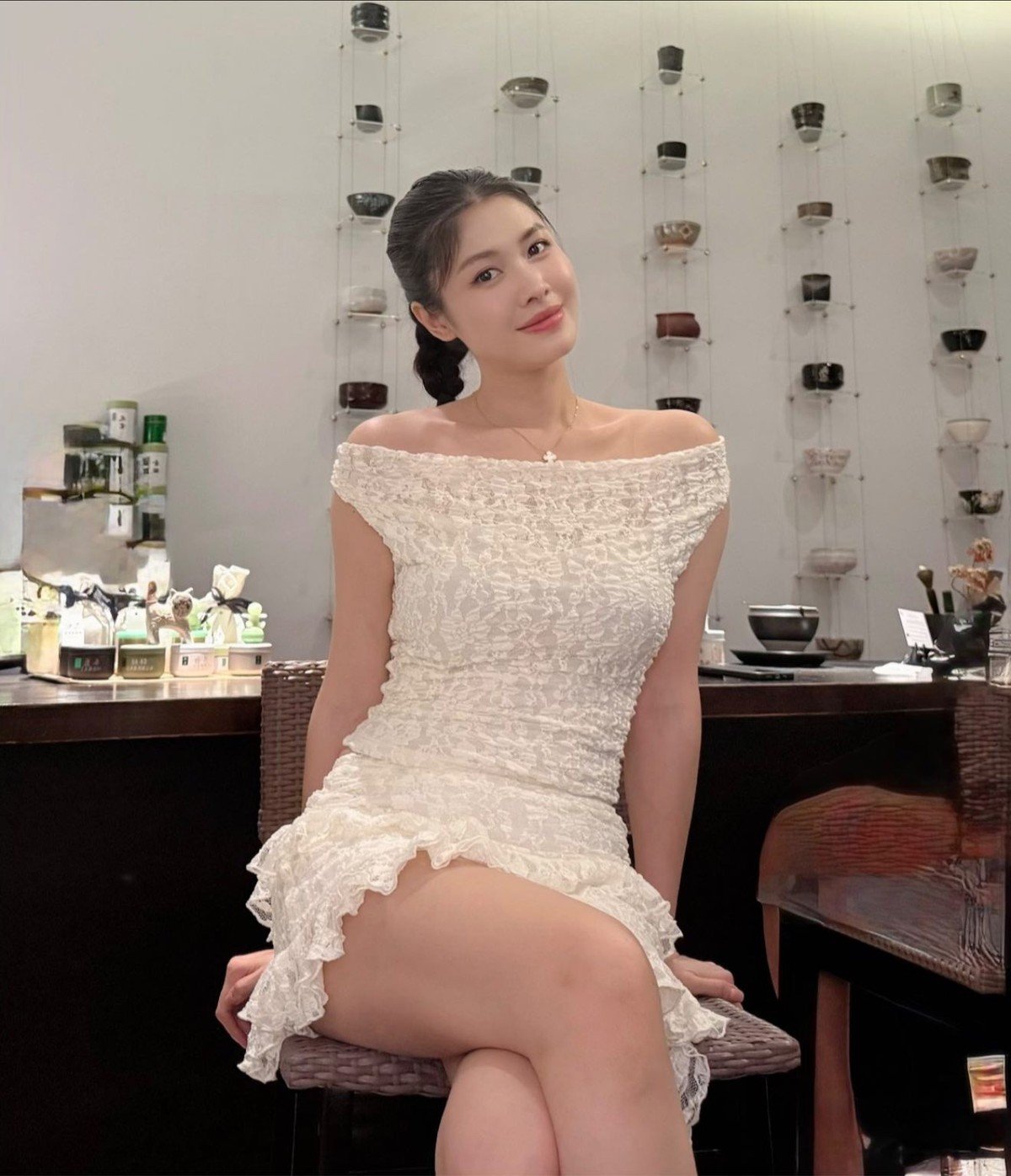 Thuy Anh, singer Dang Khoi's wife, makes a strong impression with her timeless beauty and radiant demeanor. Despite being a mother of three, she maintains an admirable slender figure and youthful appearance. Dressed in a classic white and black polka dot dress, Thuy Anh exudes femininity, elegance, and sophistication. The gown not only accentuates her physique but also showcases her exquisite and timeless fashion sense. Her gentle smile and captivating gaze further highlight Thuy Anh's natural and graceful charm. She is a vivid testament to the image of a modern, successful woman who knows how to take care of herself and always shines brightly.