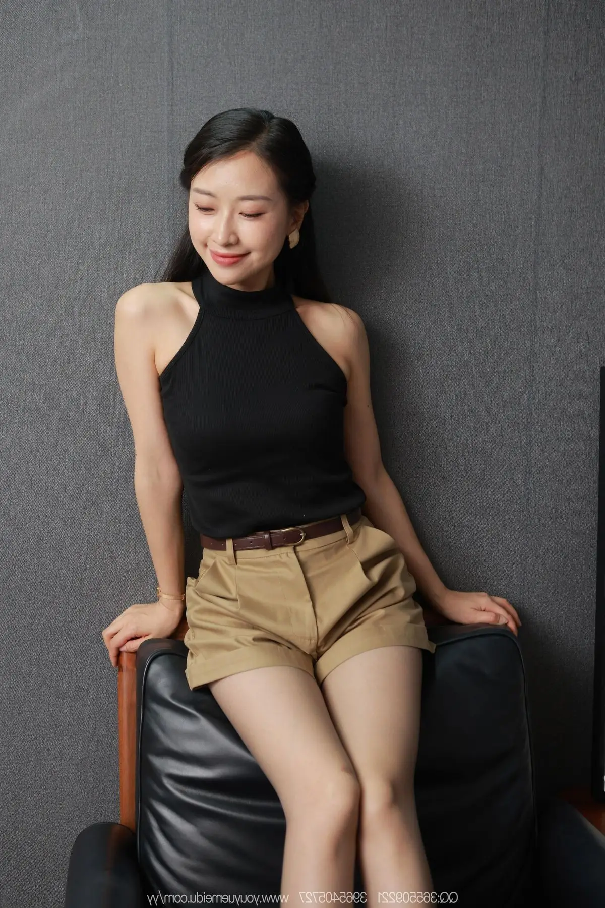 In this IESS SXJ No.2103 photoshoot, model Xiao Jie exudes an elegant charm and confident allure. She poses gracefully on a luxurious black leather armchair, dressed in a simple yet sophisticated ensemble: a chic black sleeveless top paired with stylish khaki shorts. Her long, slender legs are accentuated by fashionable high heels. A gentle gaze and subtle smile highlight her serene demeanor and professional grace. The minimalist modern setting further emphasizes Xiao Jie's natural beauty and captivating presence, creating artistic moments filled with emotion and timeless style.#IESS #XiaoJie #ChineseModel #ElegantStyle #FashionPhotography #OfficeLady #OL #Secretary
