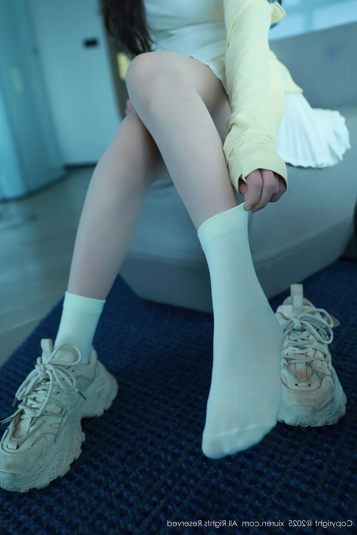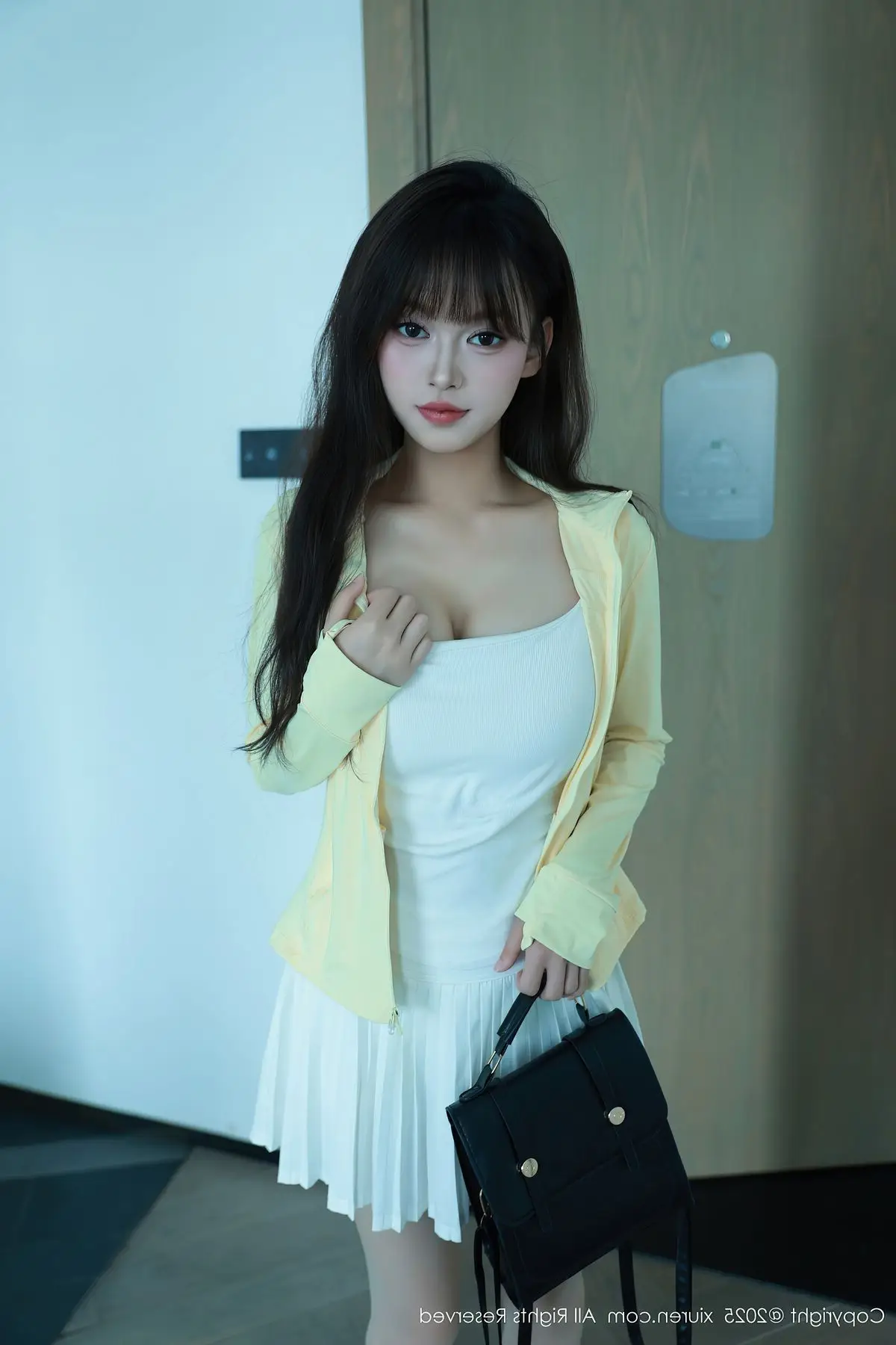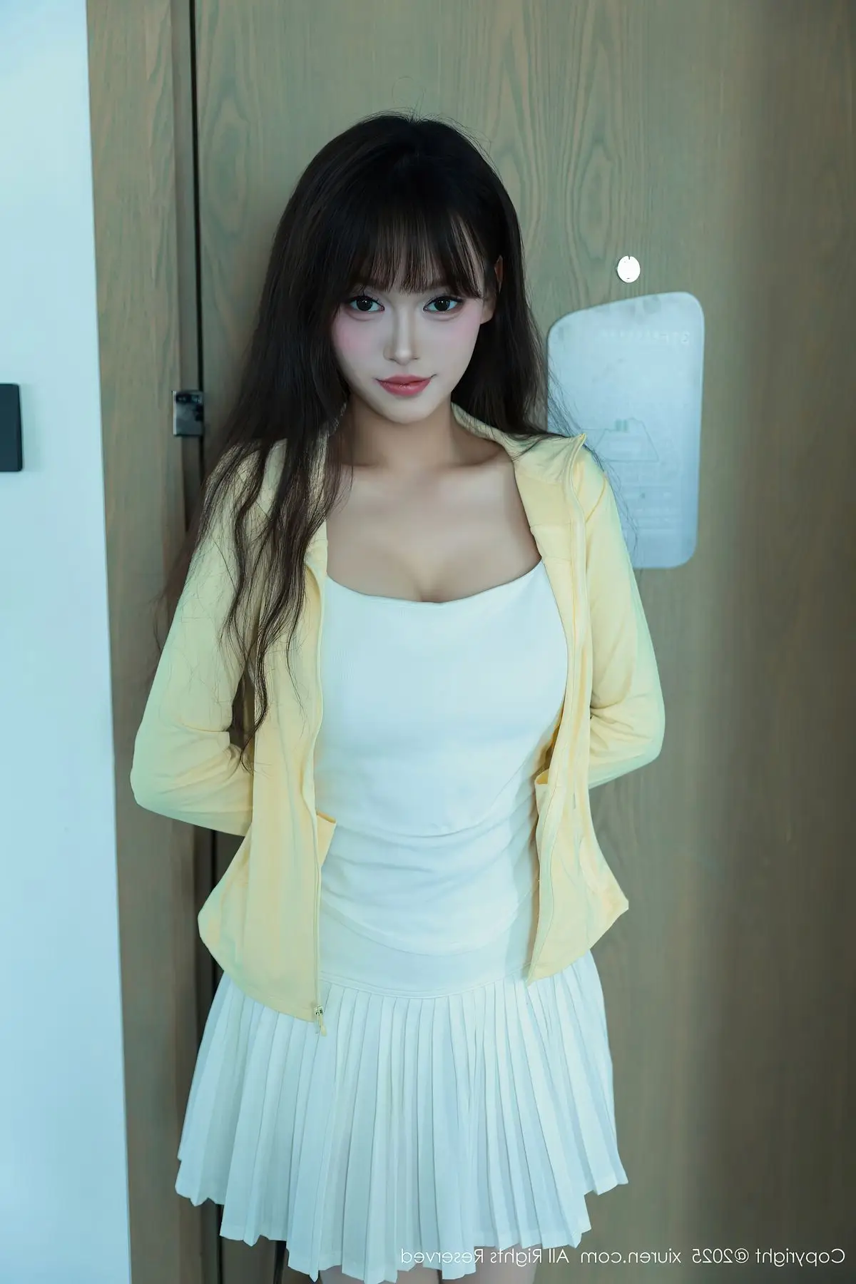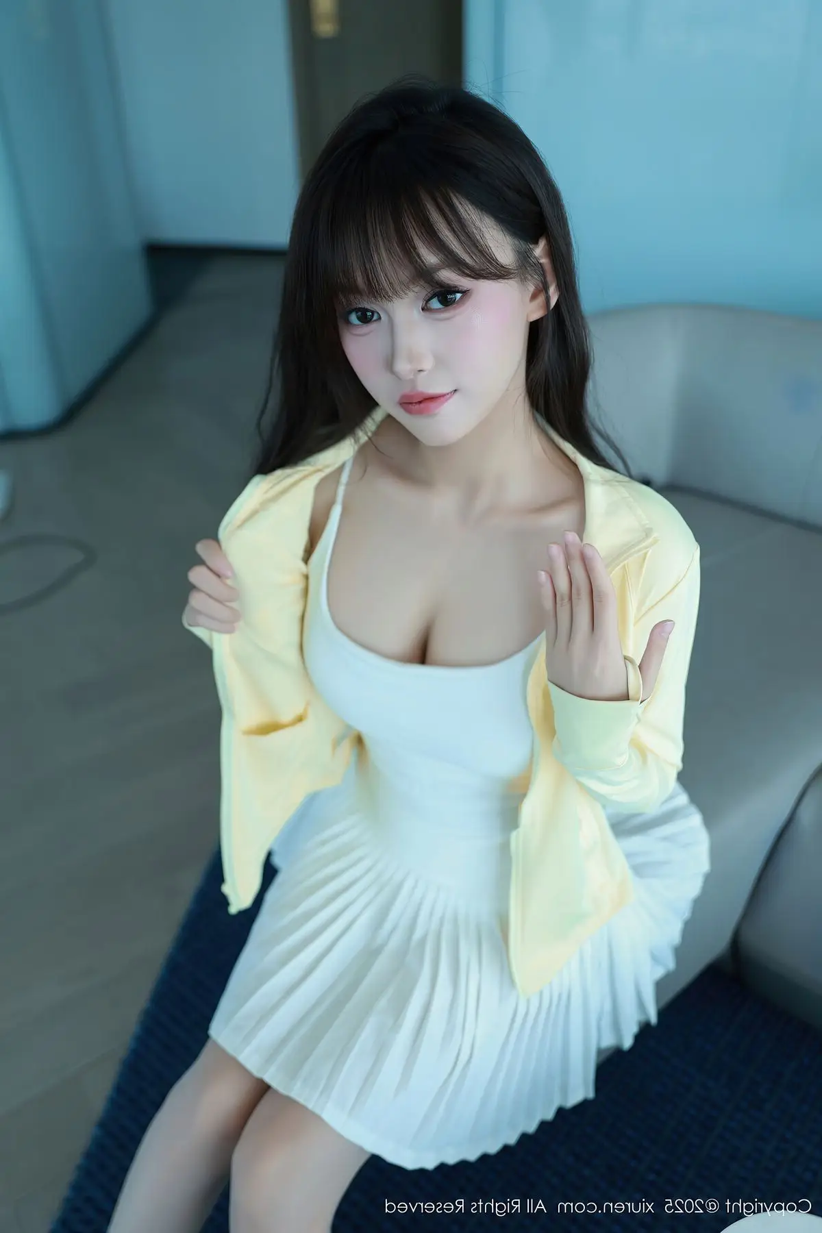 This captivating image features model Mei Zi from the SXJ No.2096 collection exuding elegant charm and allure She sits gracefully showcasing her slender figure in a vibrant yellow top paired with a pristine white mini-skirt Her long shapely legs and confident demeanor highlight her professional poise The indoor setting bathed in natural light beautifully illuminates her smooth skin and lustrous dark hair Mei Zi embodies a modern East Asian beauty a blend of sweetness and subtle sensuality that draws every gaze This photograph is part of a high-quality series offering an impressive visual experience of contemporary fashion and style